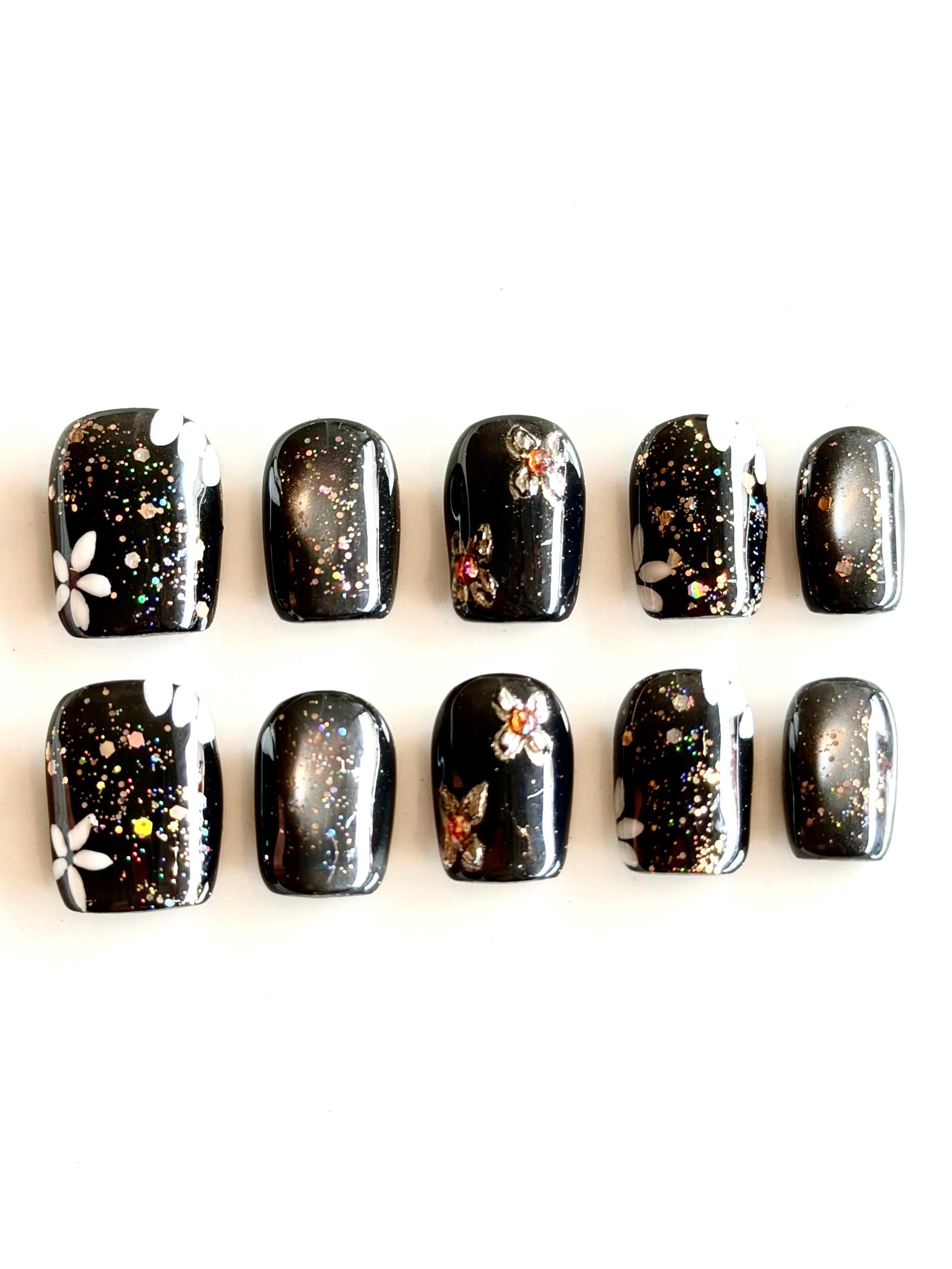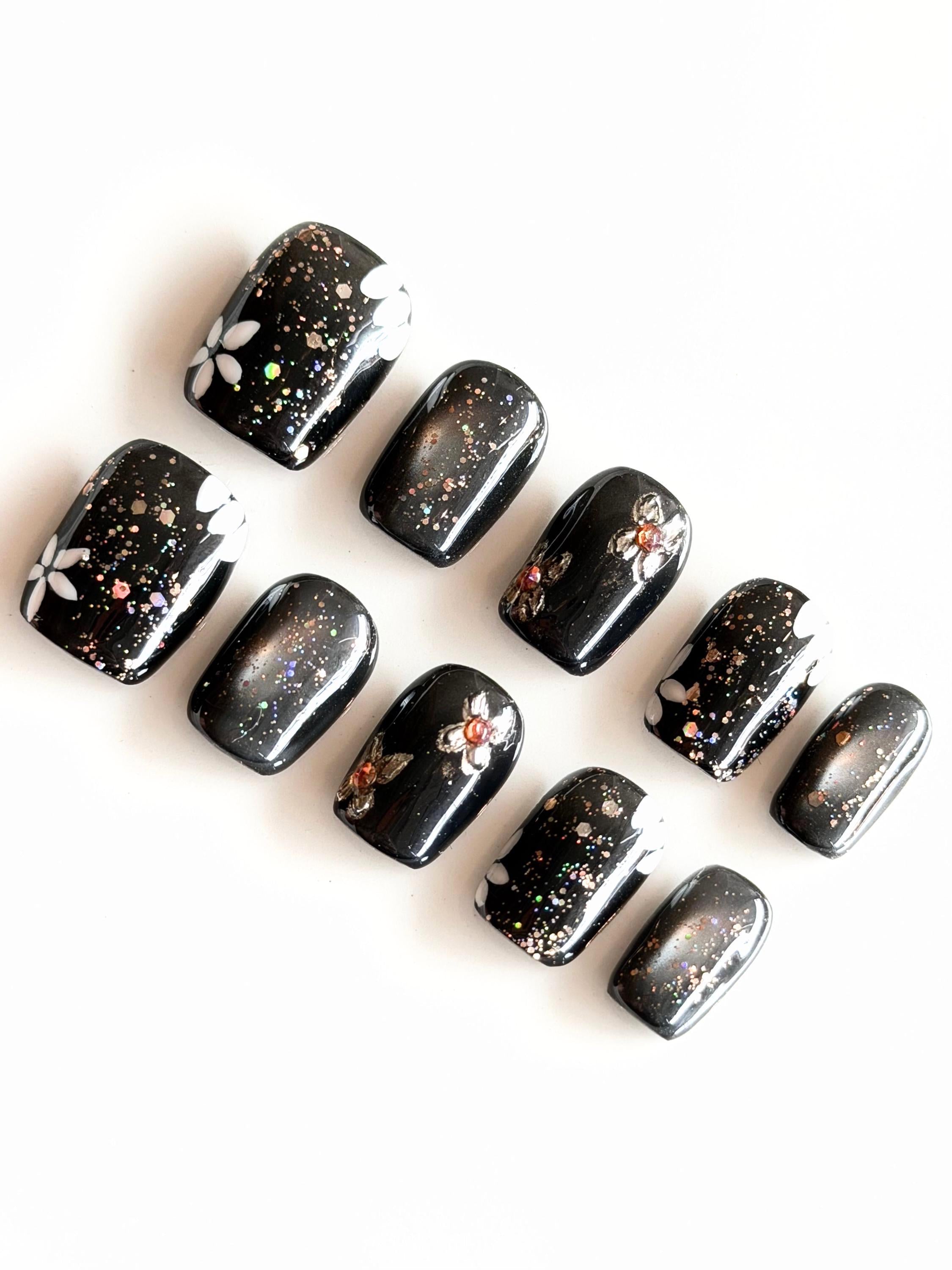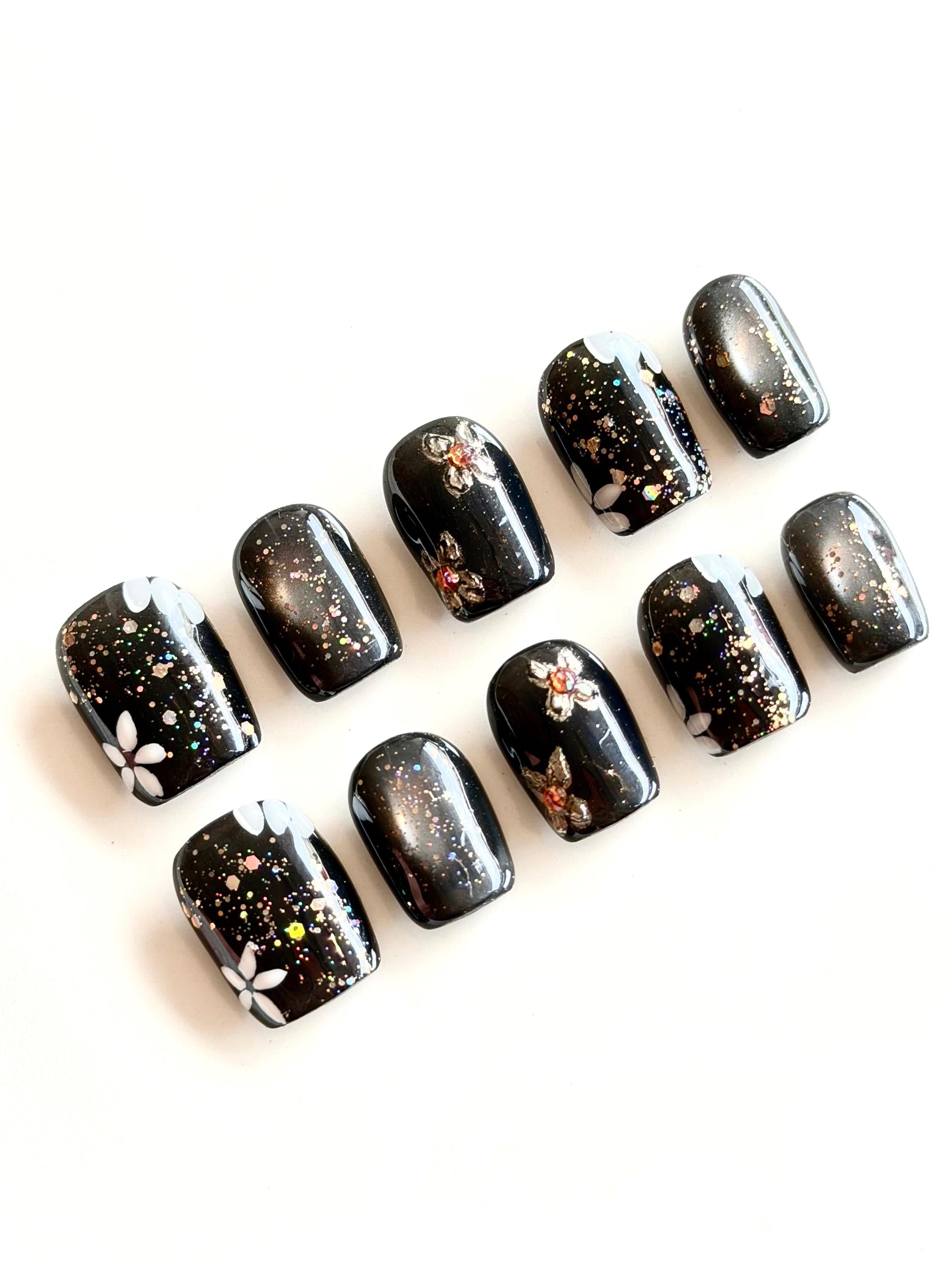 A festive night-sky manicure made for the holiday season. These glossy black nails are scattered with holographic confetti glitter, creating a sparkling, celebratory finish that catches the light beautifully. Accent nails feature delicate floral details—soft white petals and small metallic flower accents with warm amber centres—adding an elegant twist to the party-ready sparkle.