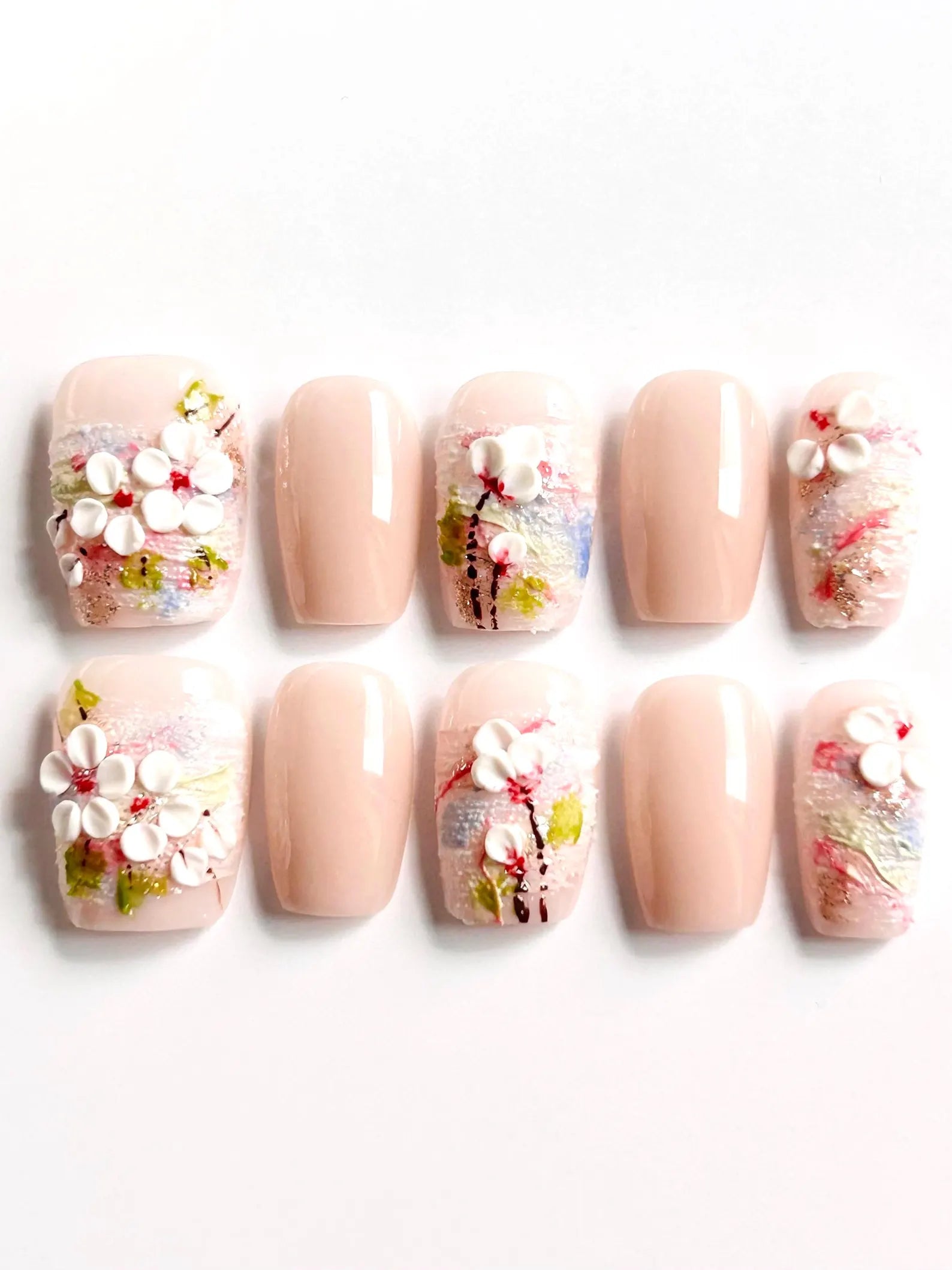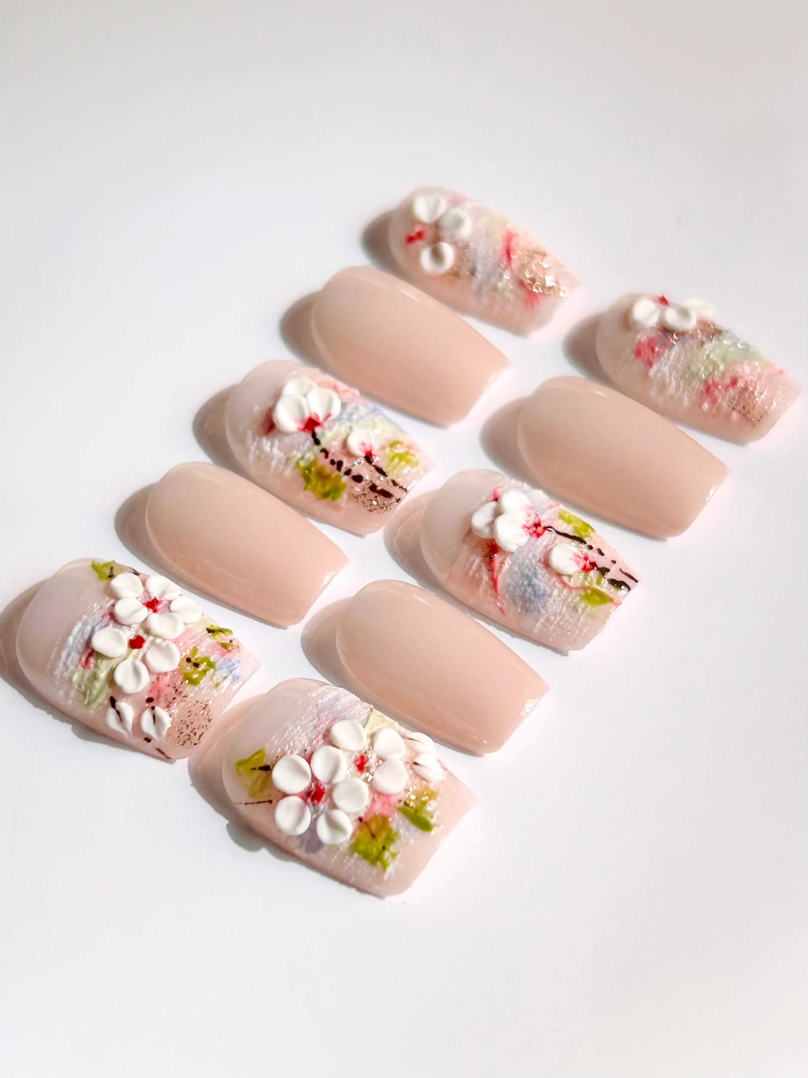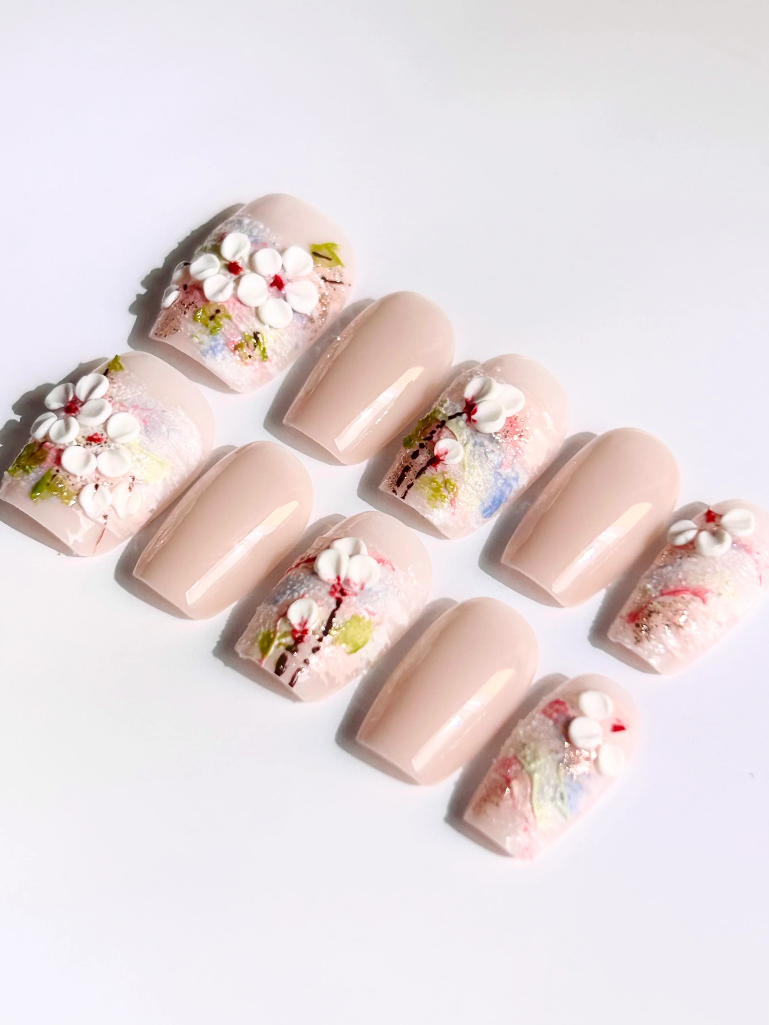 Let your nails bloom with Blush Garden —a soft nude set with 3D white flowers and hand-painted textured details. These floral press-on nails bring a delicate, garden-inspired vibe with touches of pastel and metallic brushstrokes for a dreamy finish.