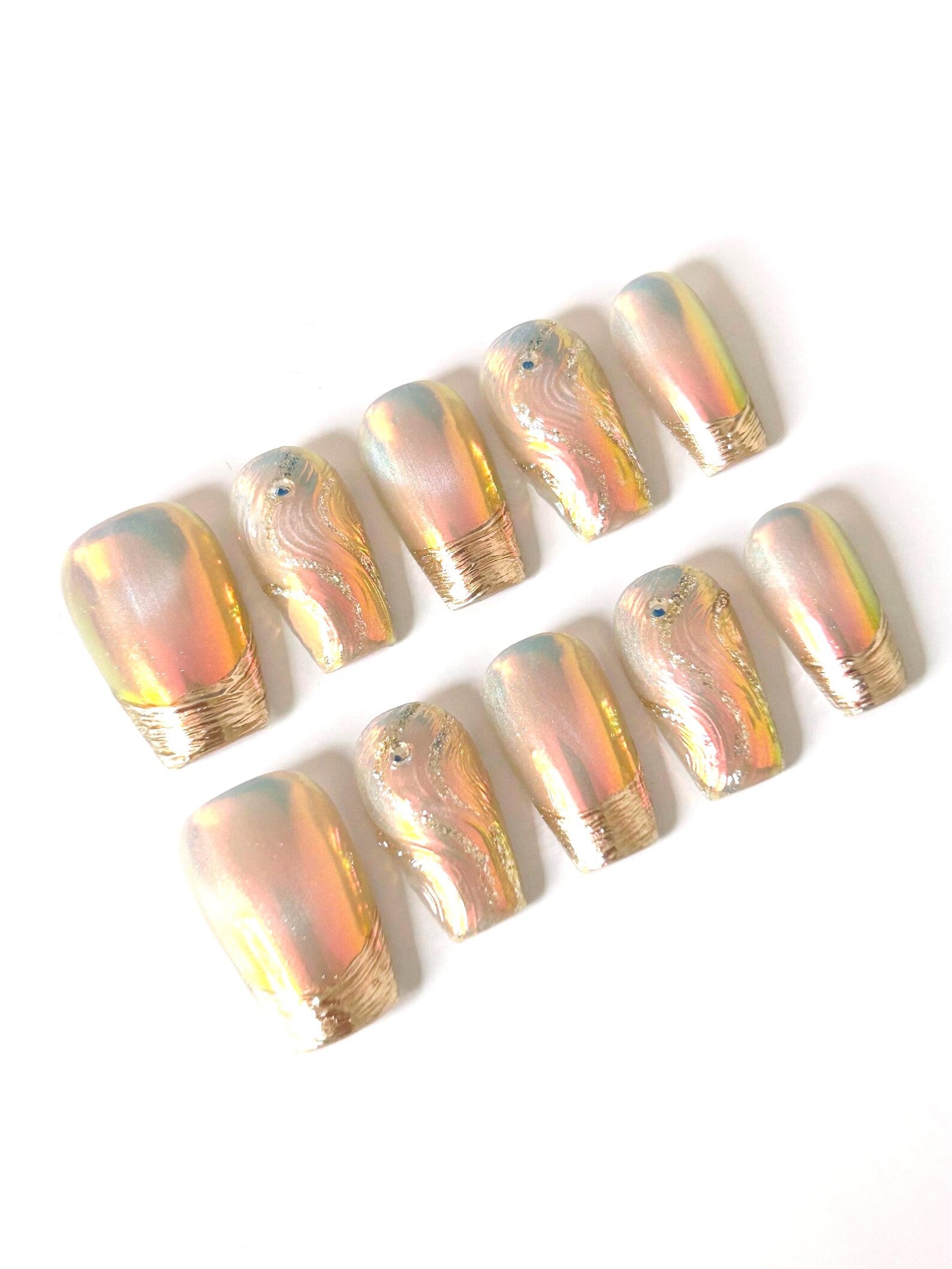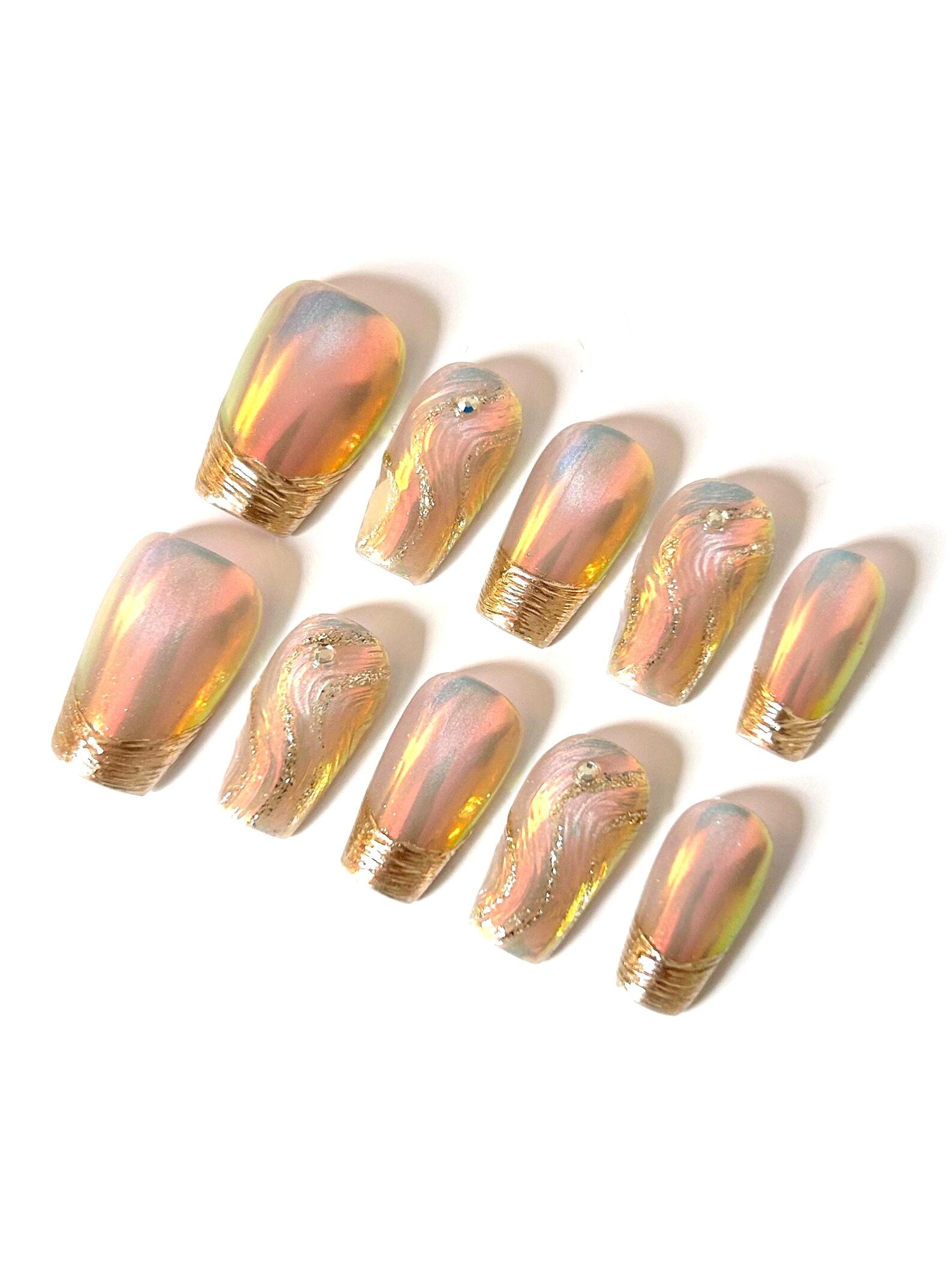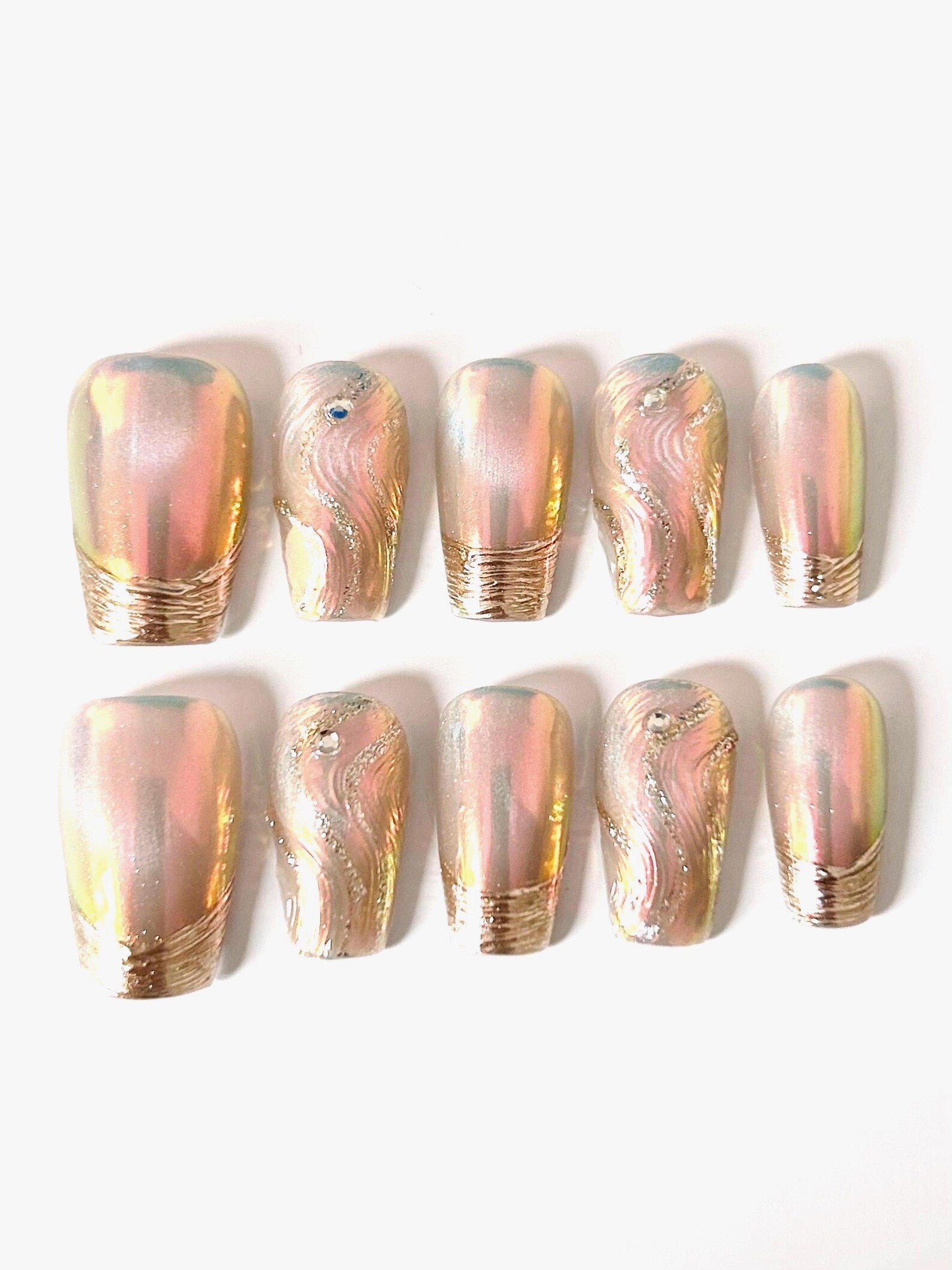 Luminous and luxe for the holiday season. A champagne-pink iridescent chrome base glows under festive lights, finished with sculpted gold textured tips. Raised wavy swirls traced in micro-glitter add dimension, while delicate crystal accents (including a subtle blue stone on one nail) bring just-right sparkle. A chic, party-ready manicure that feels like jewelry.