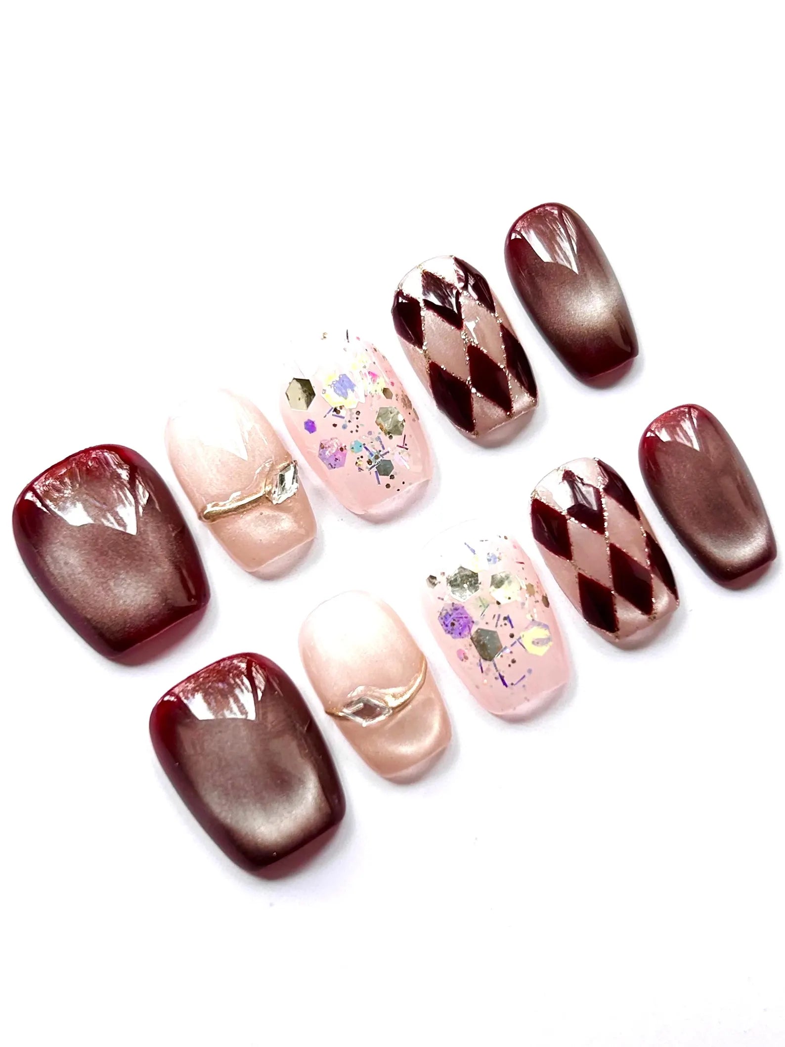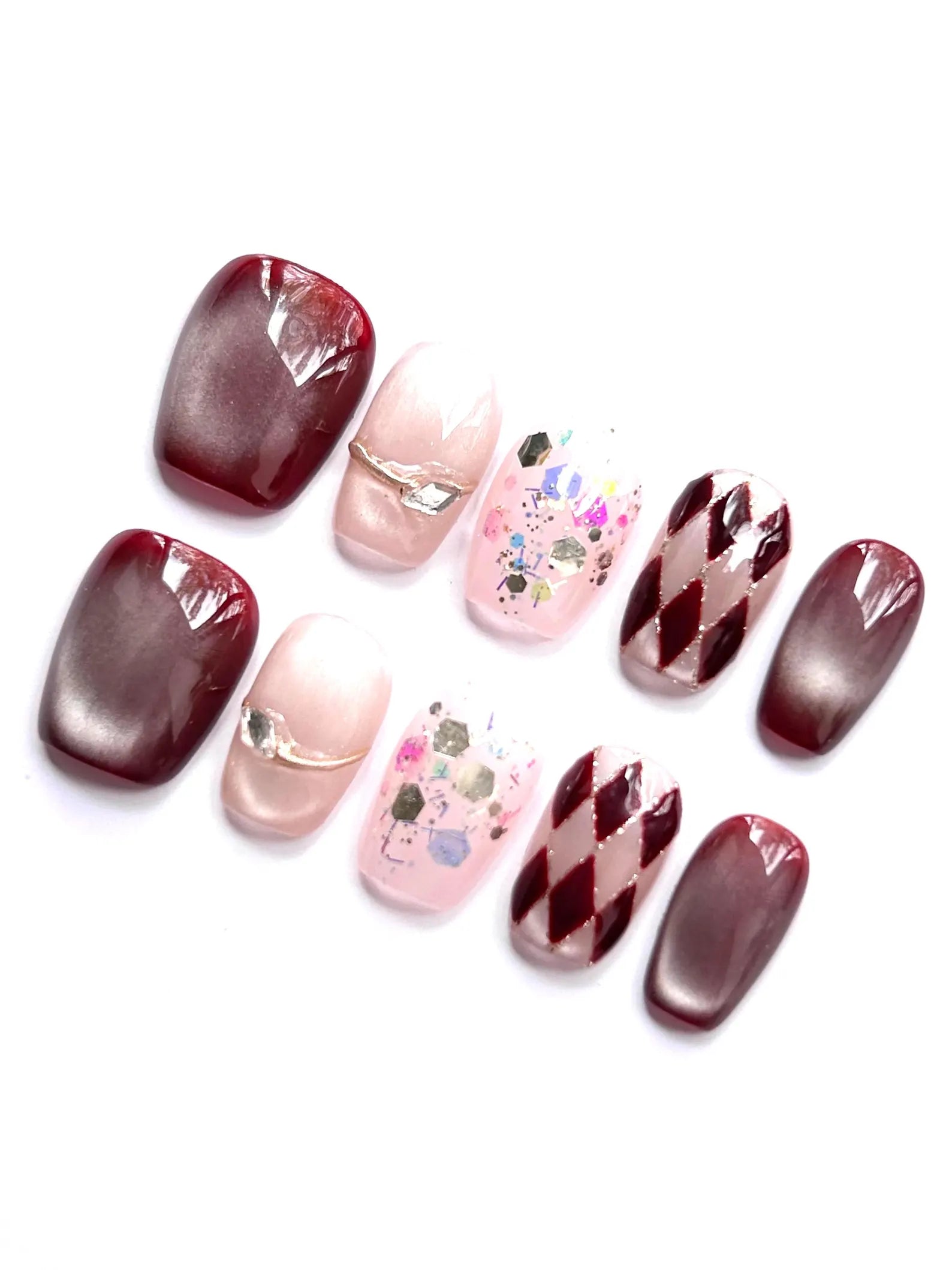 A bold mix of burgundy cat-eye shimmer, soft pink, confetti glitter, and harlequin diamonds. Silver accents complete the party-ready look.