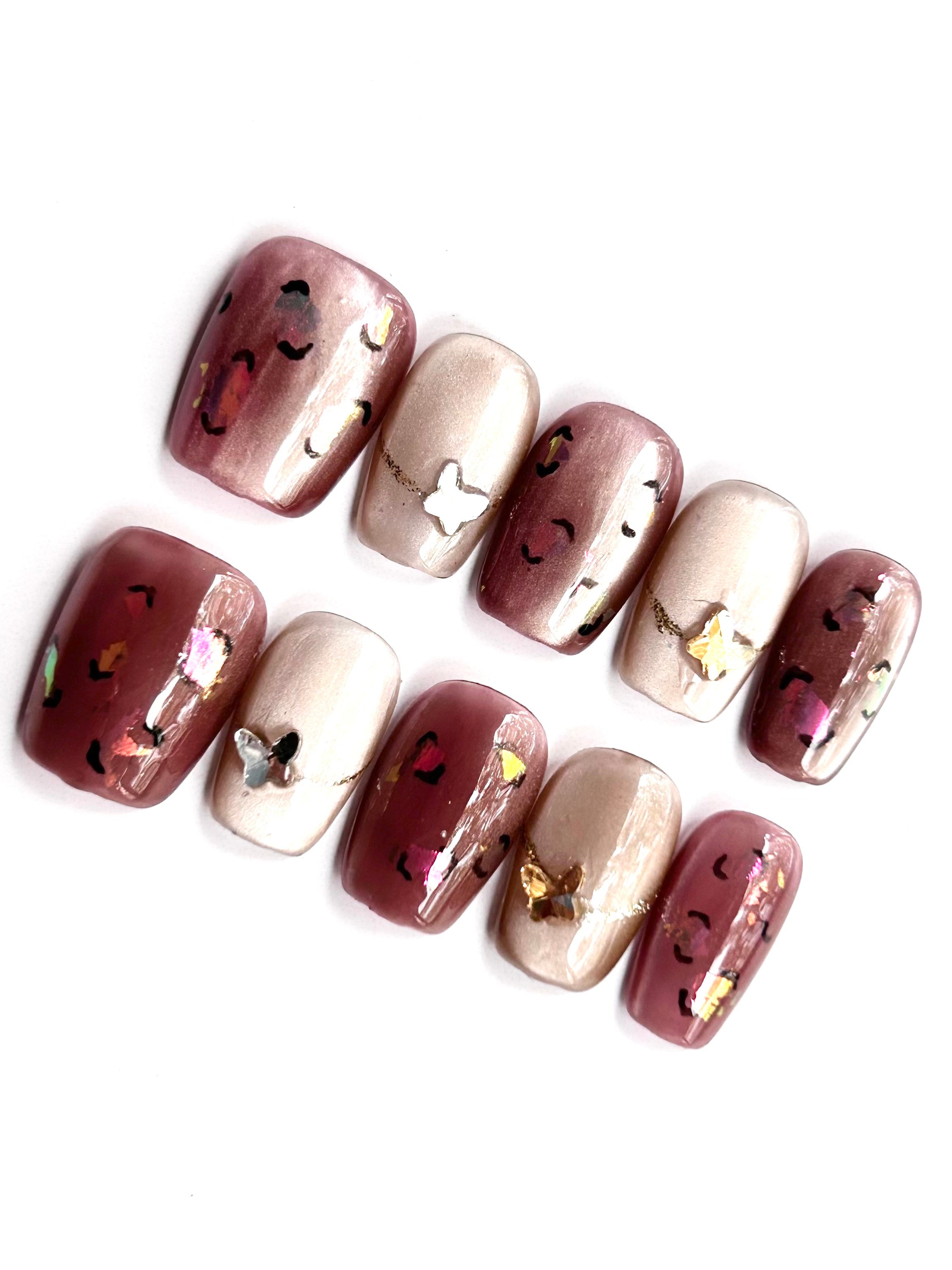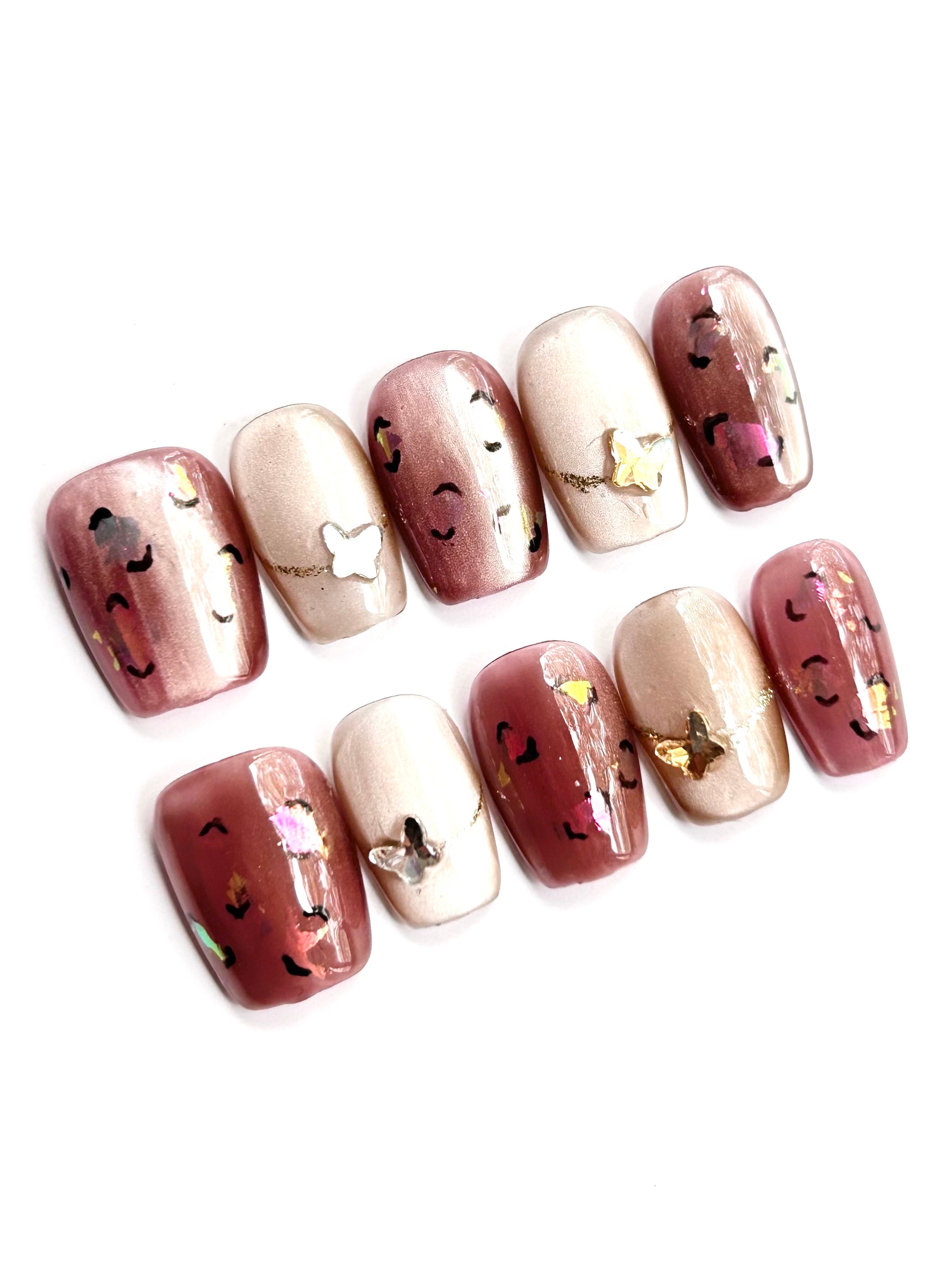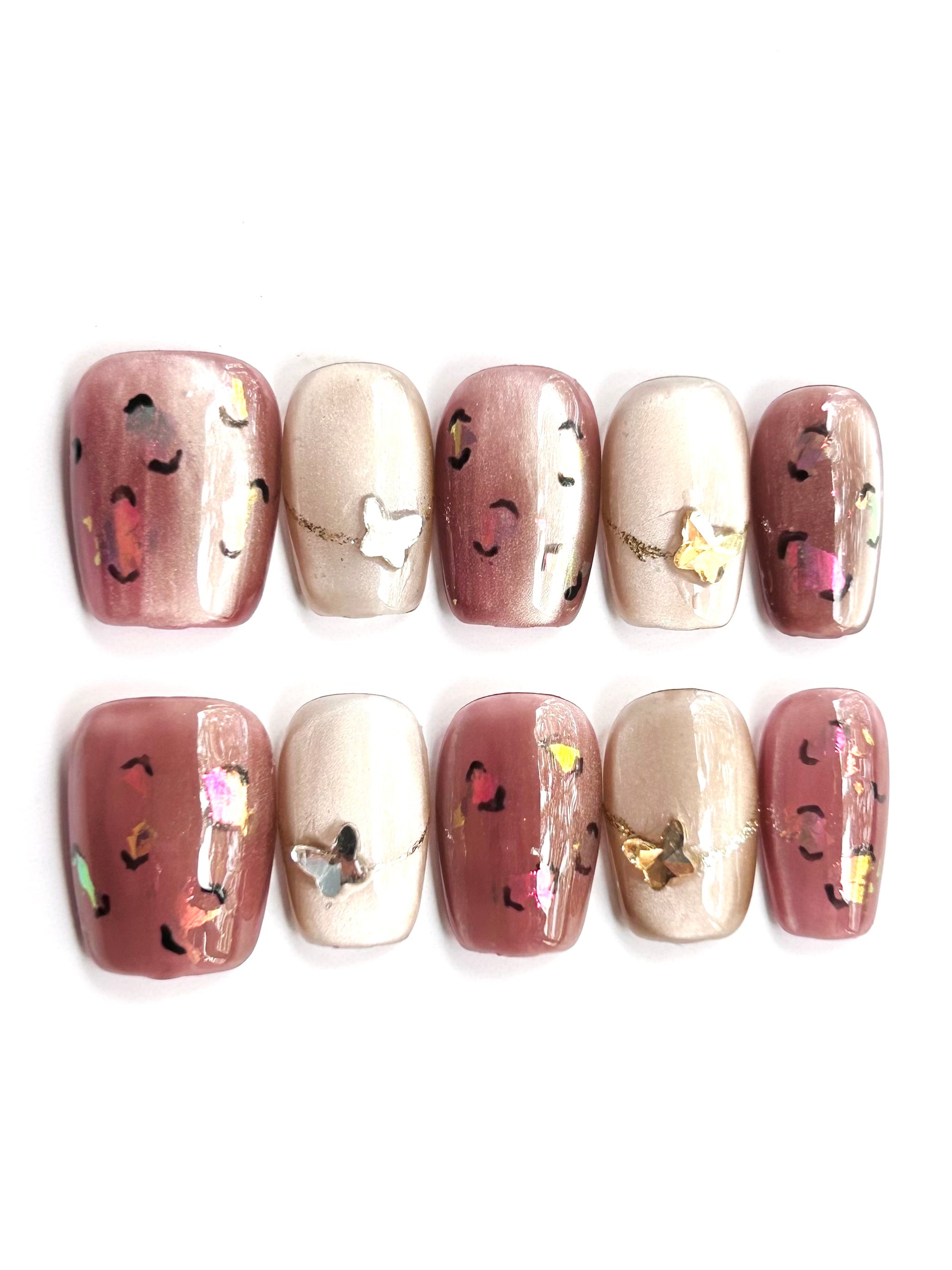 Soft nude and mauve bases detailed with Y2K metallic butterflies, iridescent foils, and fine glitter—playful sparkle for festive season outfits.