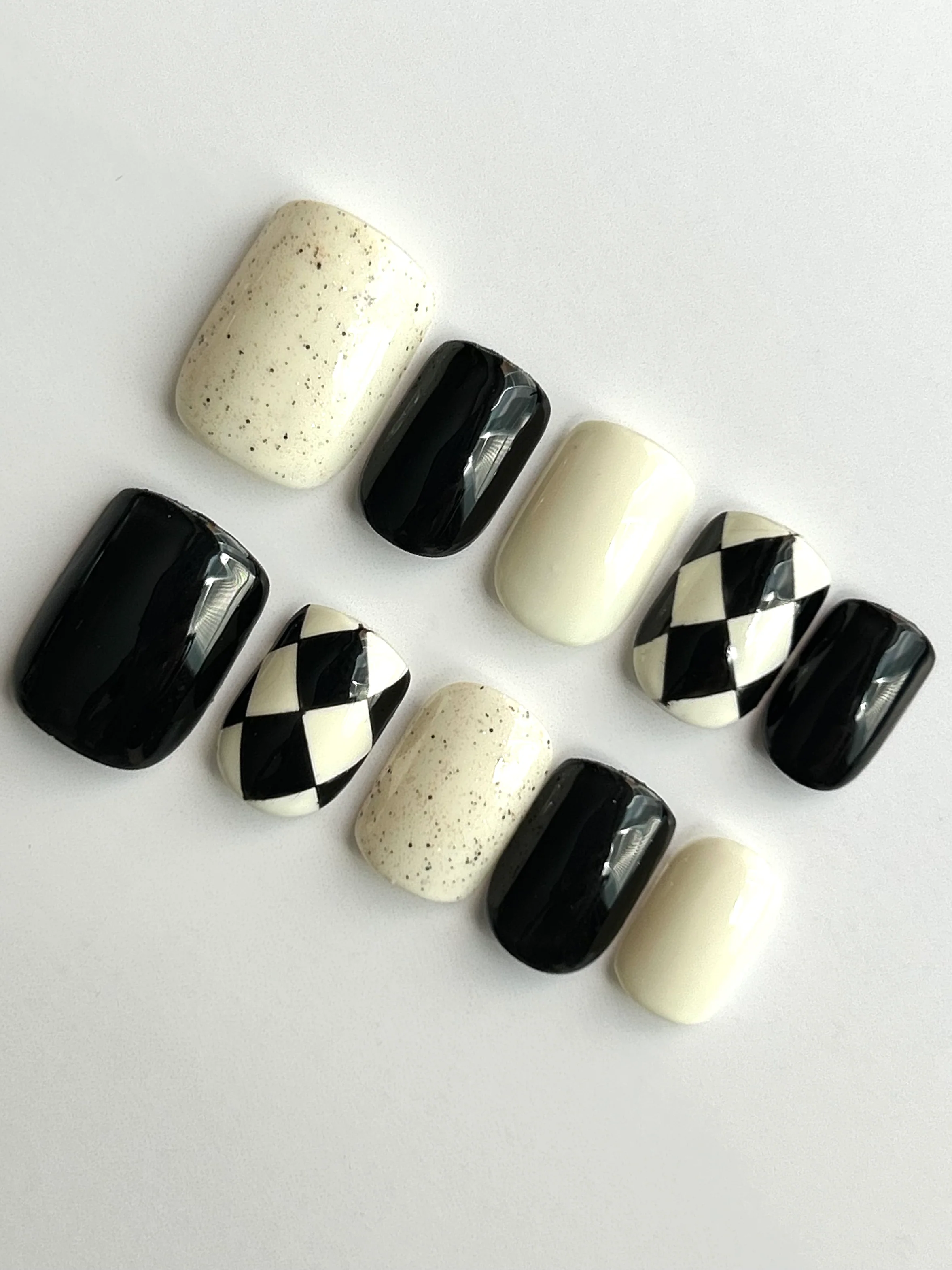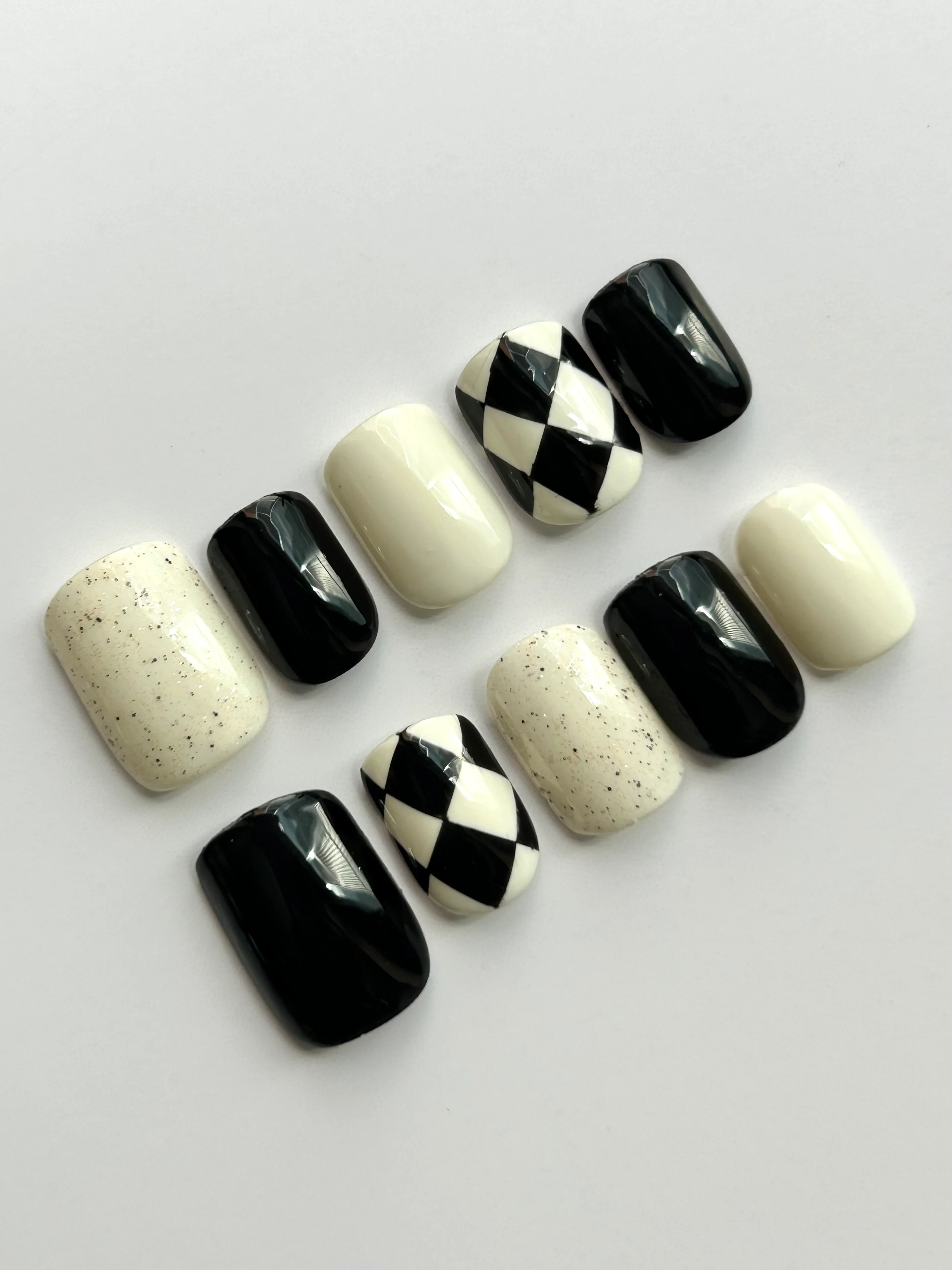 Add edge to your fingertips with Checker Chic—a monochrome press-on nail set featuring bold black-and-white blocks, speckled ivory accents, and classic harlequin diamonds. This short square shape is sleek, modern, and versatile.