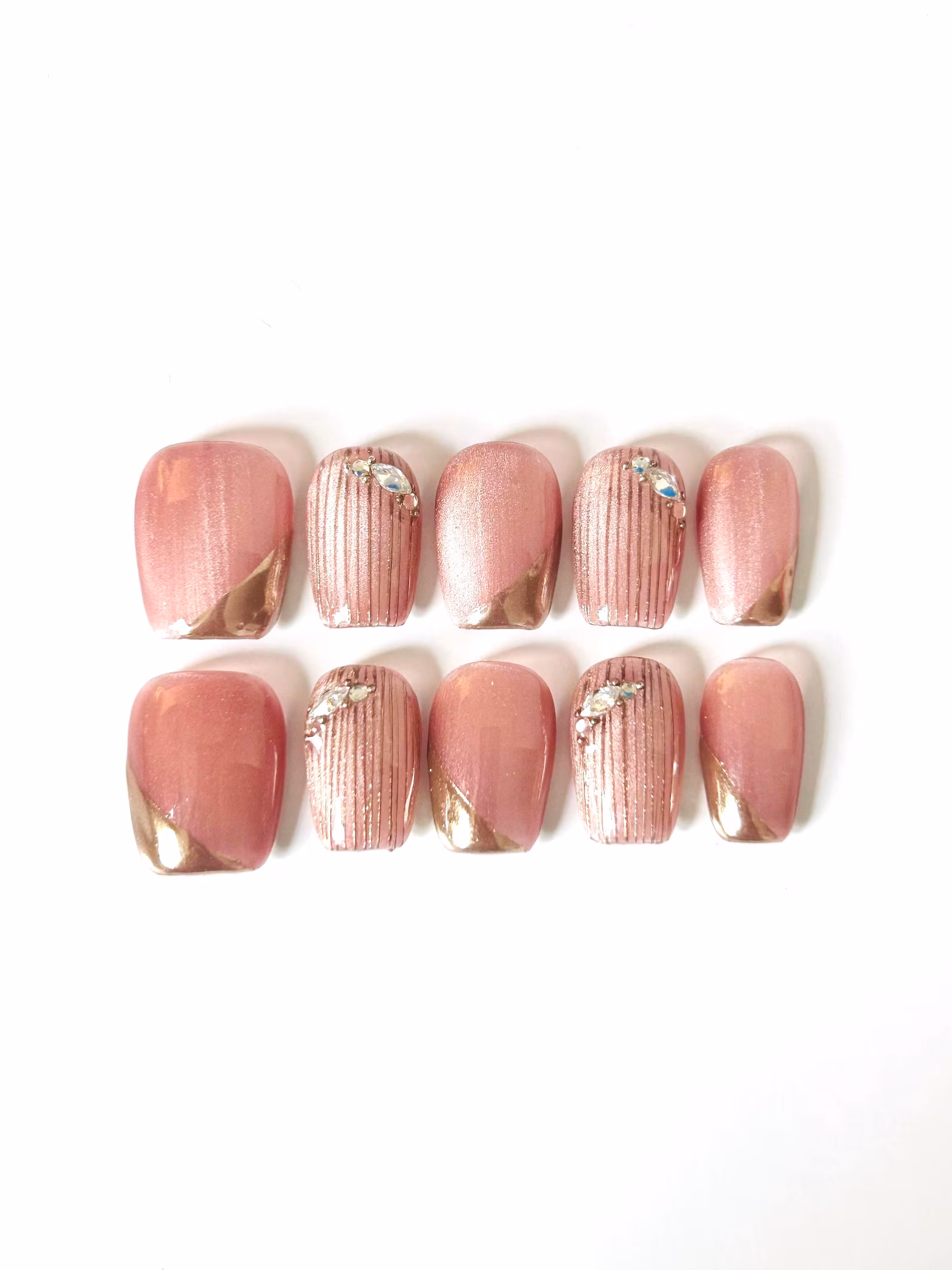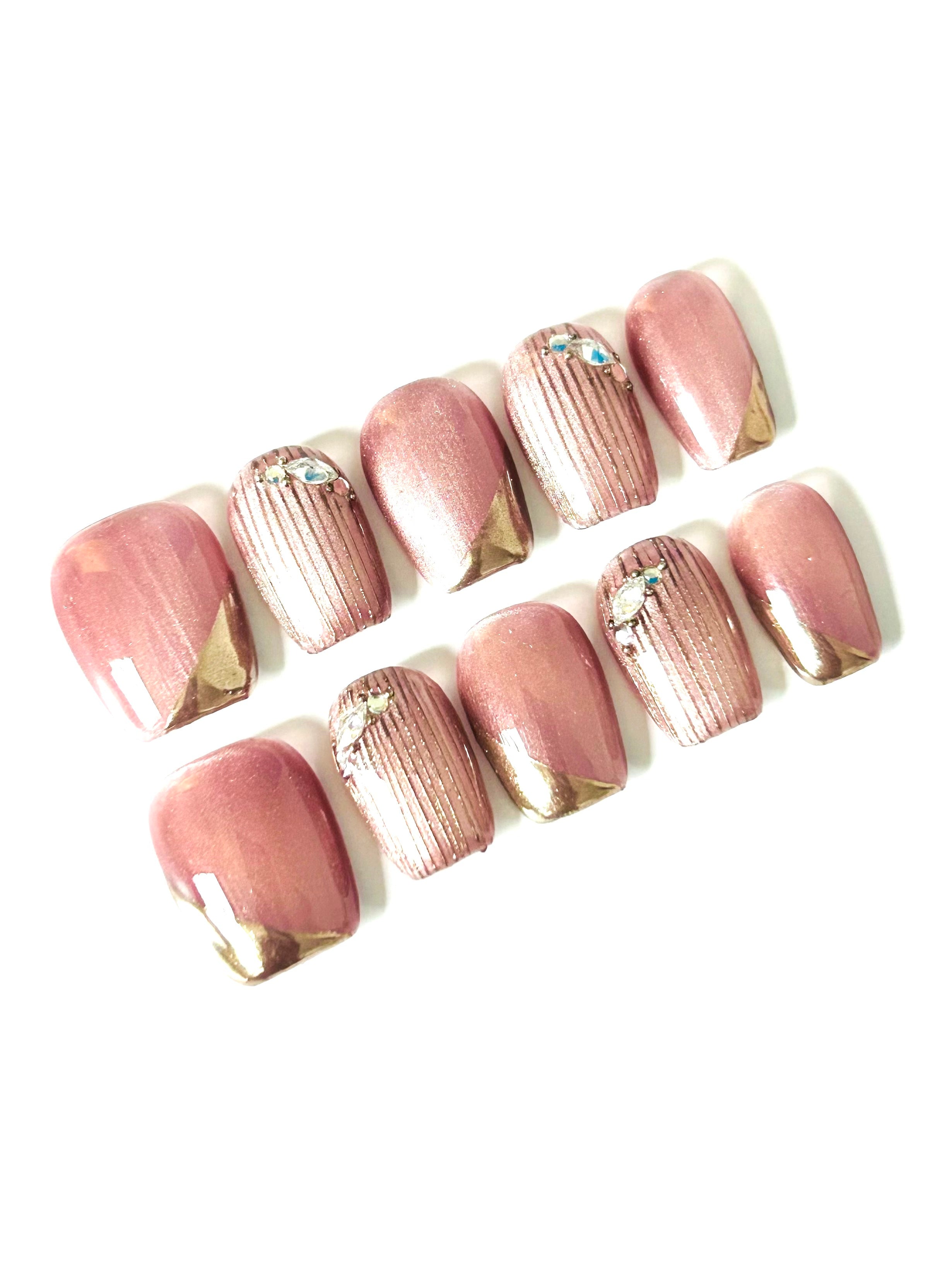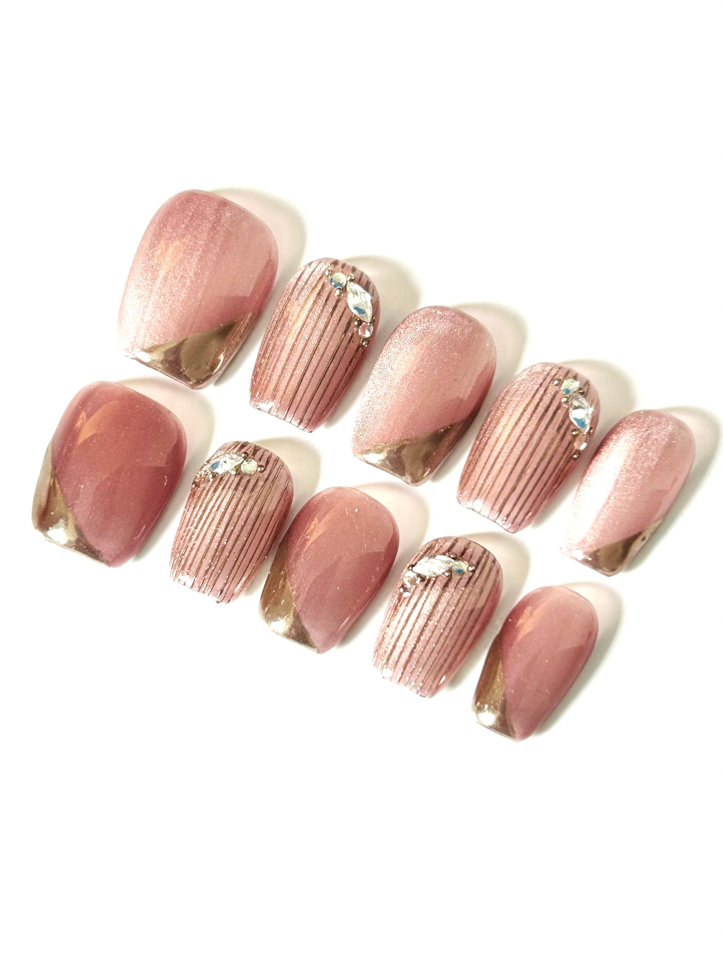 A chic mauve cat-eye base accented with rose gold chrome tips, vertical metallic striping, and sparkling rhinestones. These nails combine warmth with shine, perfect for festive nights.
