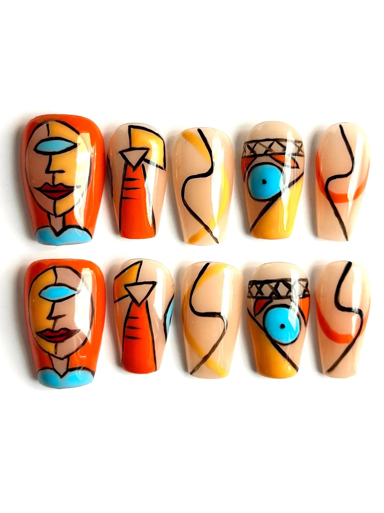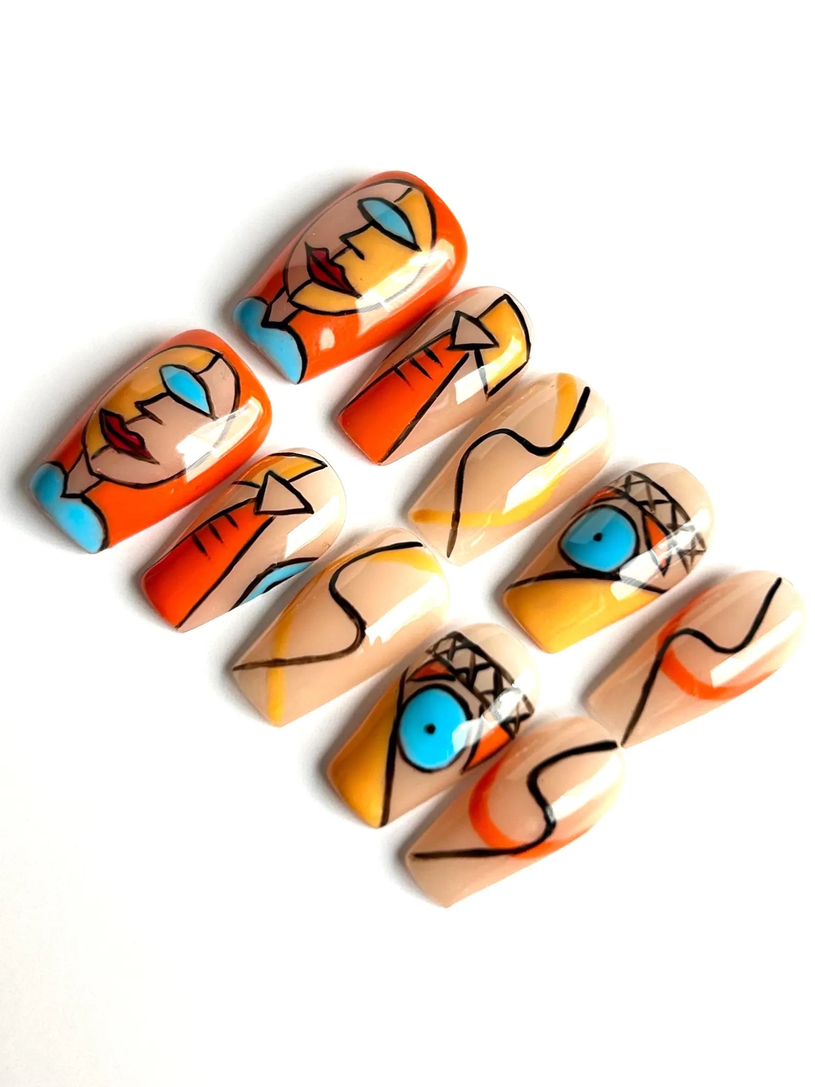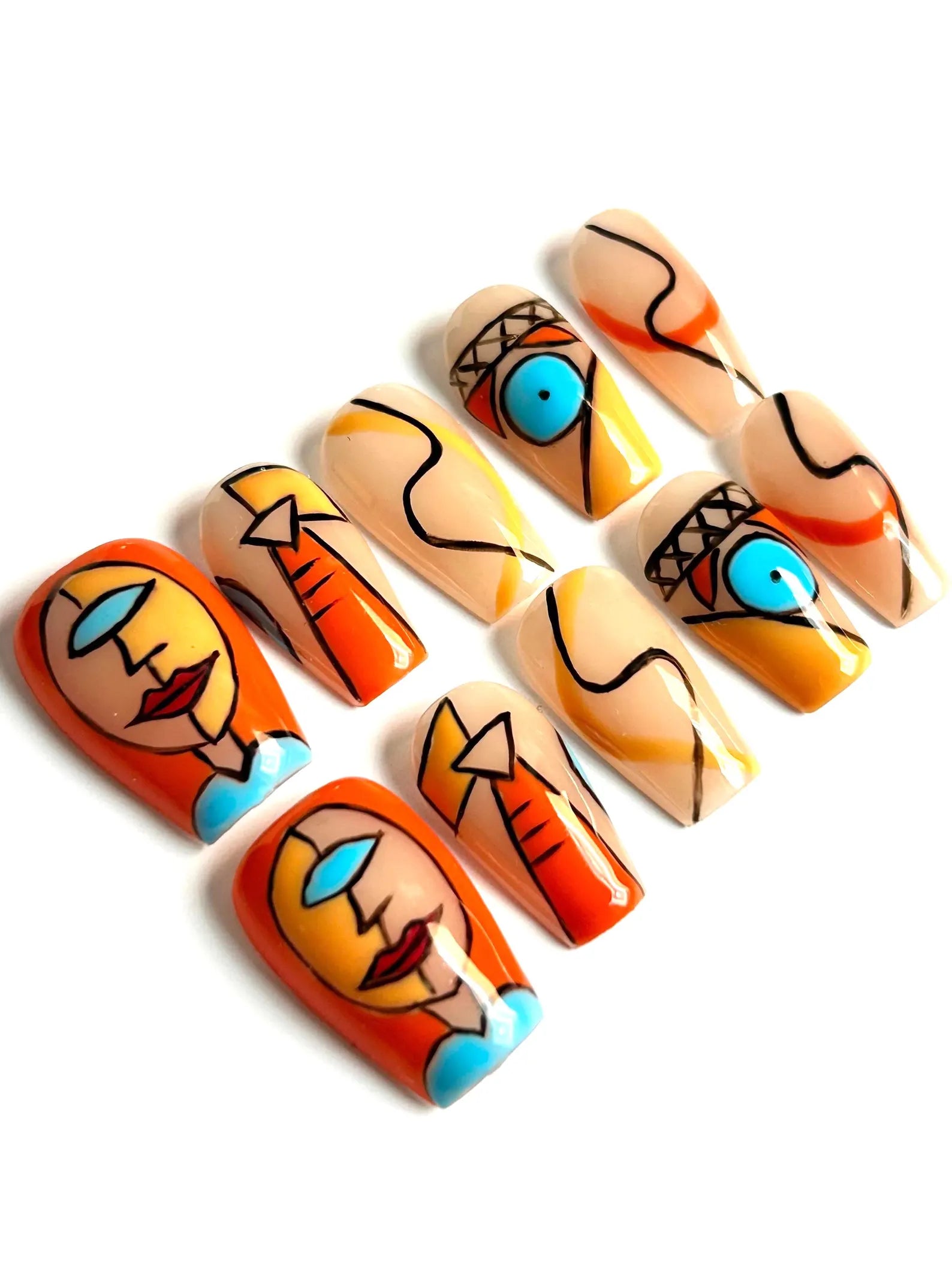 Add artistry to your fingertips with Abstract Muse—a bold press-on nail set featuring abstract face art, vibrant color blocking, and modern linework. This medium coffin shape turns your nails into wearable art.