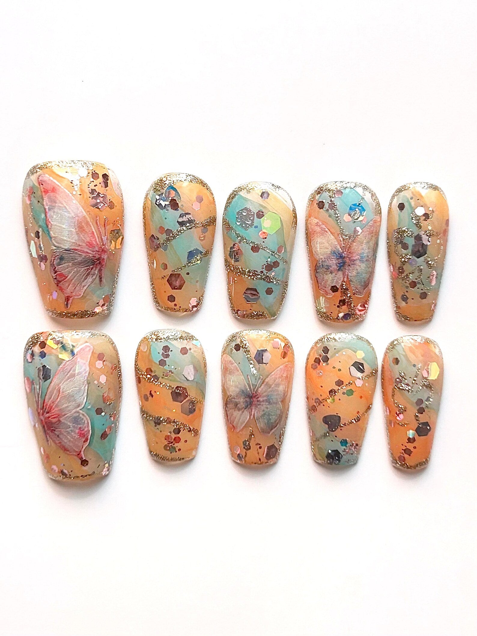 Add magic to your fingertips with Garden Flutter—a nude press-on nail set featuring soft watercolor butterflies, pastel splashes, and glittering confetti accents. This Medium Coffin shape brings a dreamy, whimsical vibe.