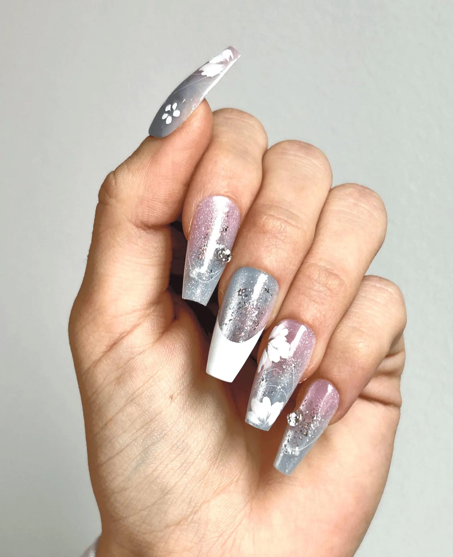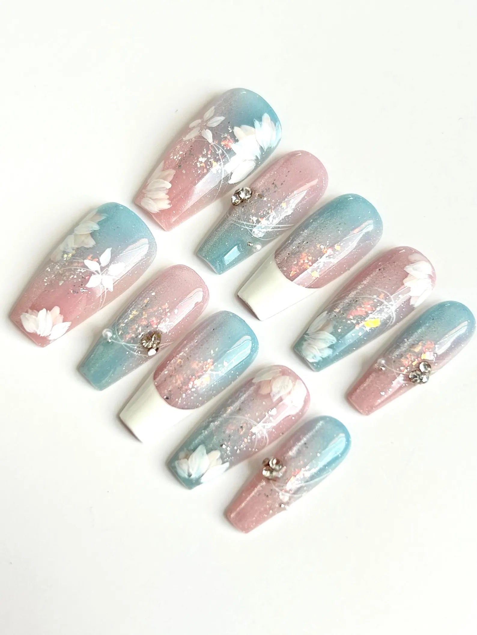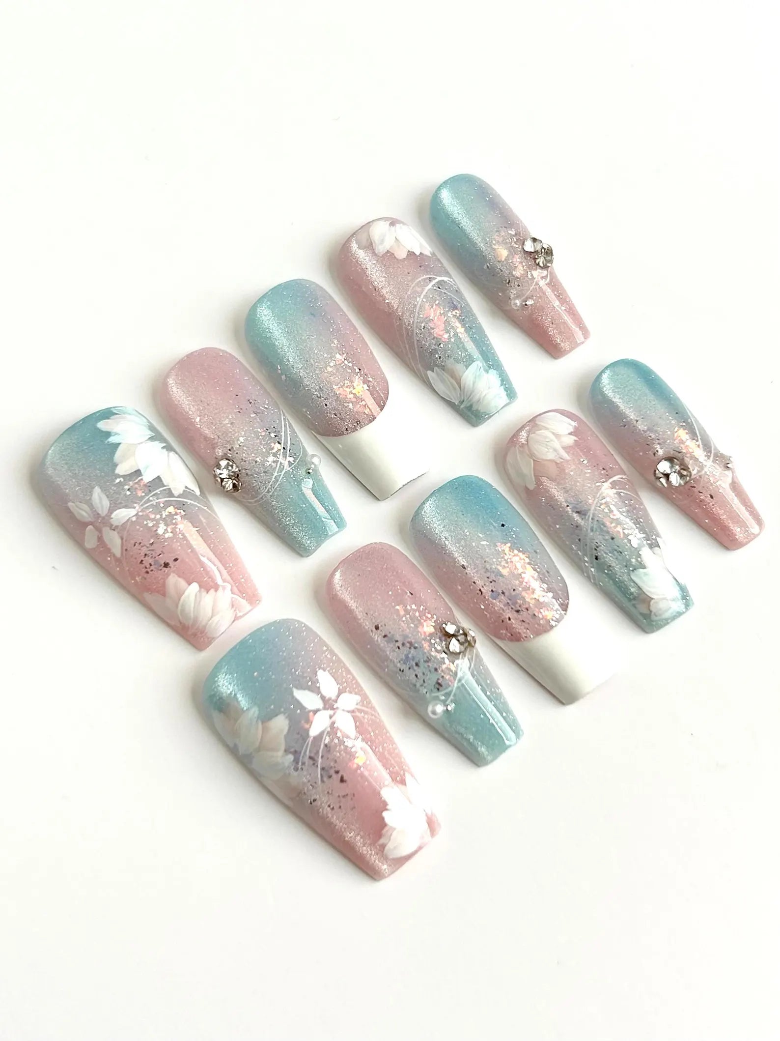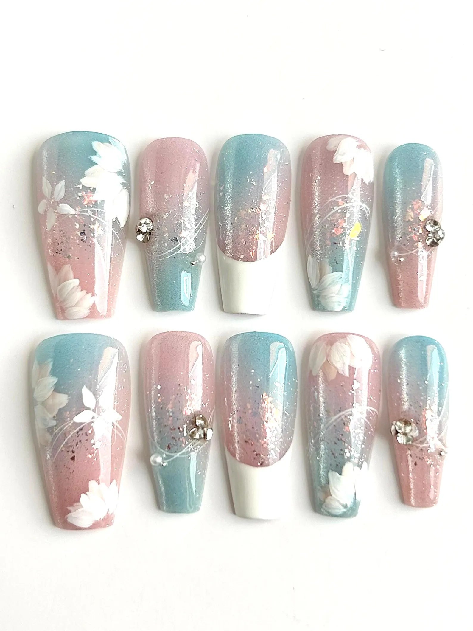 Frosted Bloom brings together pastel pink and blue ombré tones, delicate hand-painted florals, and glitter for a soft, dreamy finish. With subtle sparkle and 3D gems, this floral press-on nail set blends sweet elegance with a fresh, modern twist.