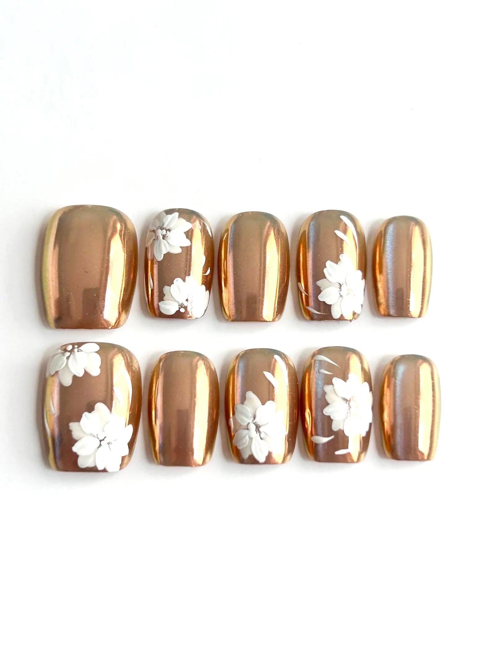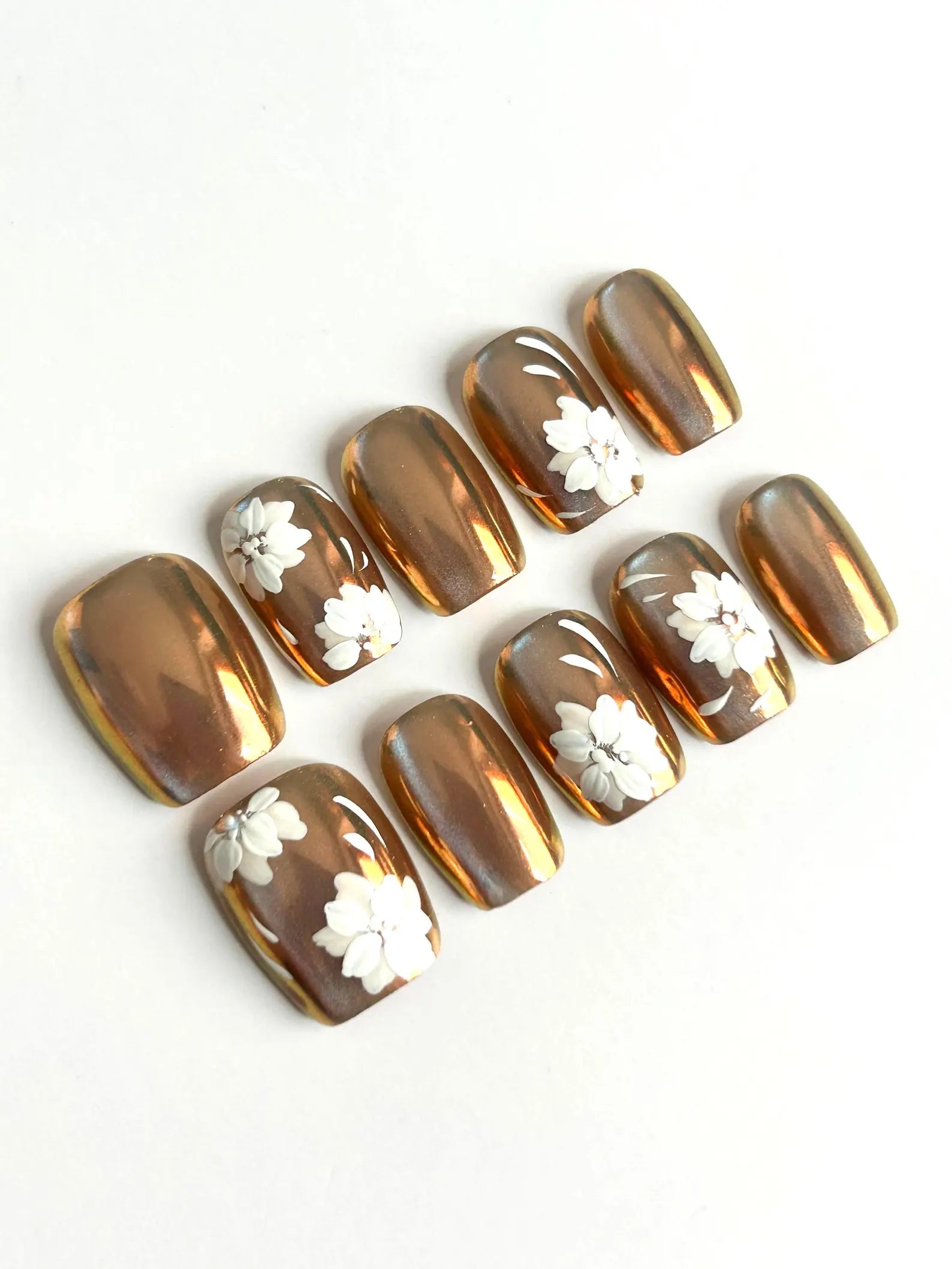 Glazed Petals is a short and glossy chrome press-on nail set with a golden-bronze mirror finish. Featuring 3D white flower accents and a touch of shimmer, this design is both bold and wearable—perfect for mixing shine with soft floral detail.