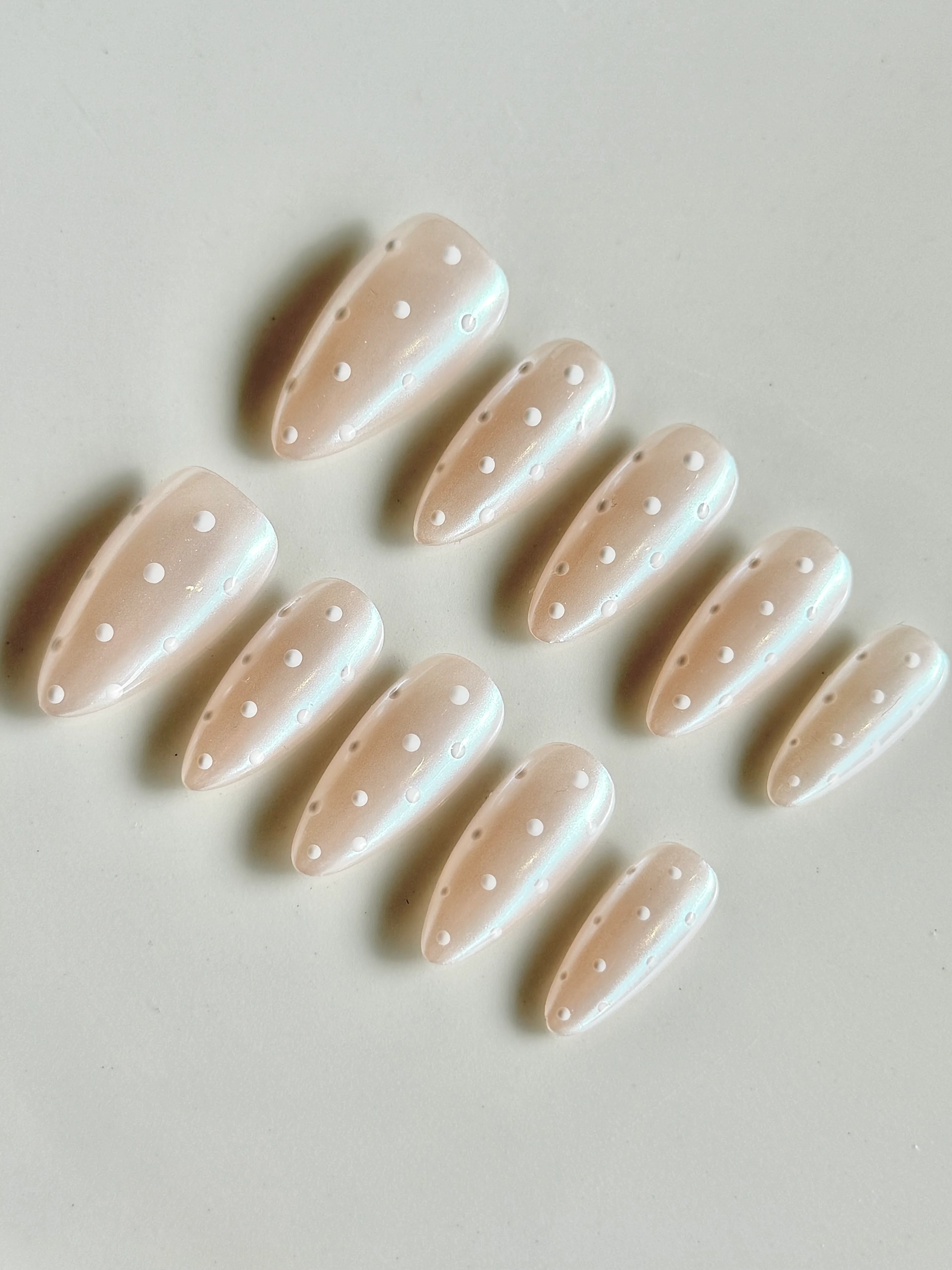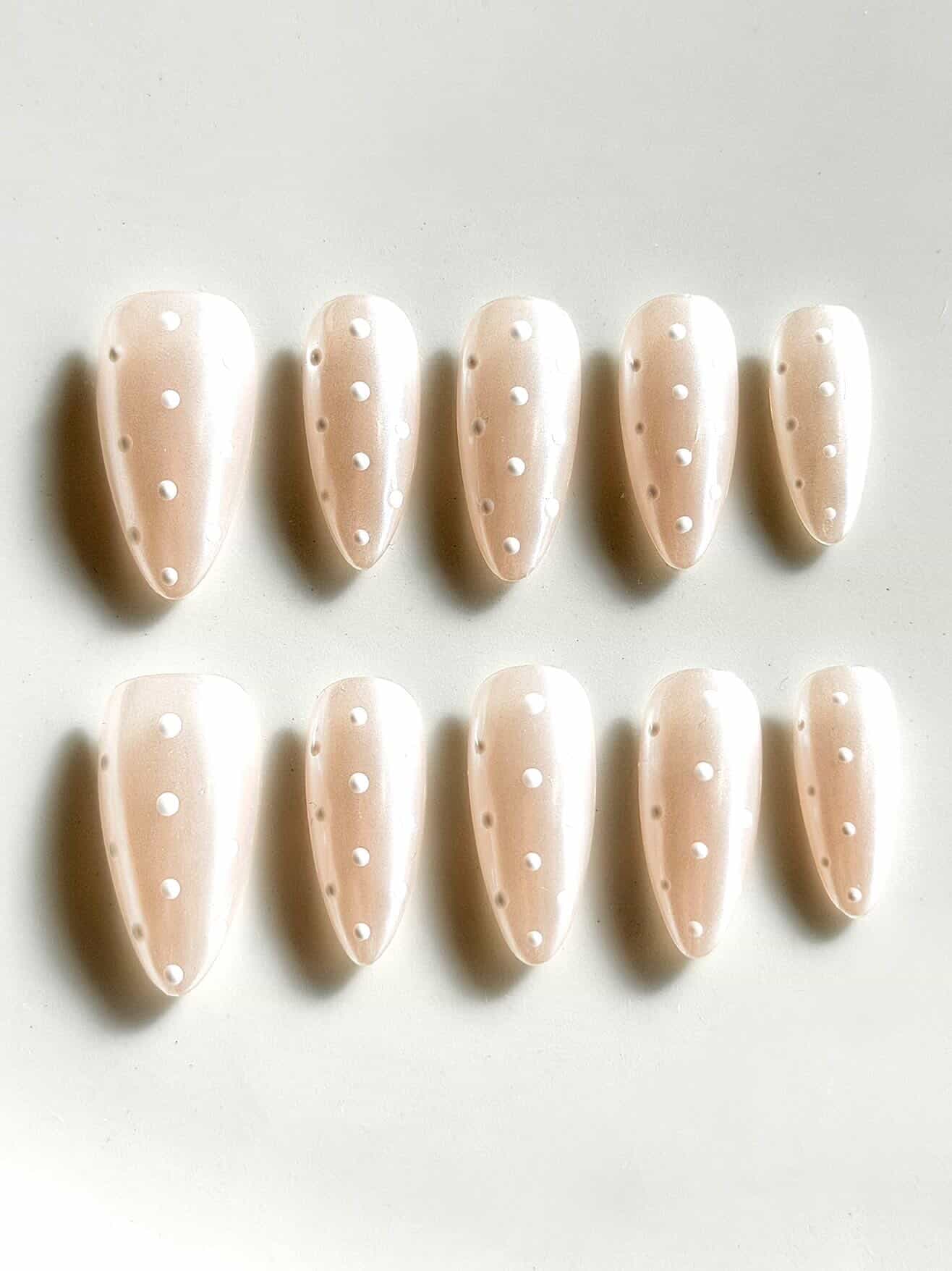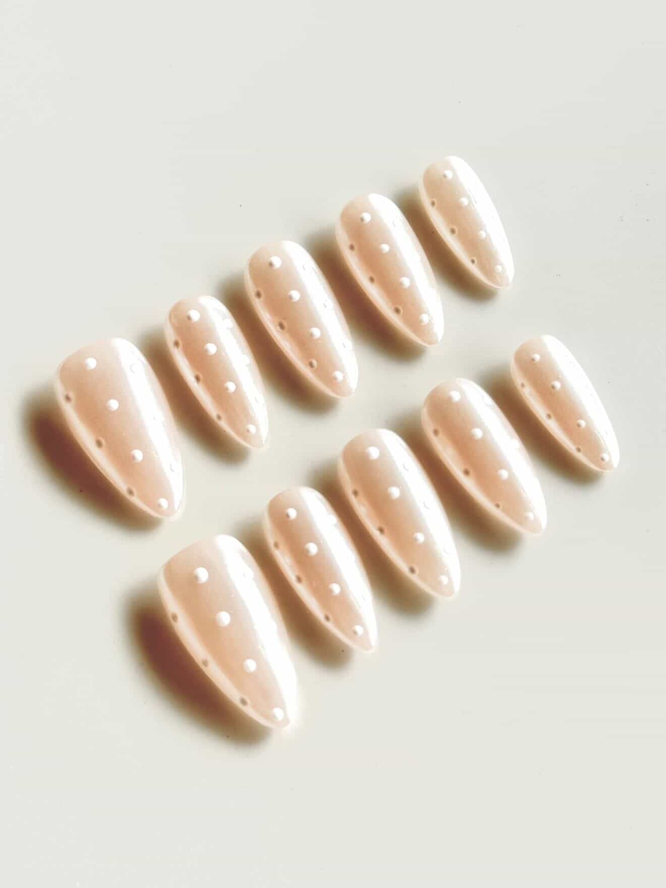 Soft, minimalist, and effortlessly chic for the season. This set features a pearly nude base with a luminous sheen, finished with clean white polka dot detailing for a subtle statement. The almond shape elongates the fingers while keeping the look refined—perfect for cosy fall outfits and understated holiday styling.