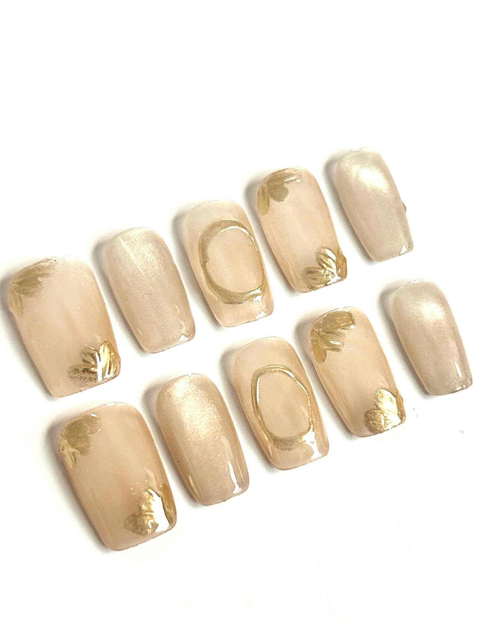 Add glow to your fingertips with Golden Aura—a sheer nude press-on nail set featuring metallic rings, golden accents, and soft translucent finishes.