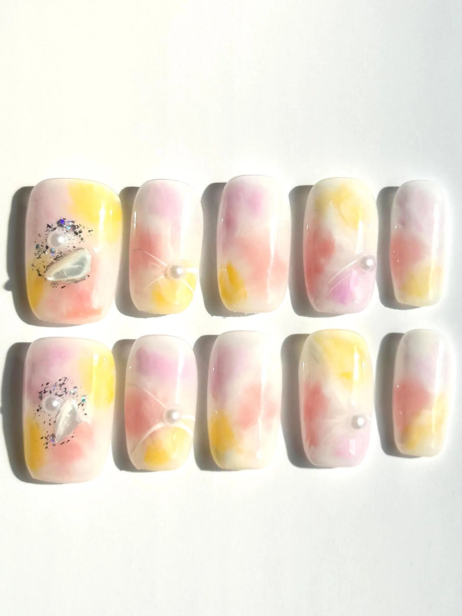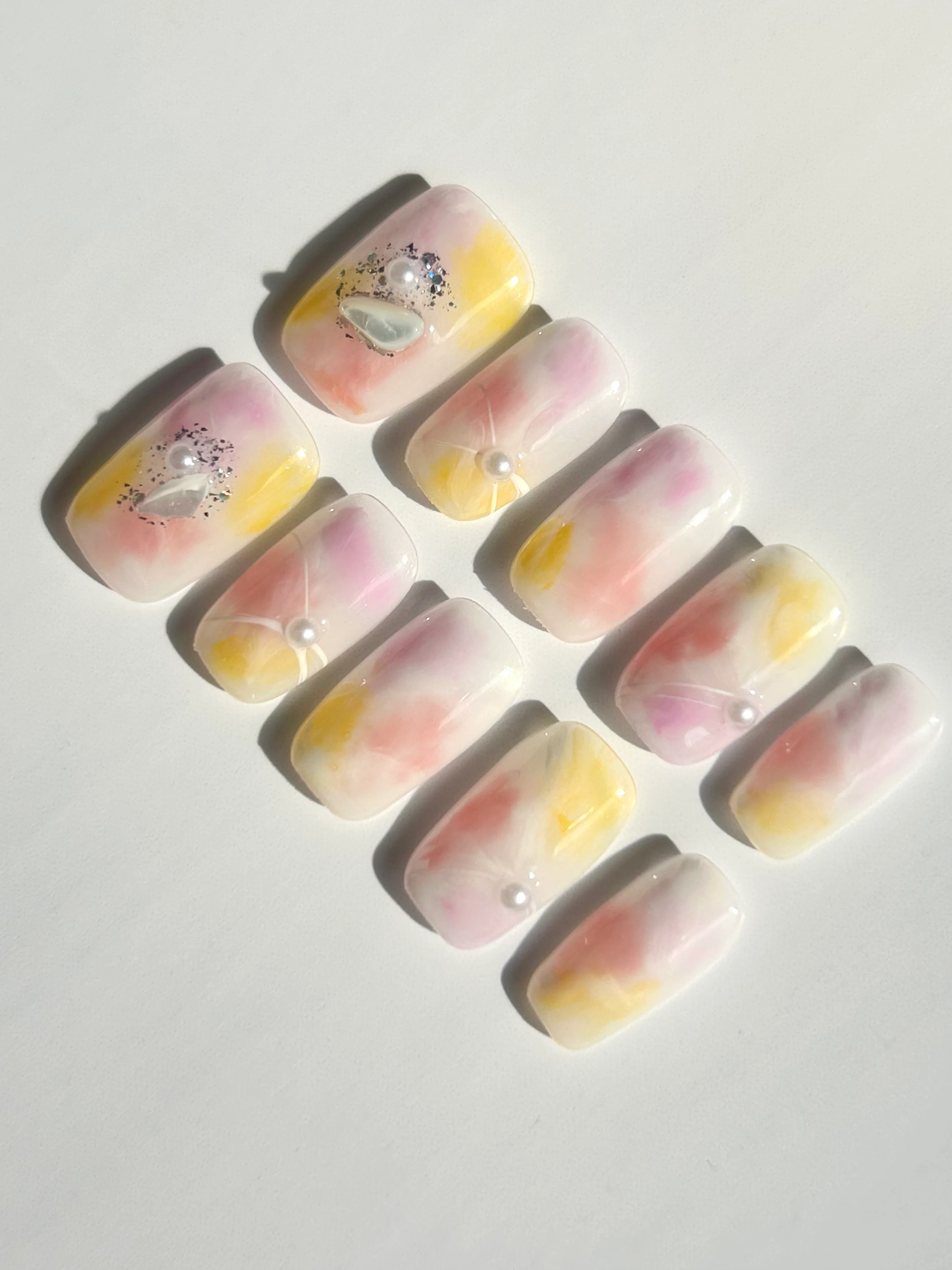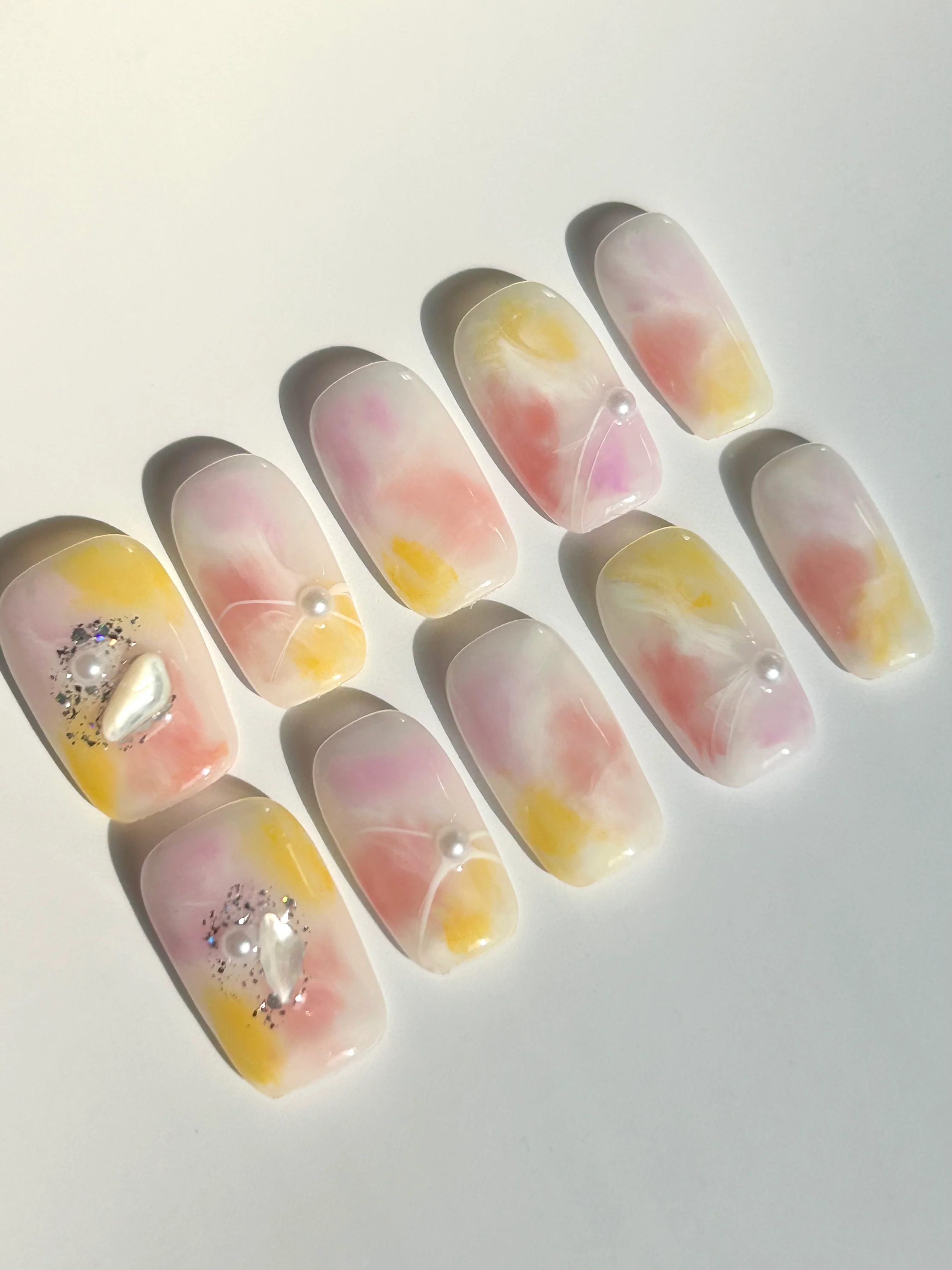 A dreamy pastel ombré of pink, golden yellow, and white, accented with pearls and glitter. A whimsical set that glows like a sunset on your fingertips.