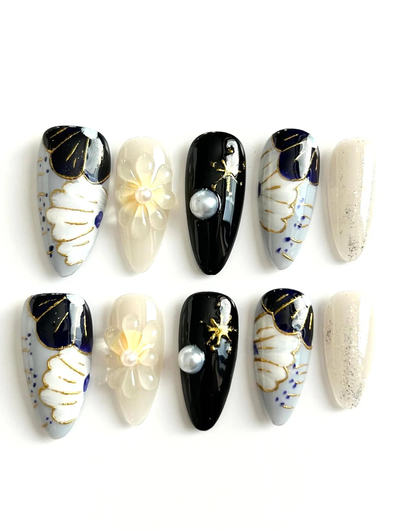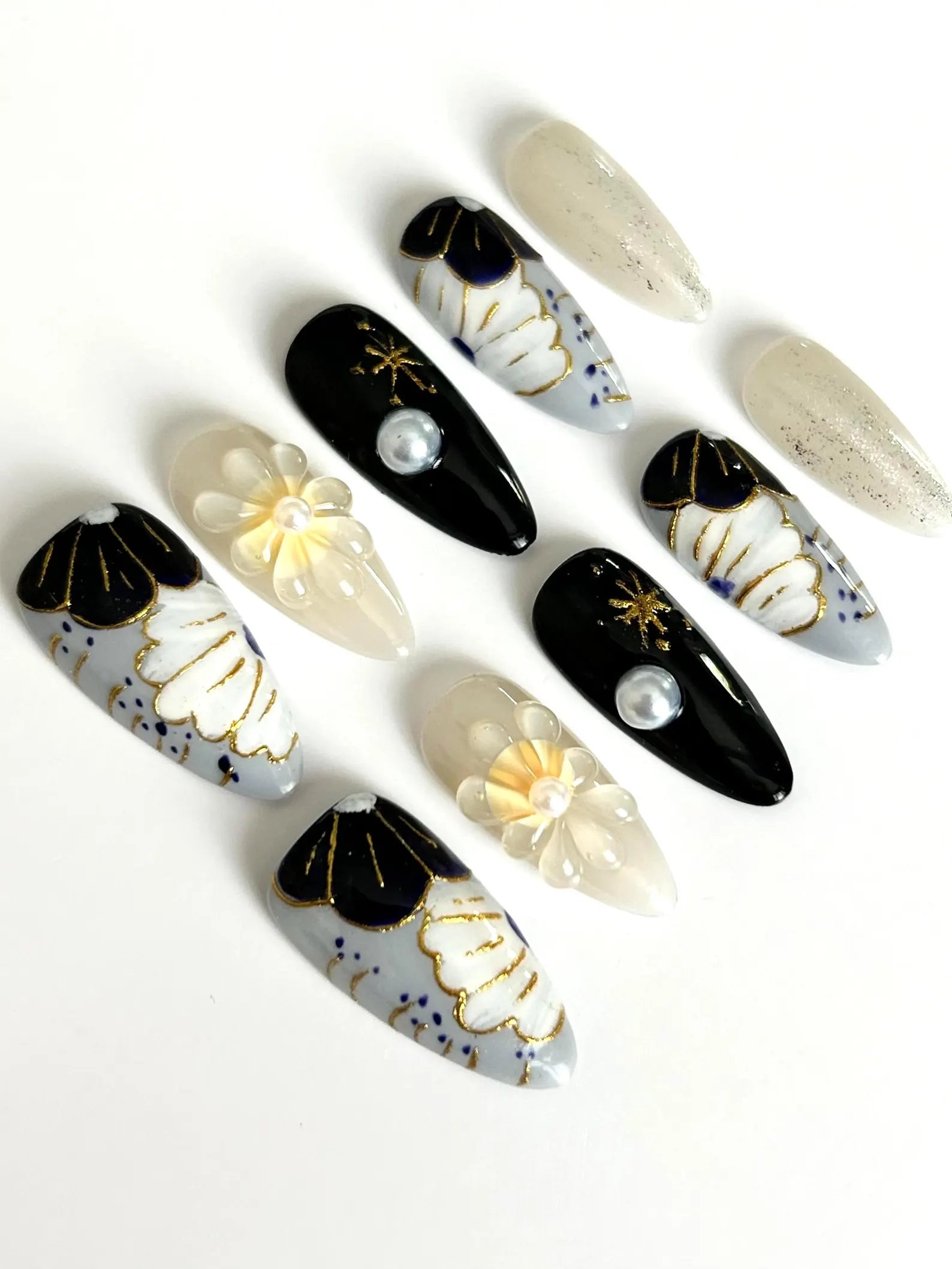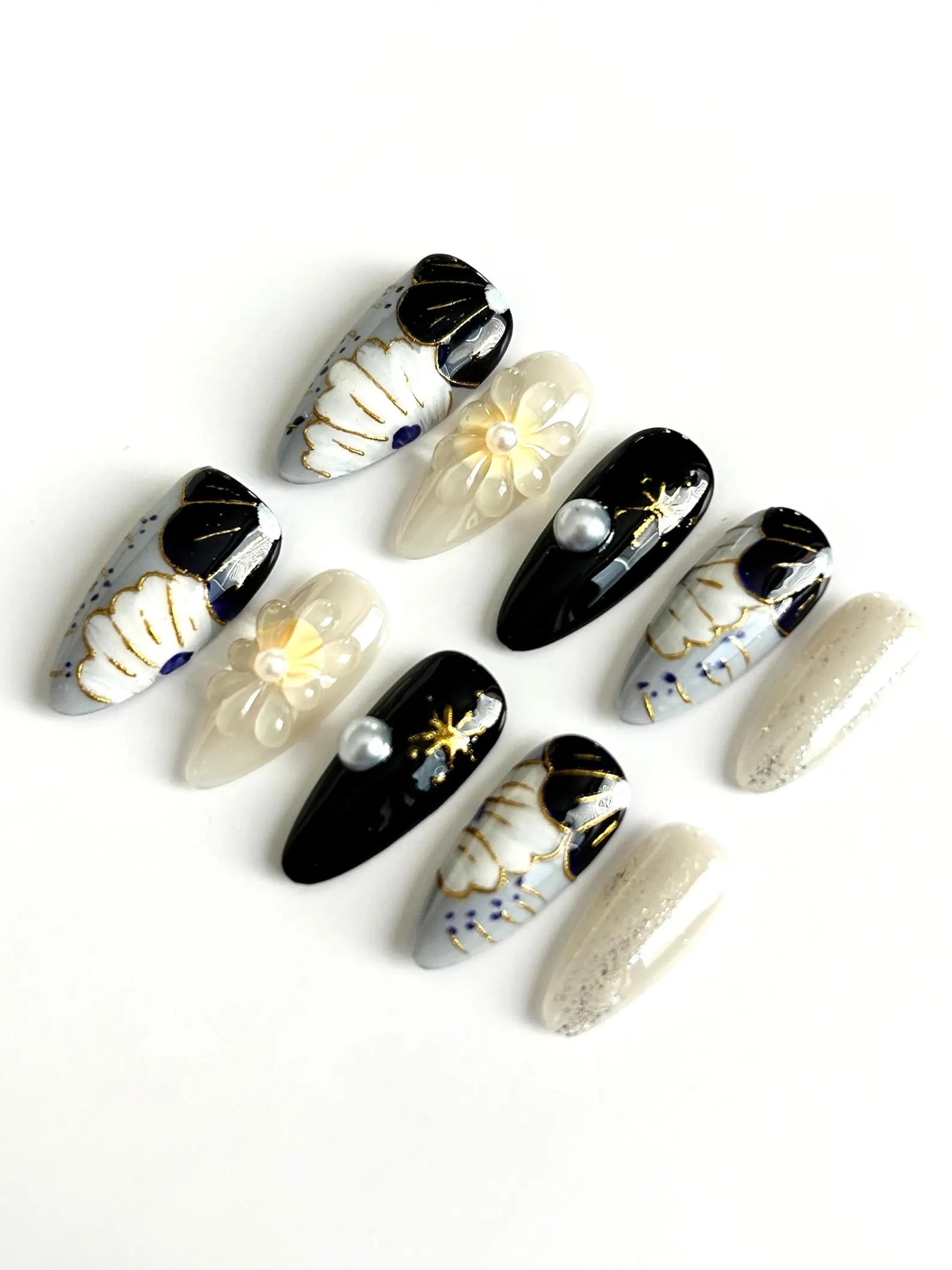 Black and cream almond nails meet celestial-inspired art with gold accents, 3D flowers, and pearl embellishments for a statement luxe look.