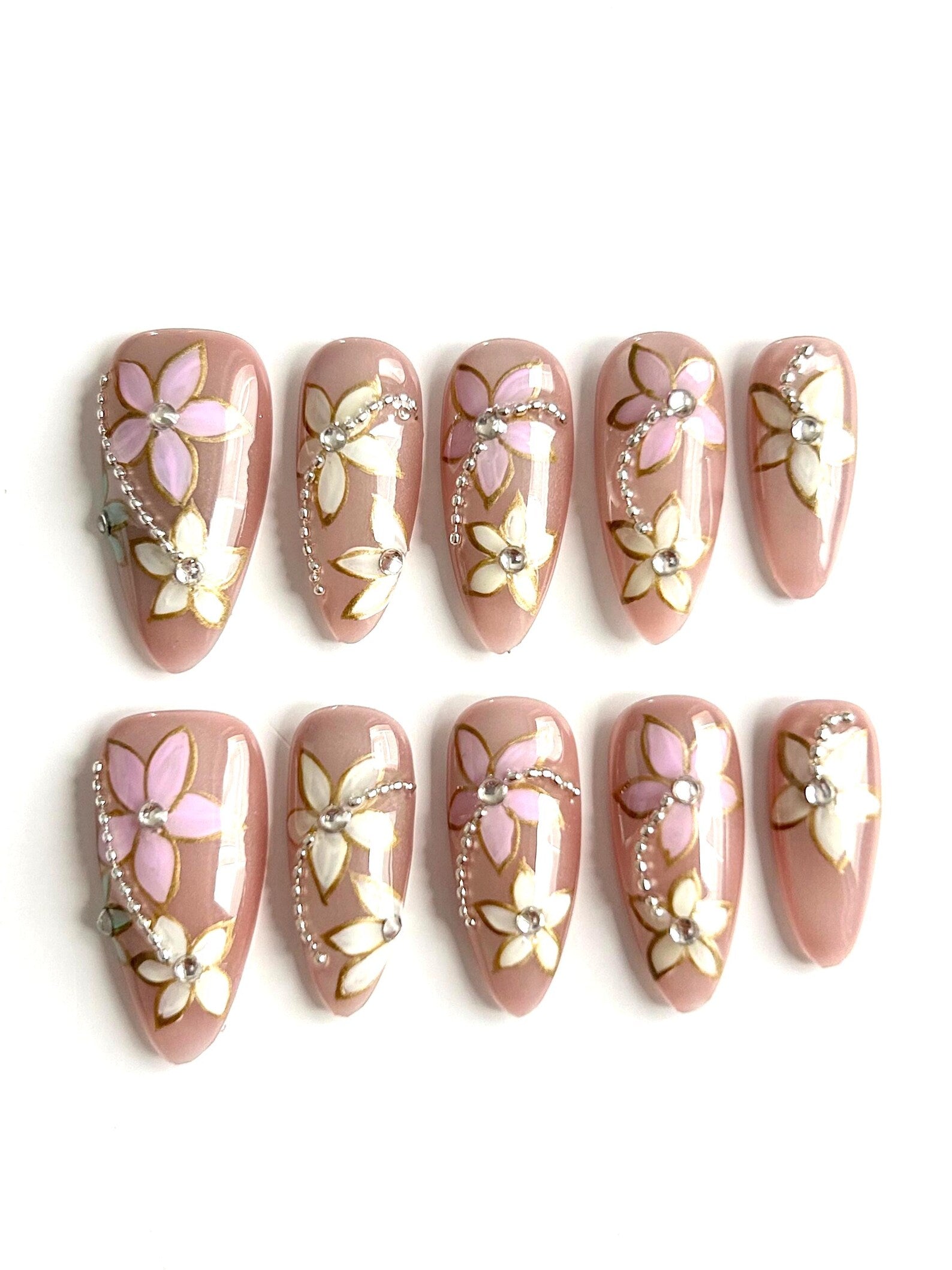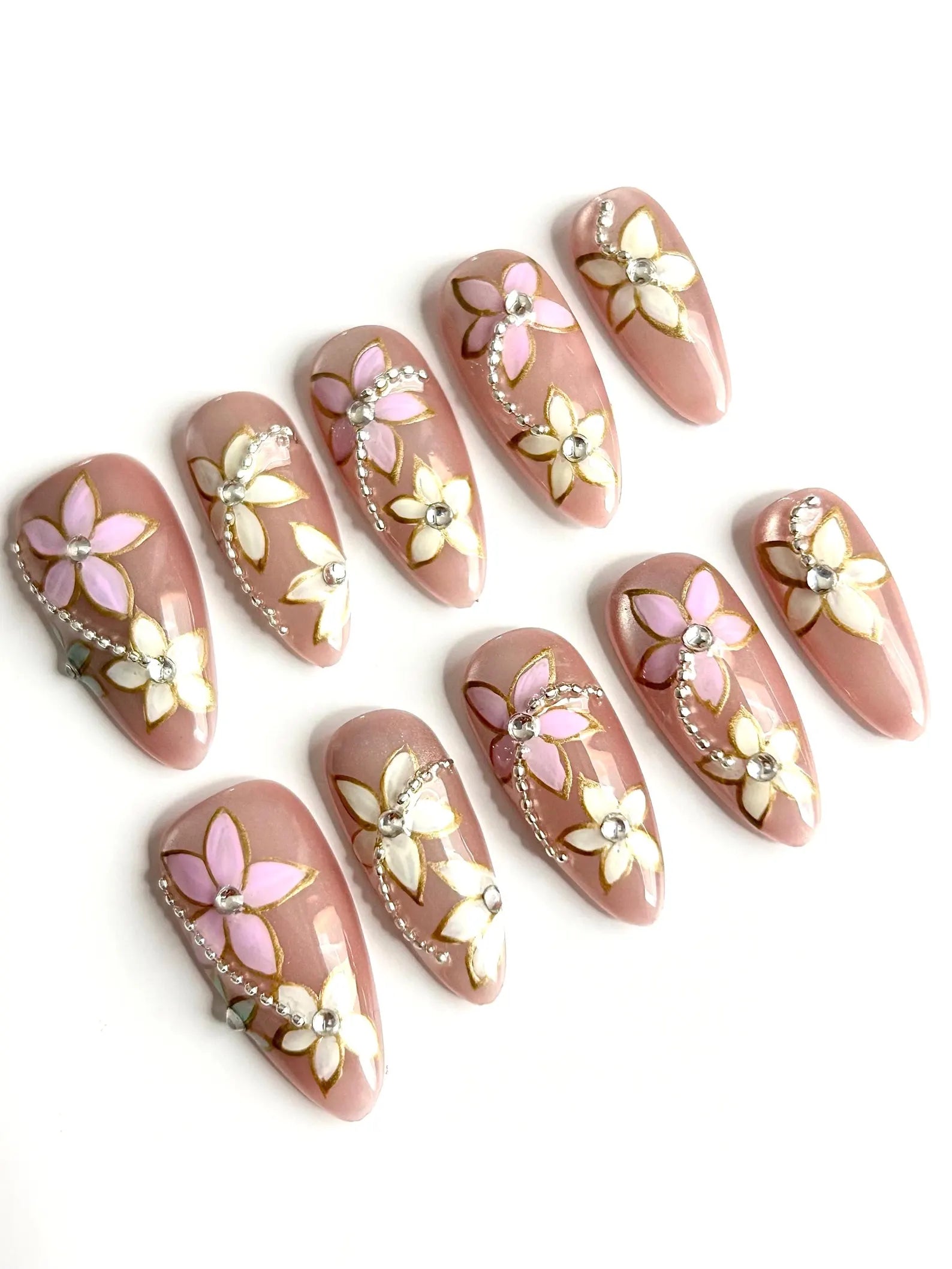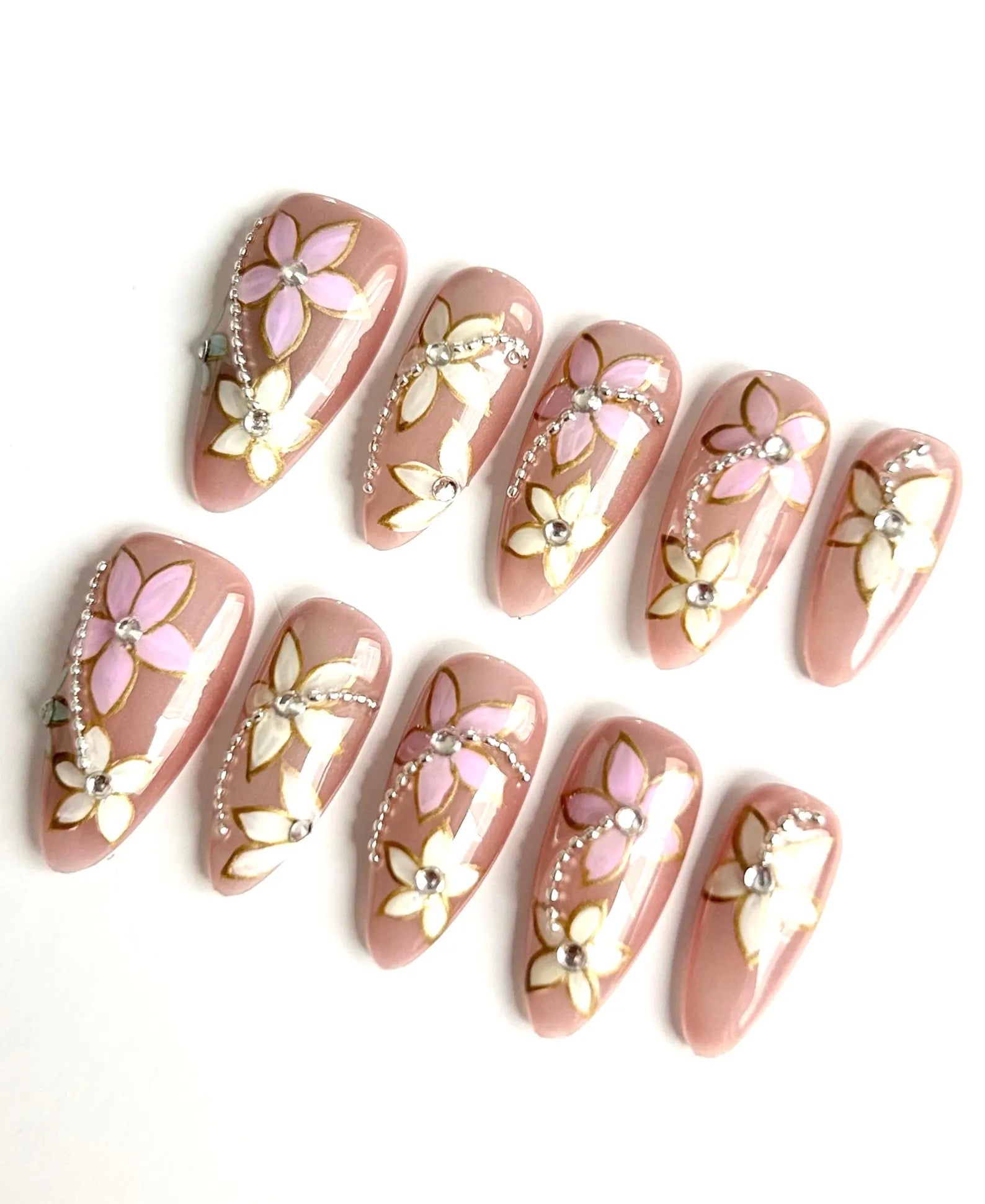 Romantic blush nails with golden floral outlines, pearls, and rhinestones. A luxury upgrade for timeless feminine glam.