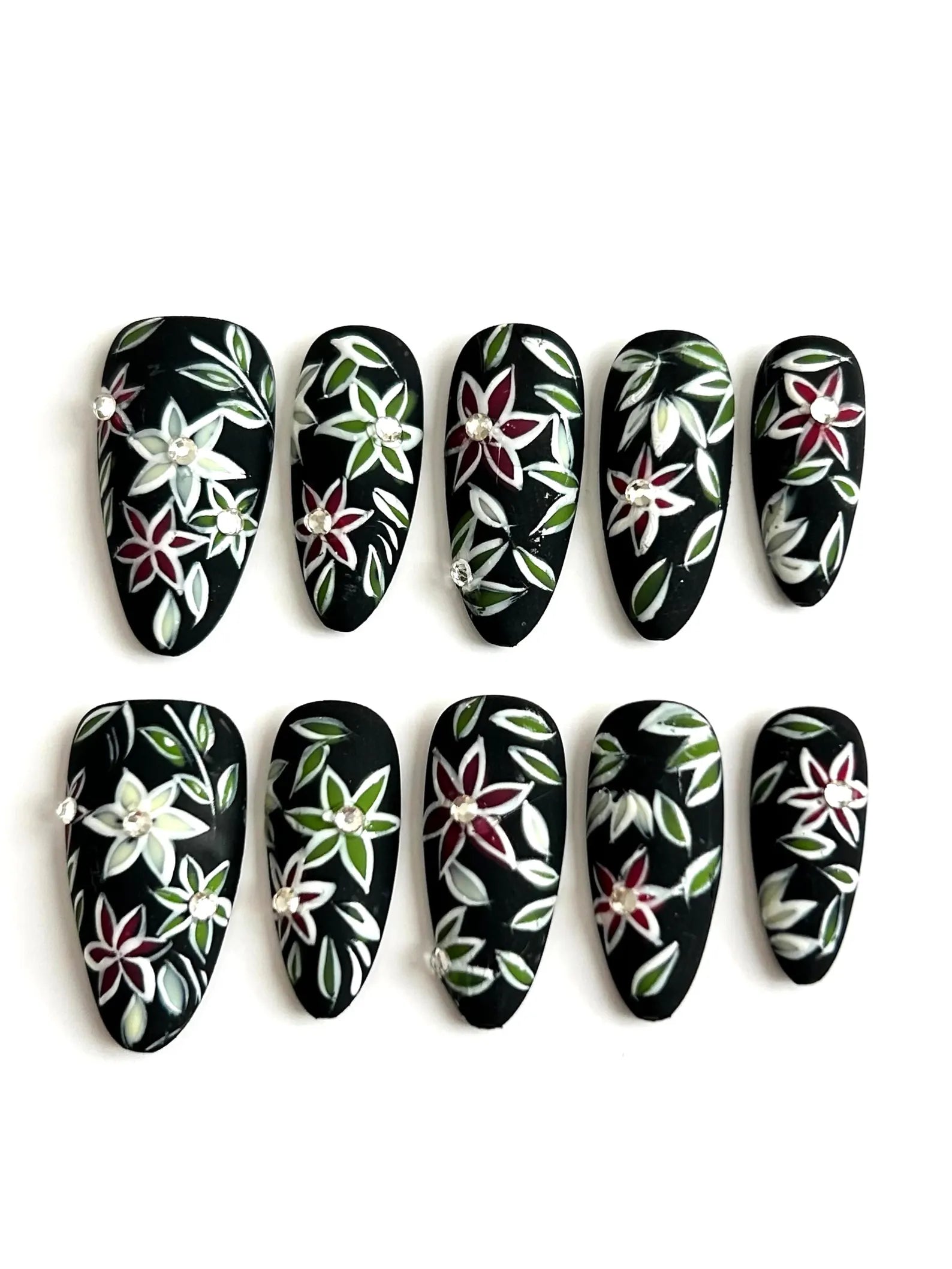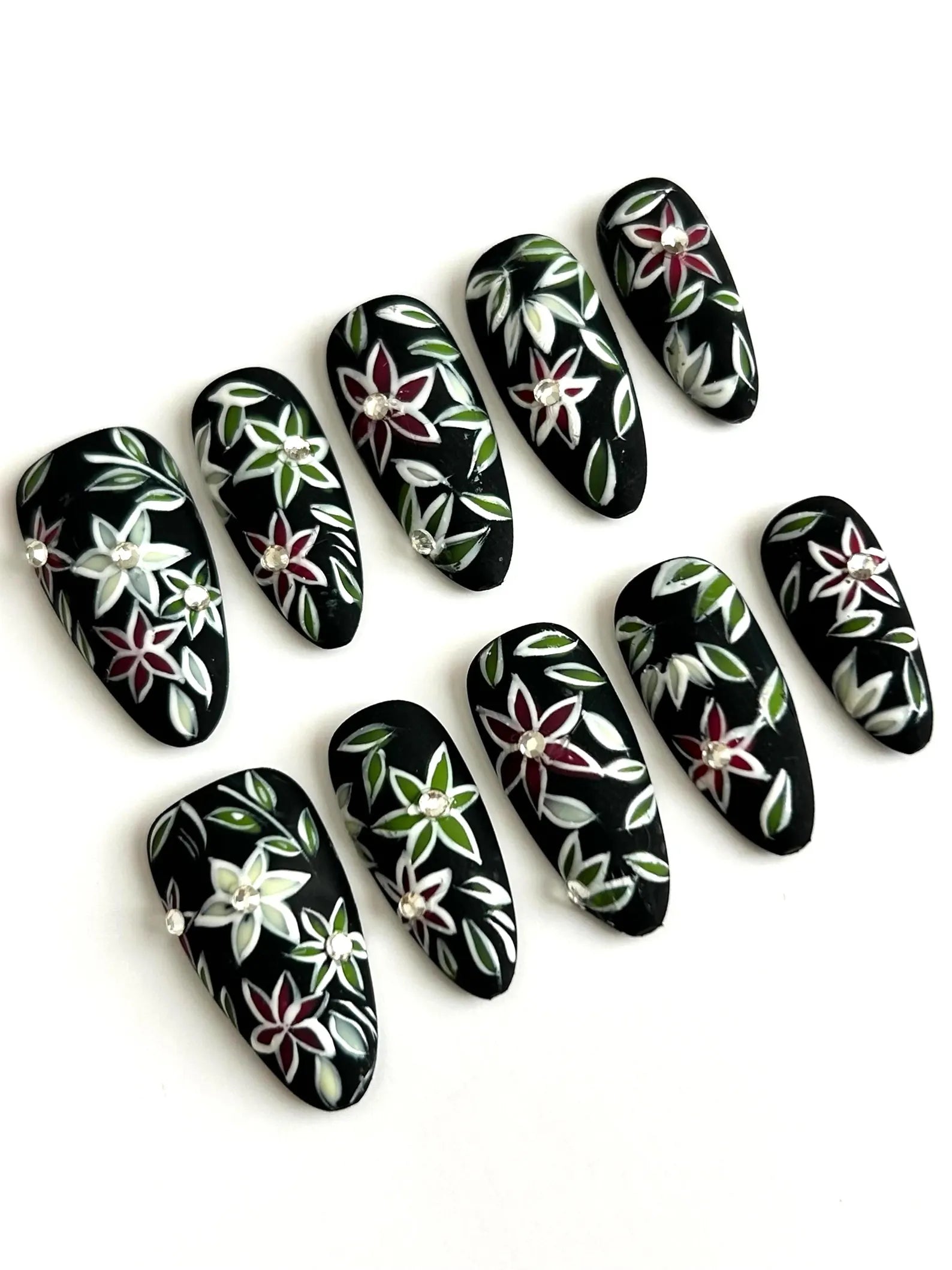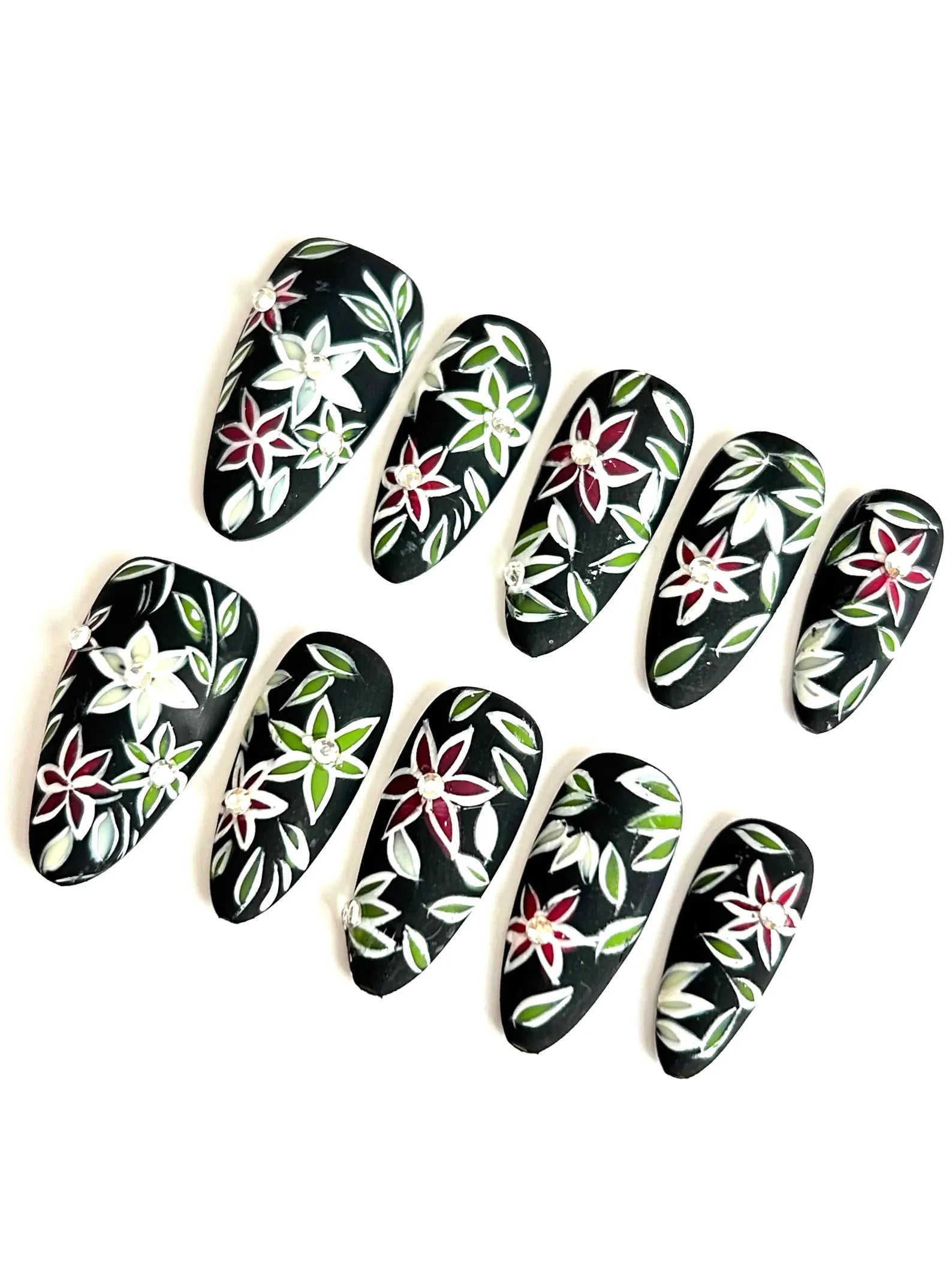 A bold matte black base with vivid red, green, and white floral details. A dramatic and stylish choice for fall 2025 nail trends.