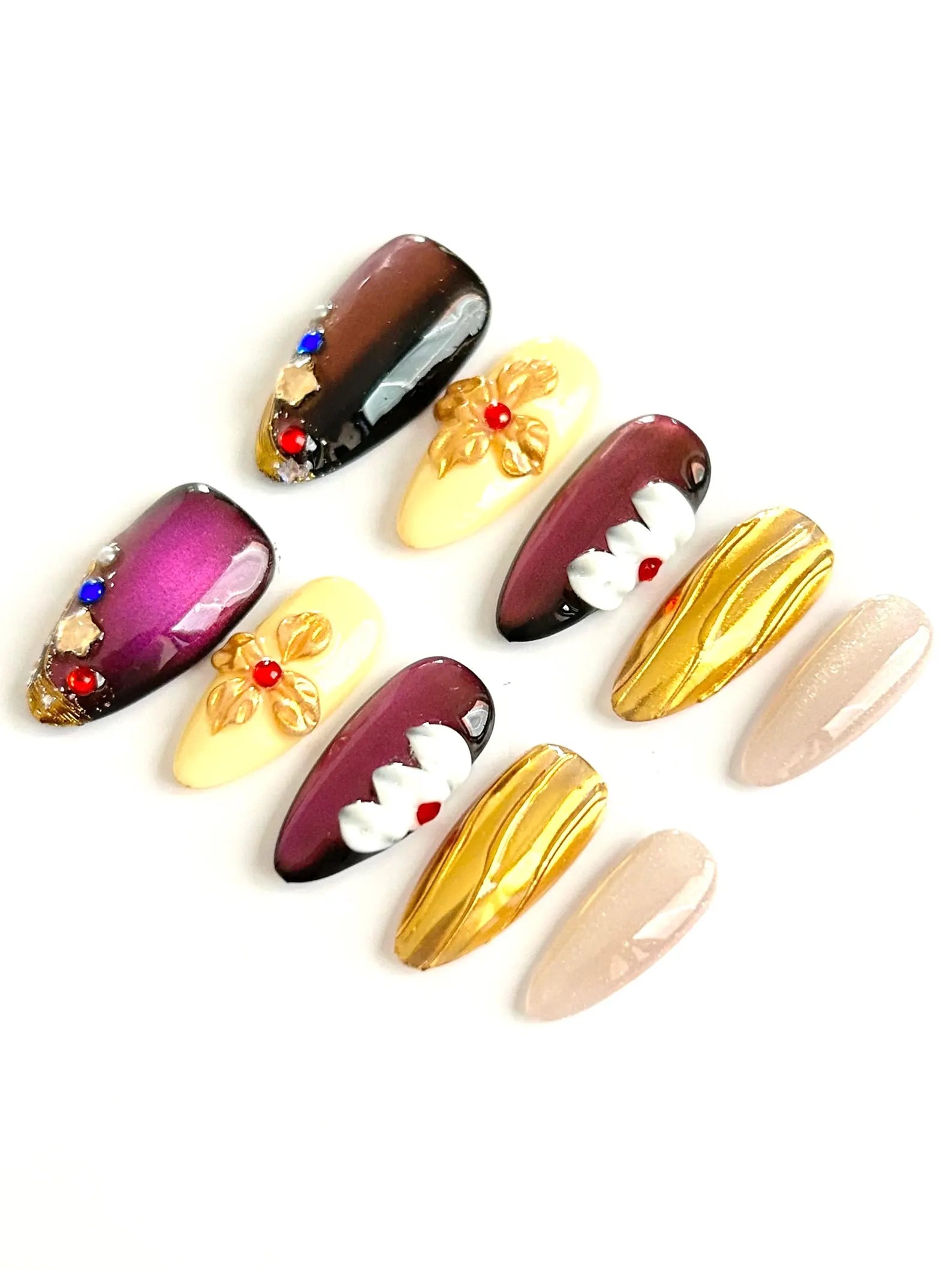 Deep ombré purples meet gold accents and bold 3D floral designs. A regal, dramatic set for statement fall nails.