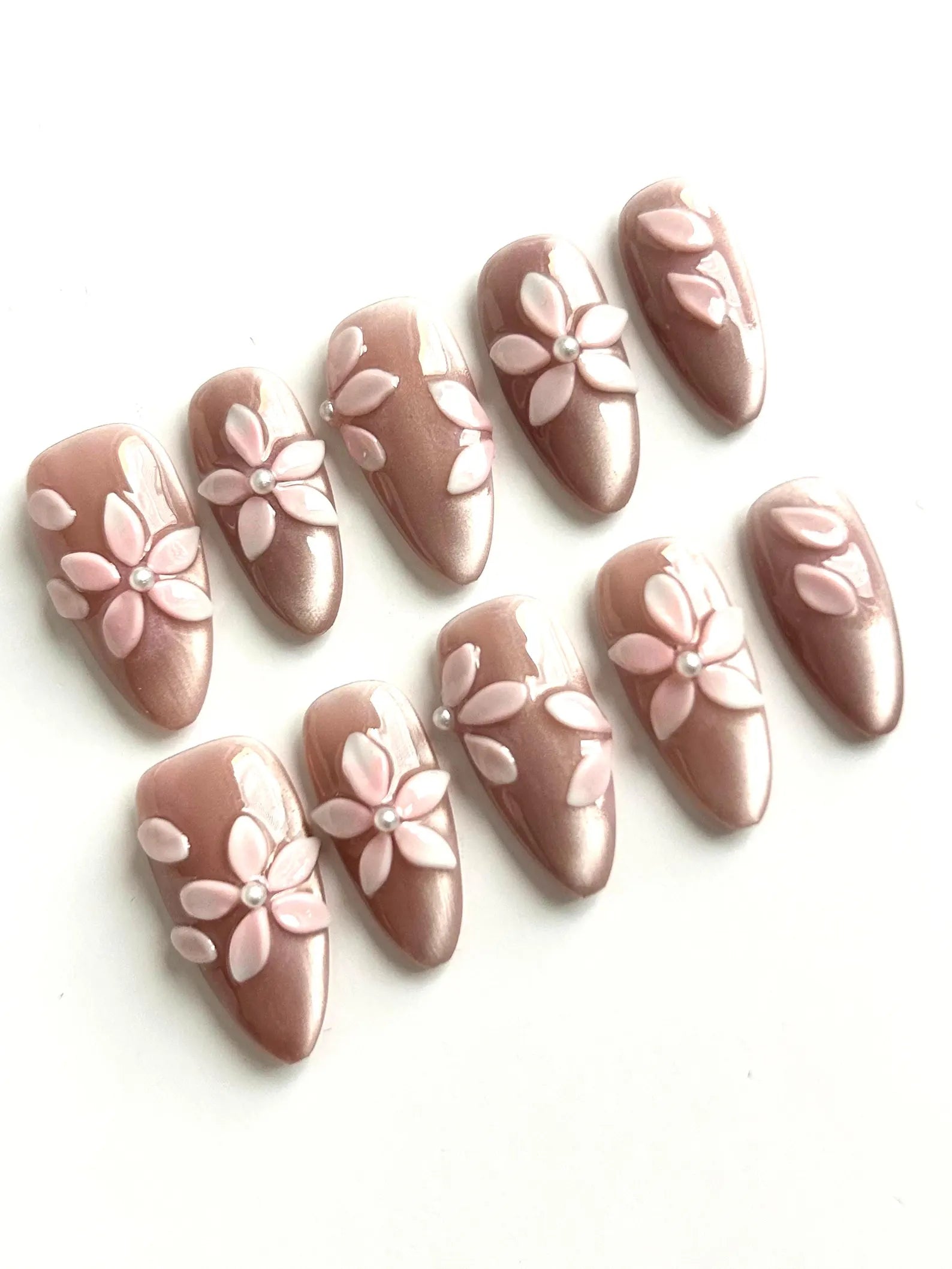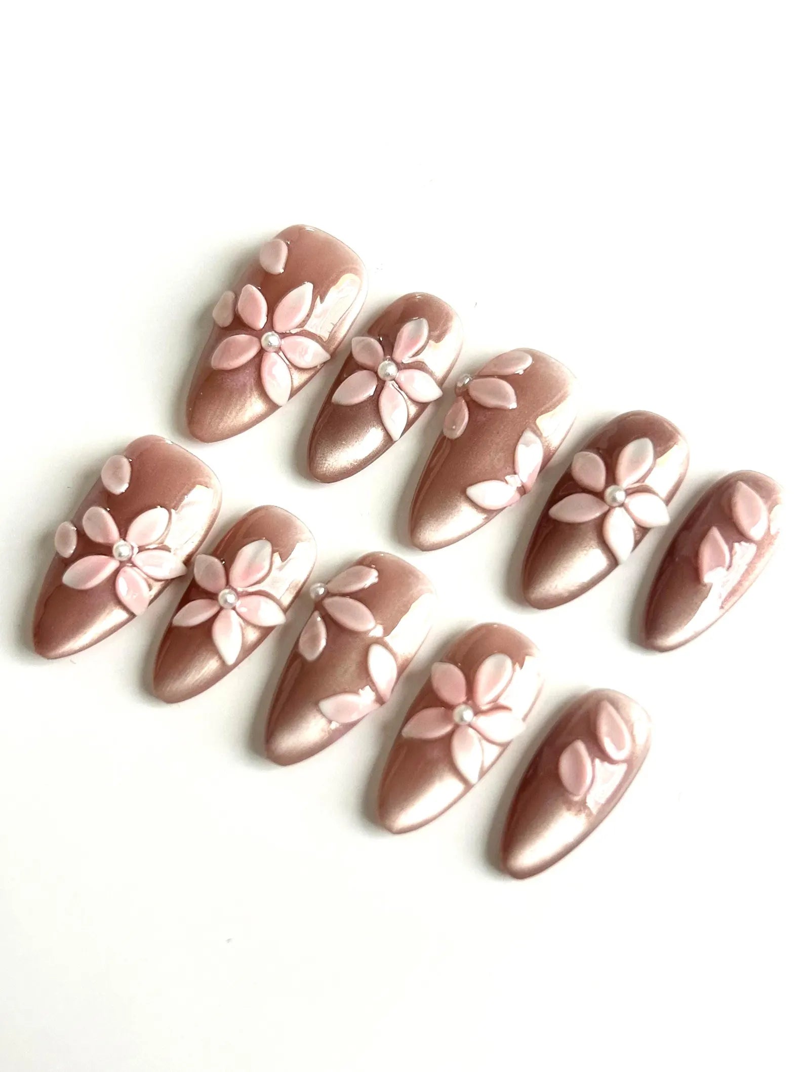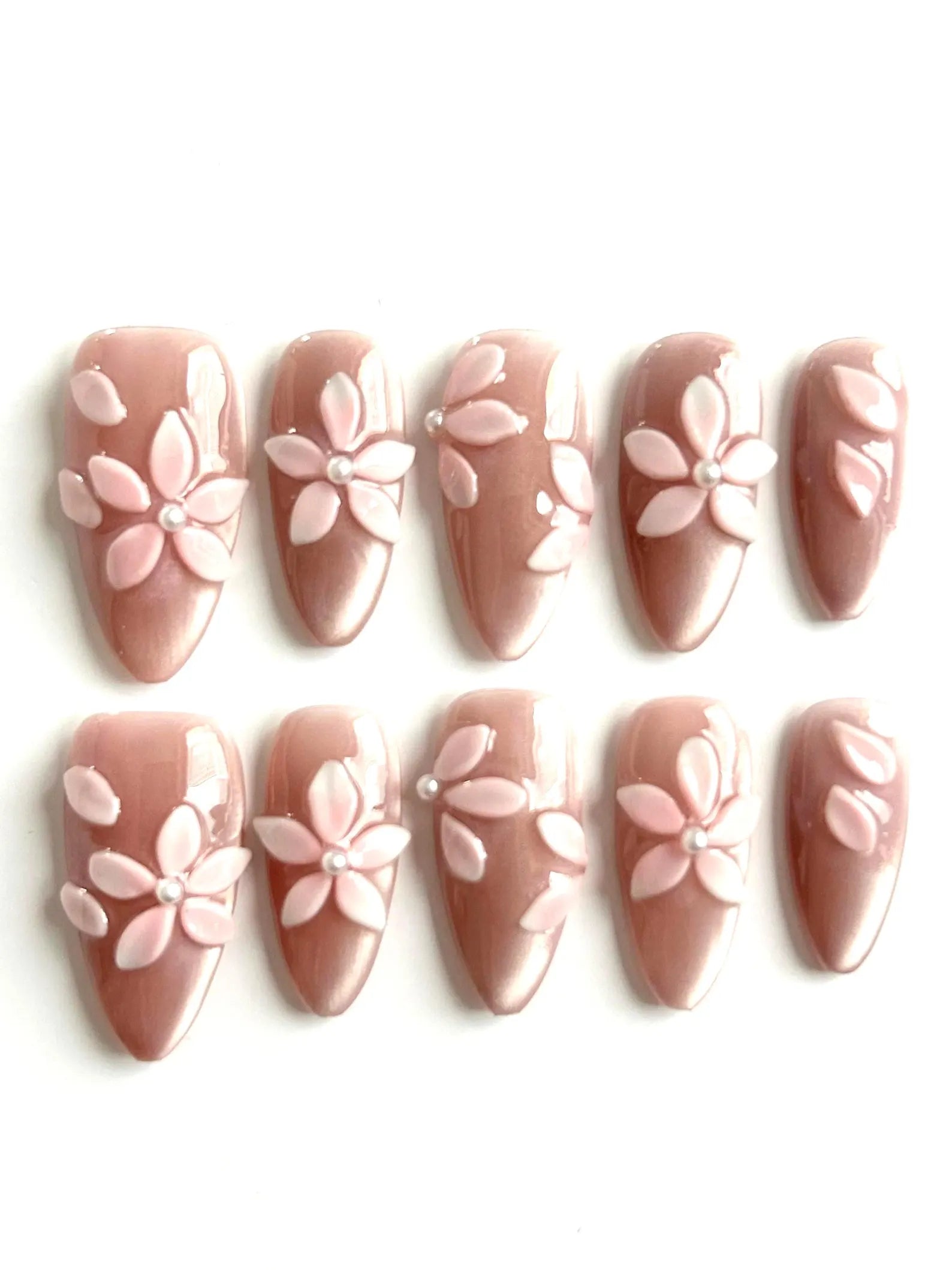 Soft blush nude bases adorned with 3D pastel flowers and pearl centers. A feminine and graceful design that elevates everyday wear.
