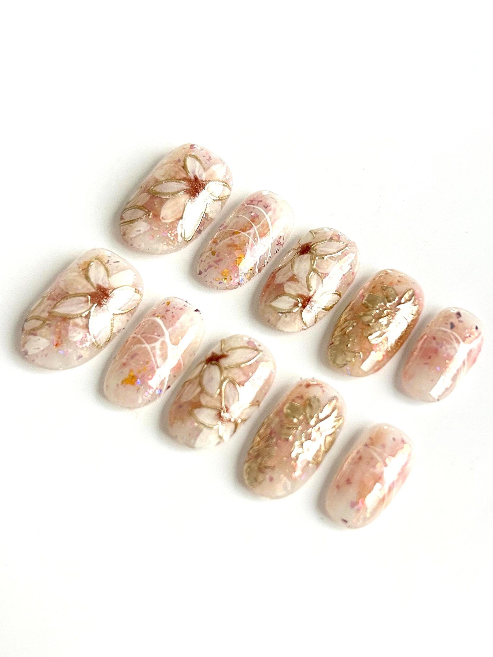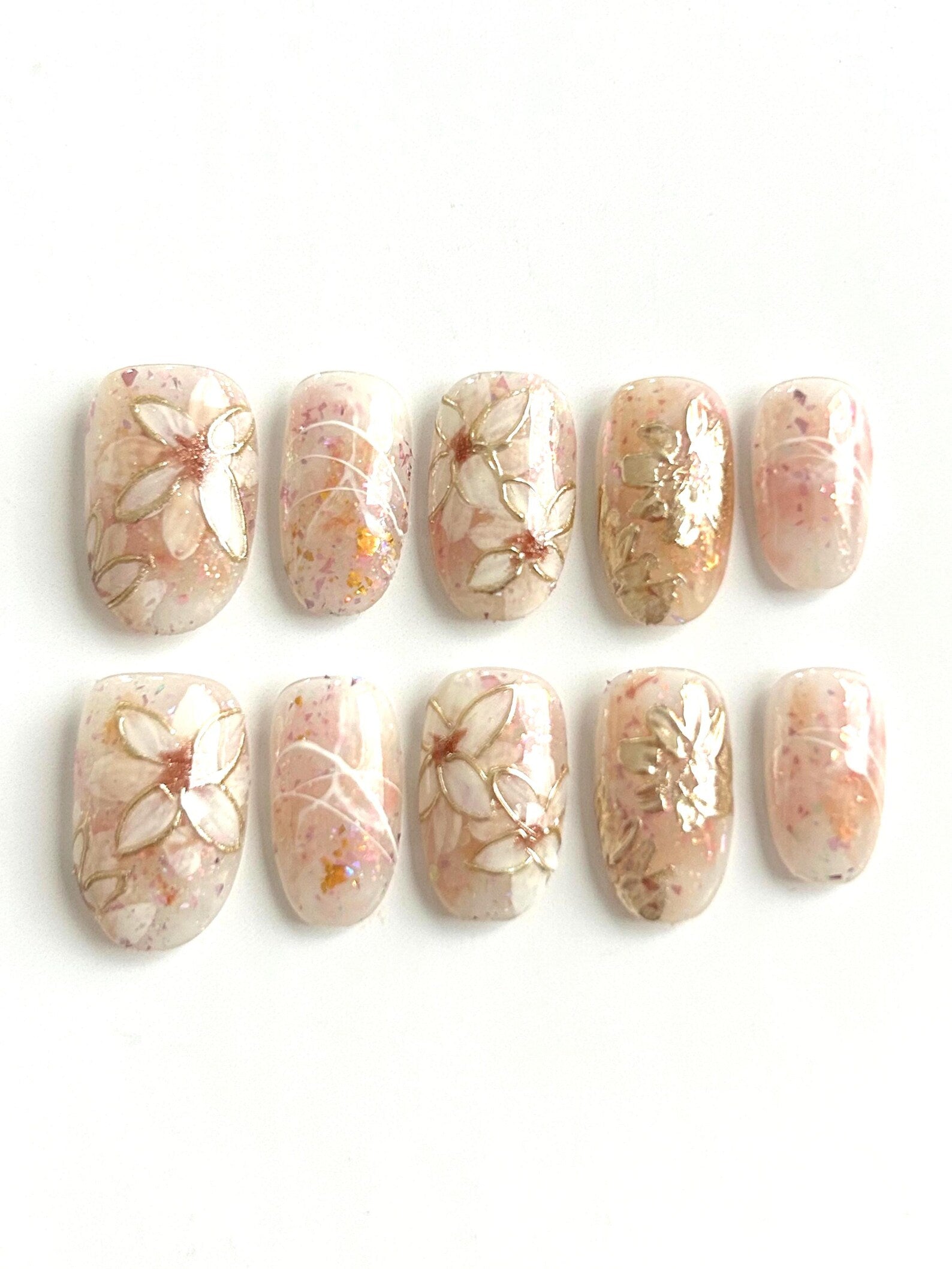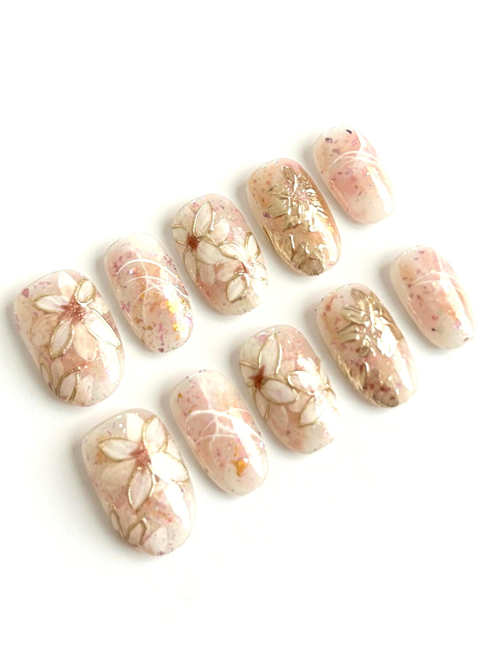 A soft nude base with scattered glitter and delicate golden floral details. Subtle sparkle with a hint of floral elegance.