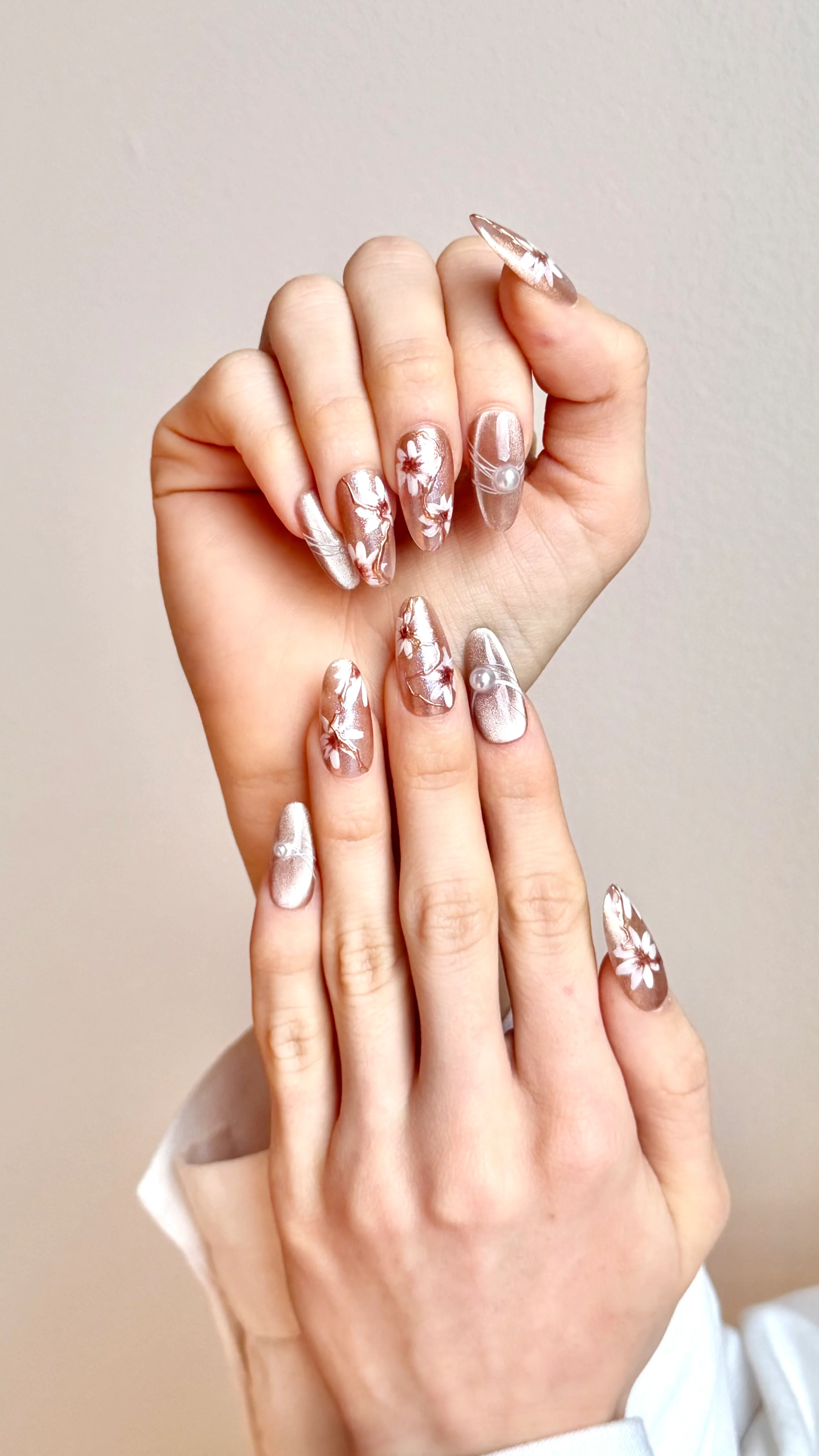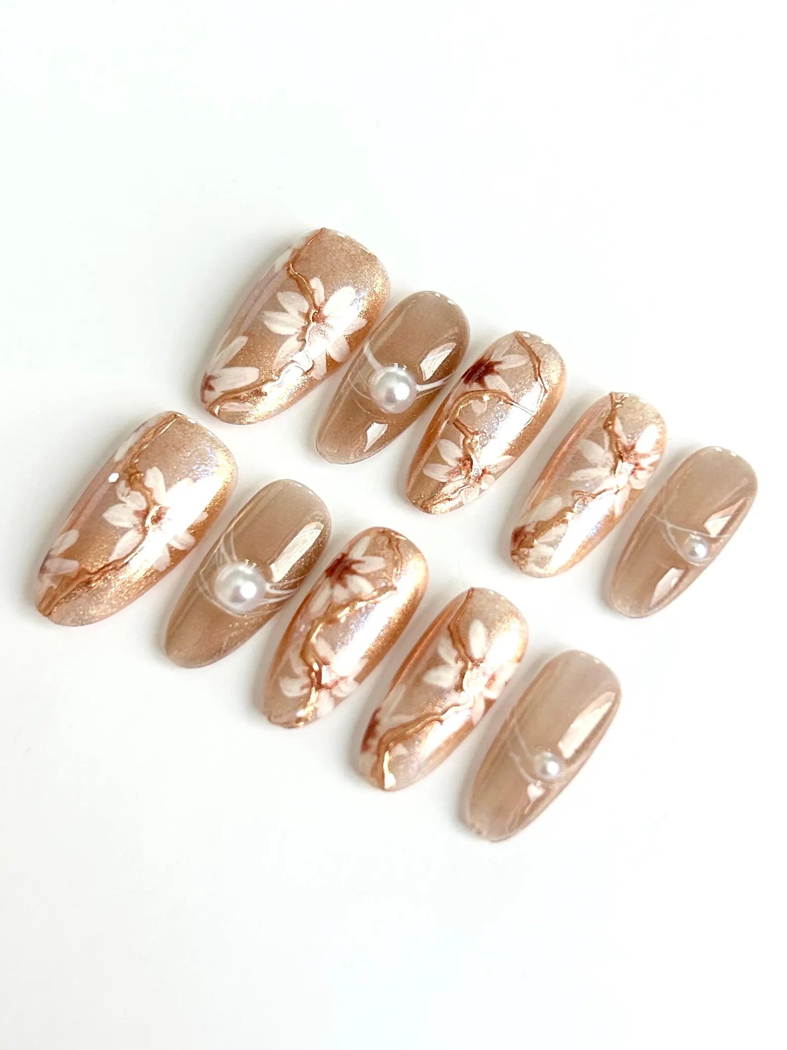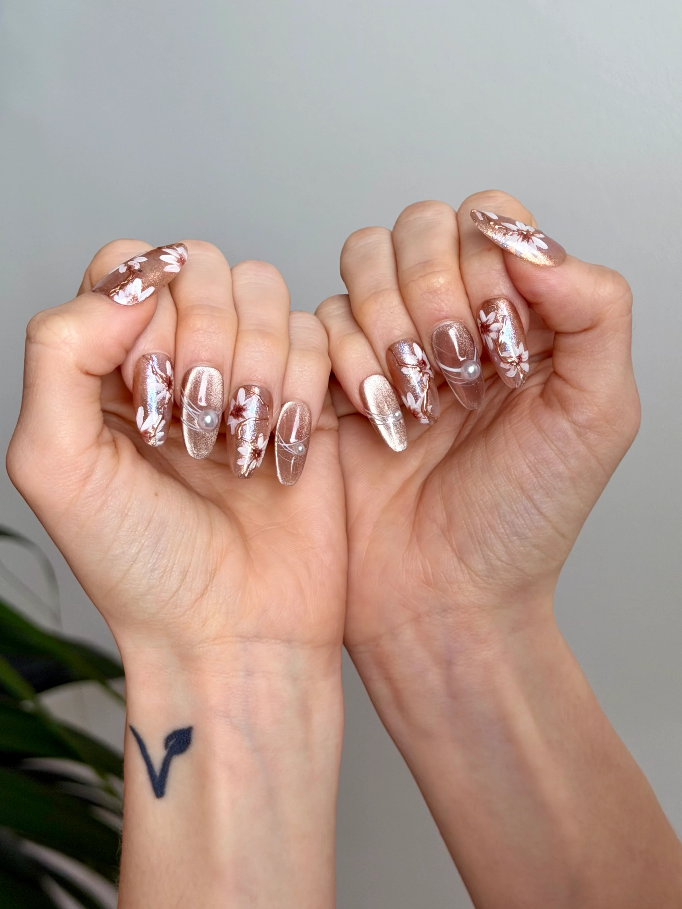 Shimmering champagne bases with delicate floral art and pearl embellishments. A luxe, feminine design perfect for fall glam.