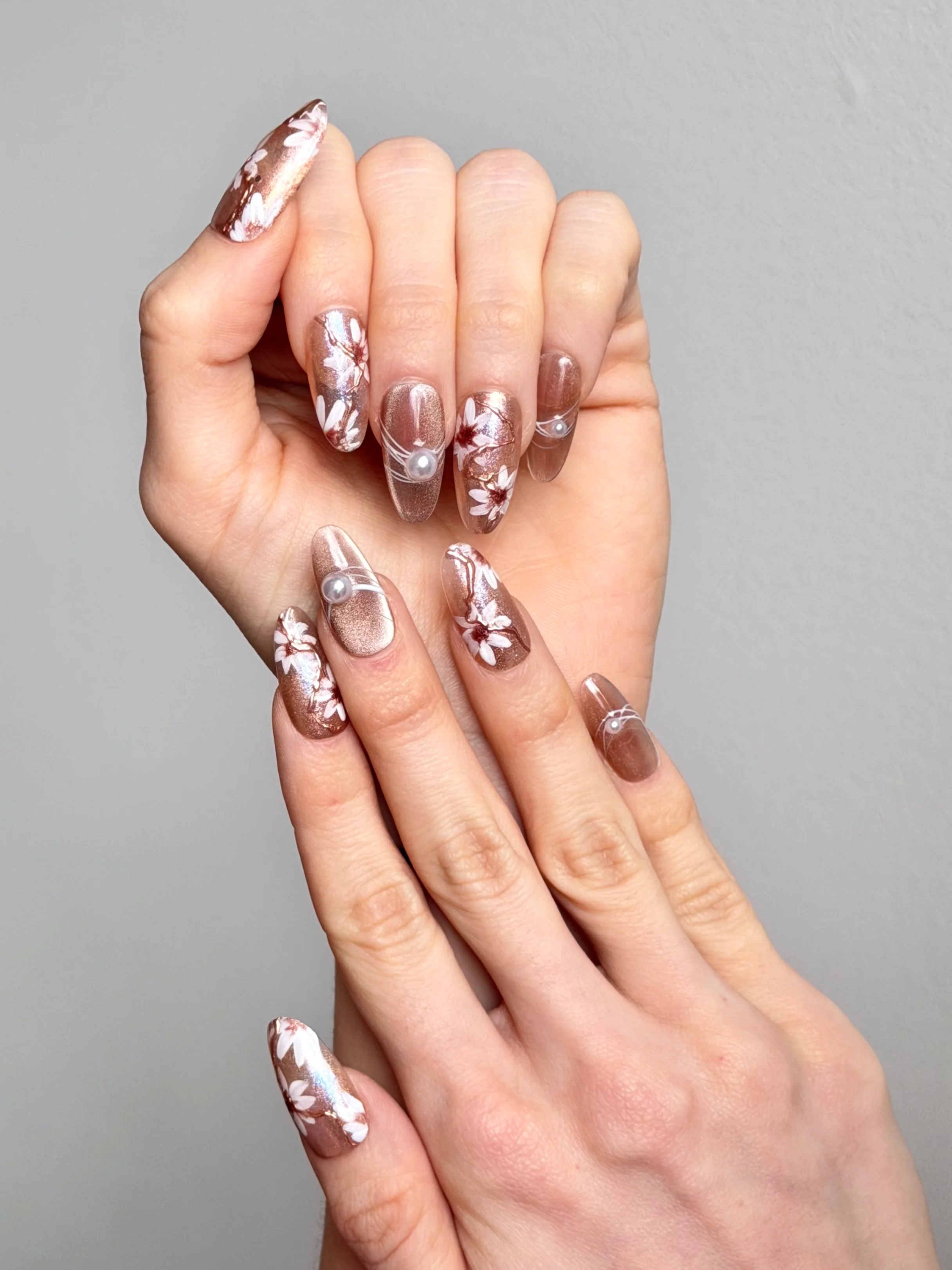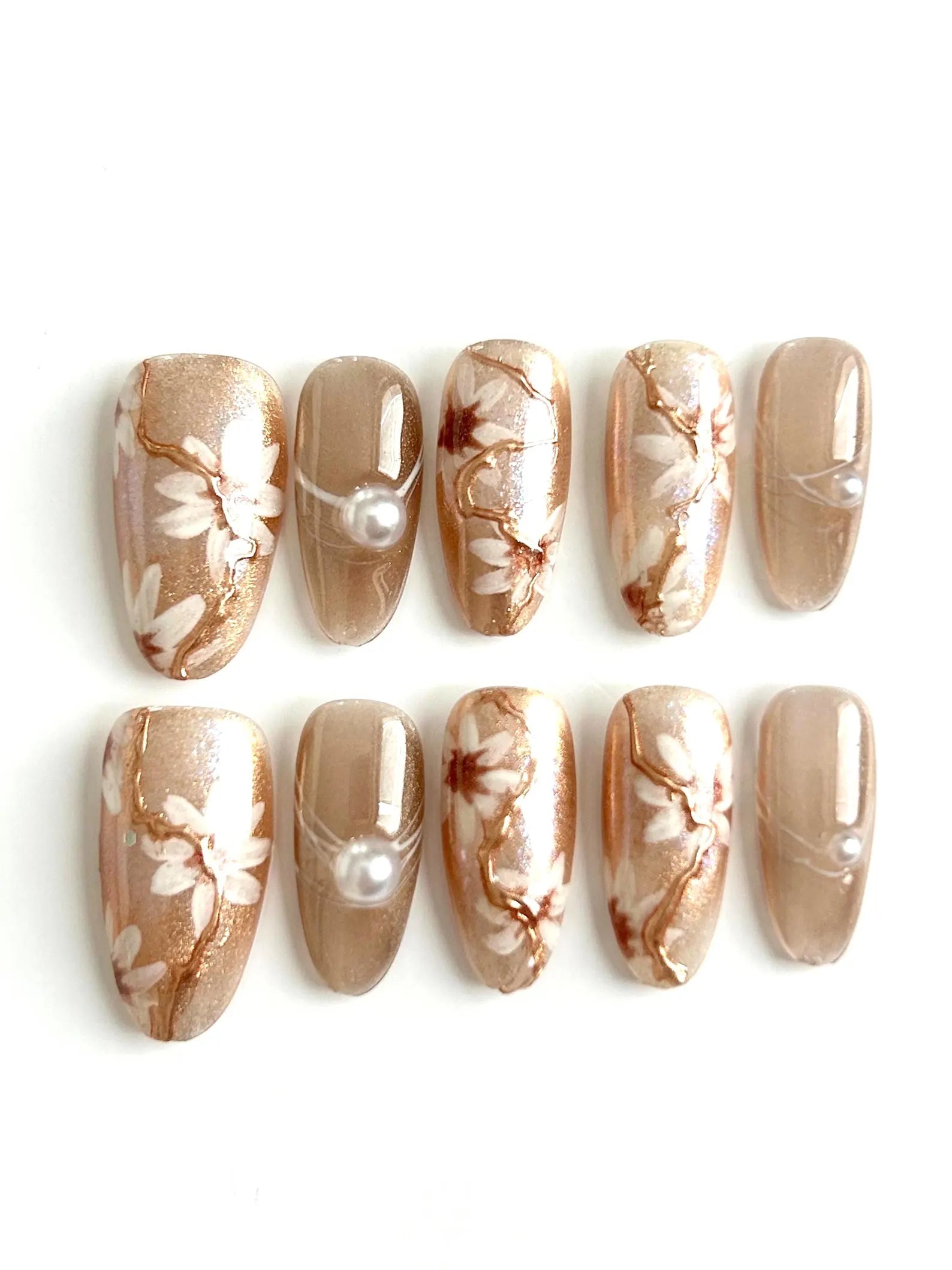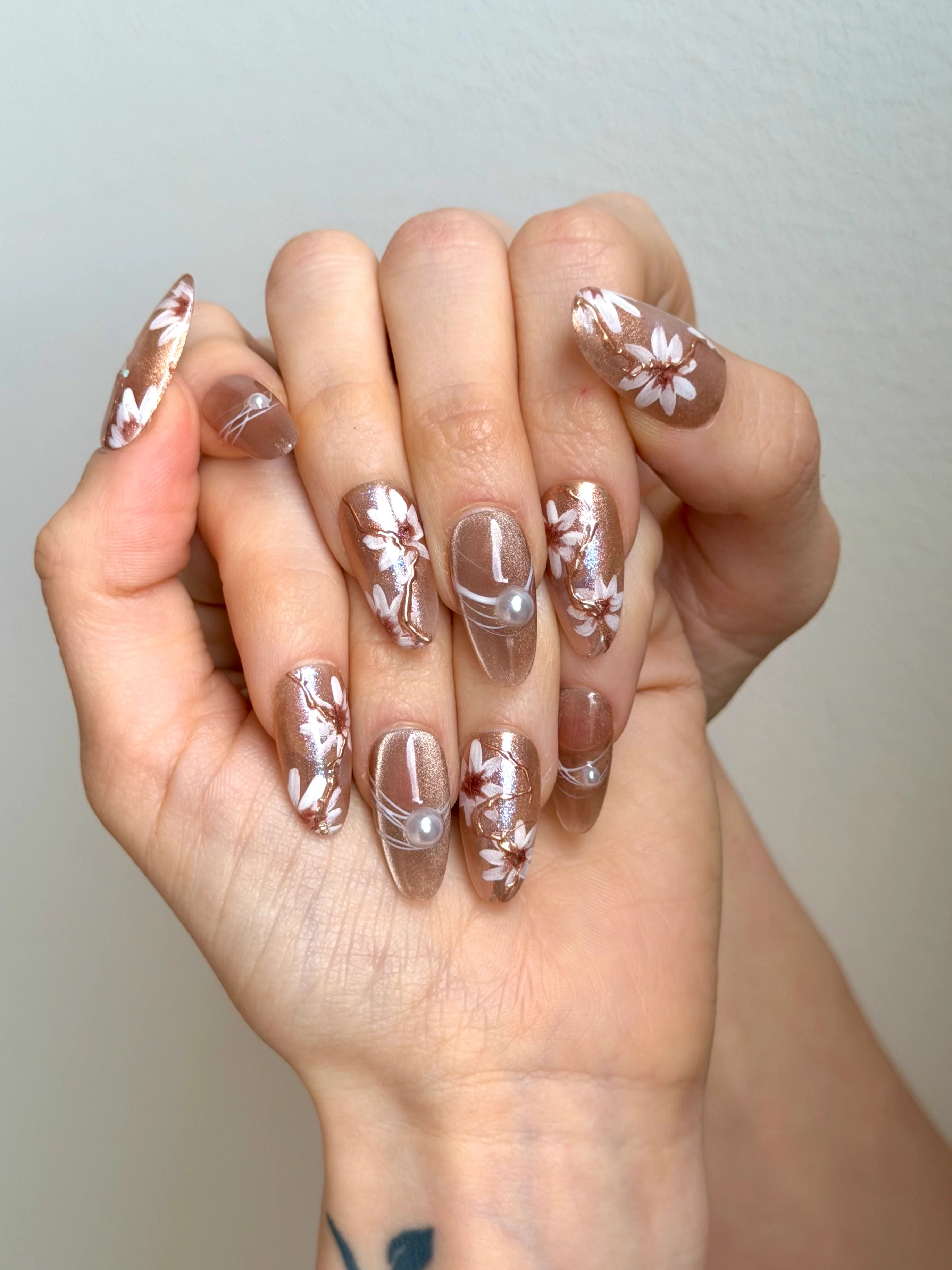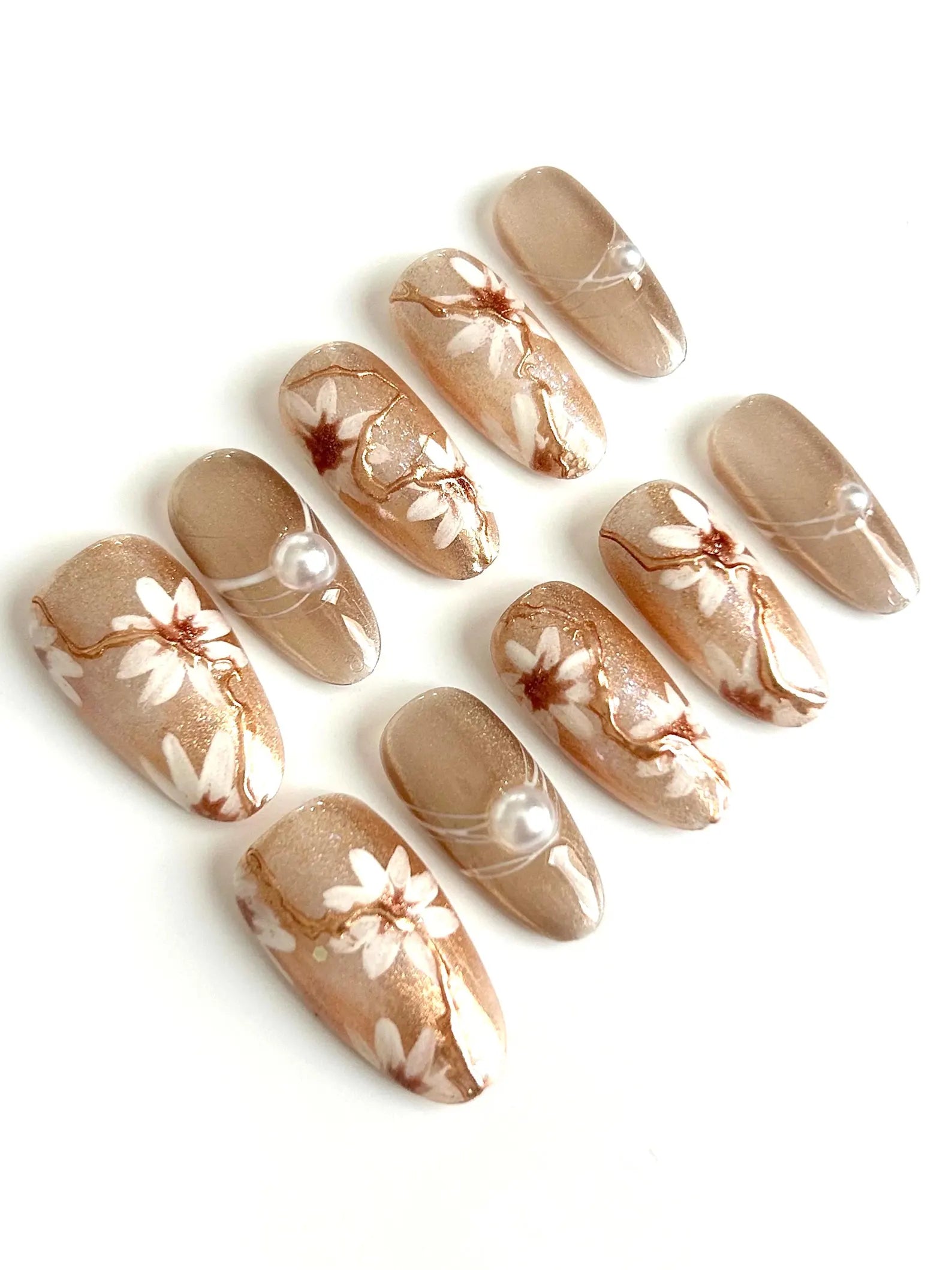 Shimmering champagne bases with delicate floral art and pearl embellishments. A luxe, feminine design perfect for fall glam.