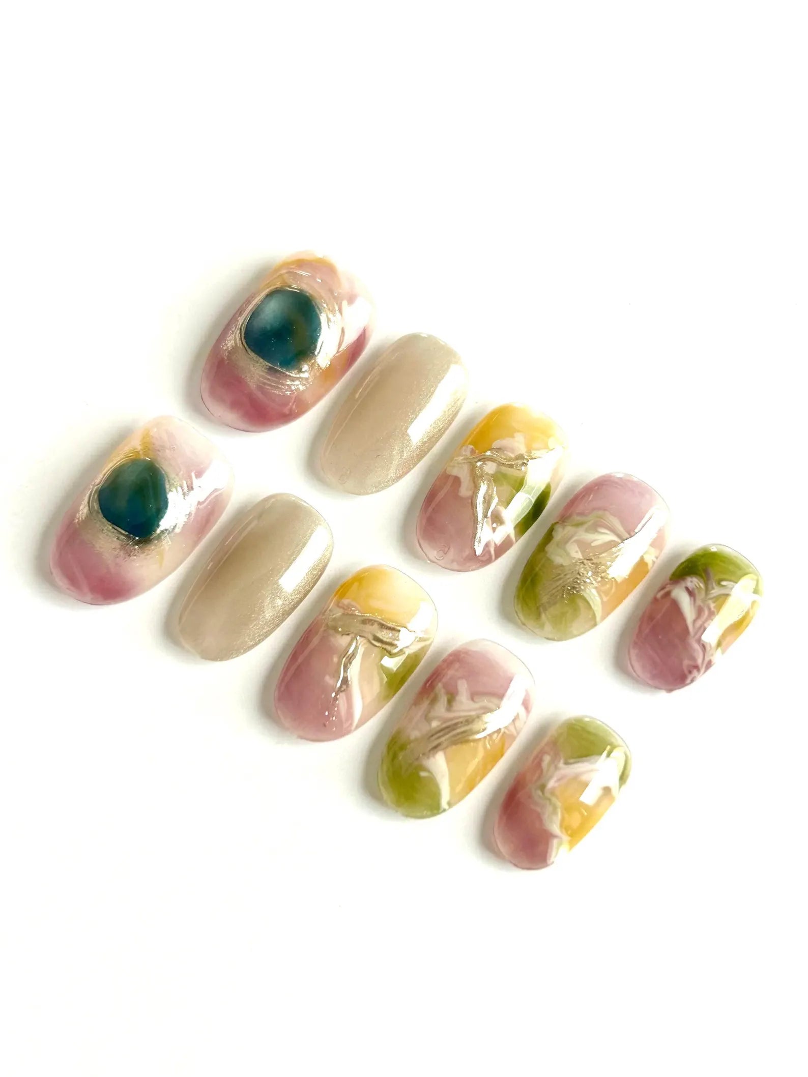 Soft pink and nude bases with abstract floral patterns in green, yellow, and teal, finished with glossy accents and artistic detail.