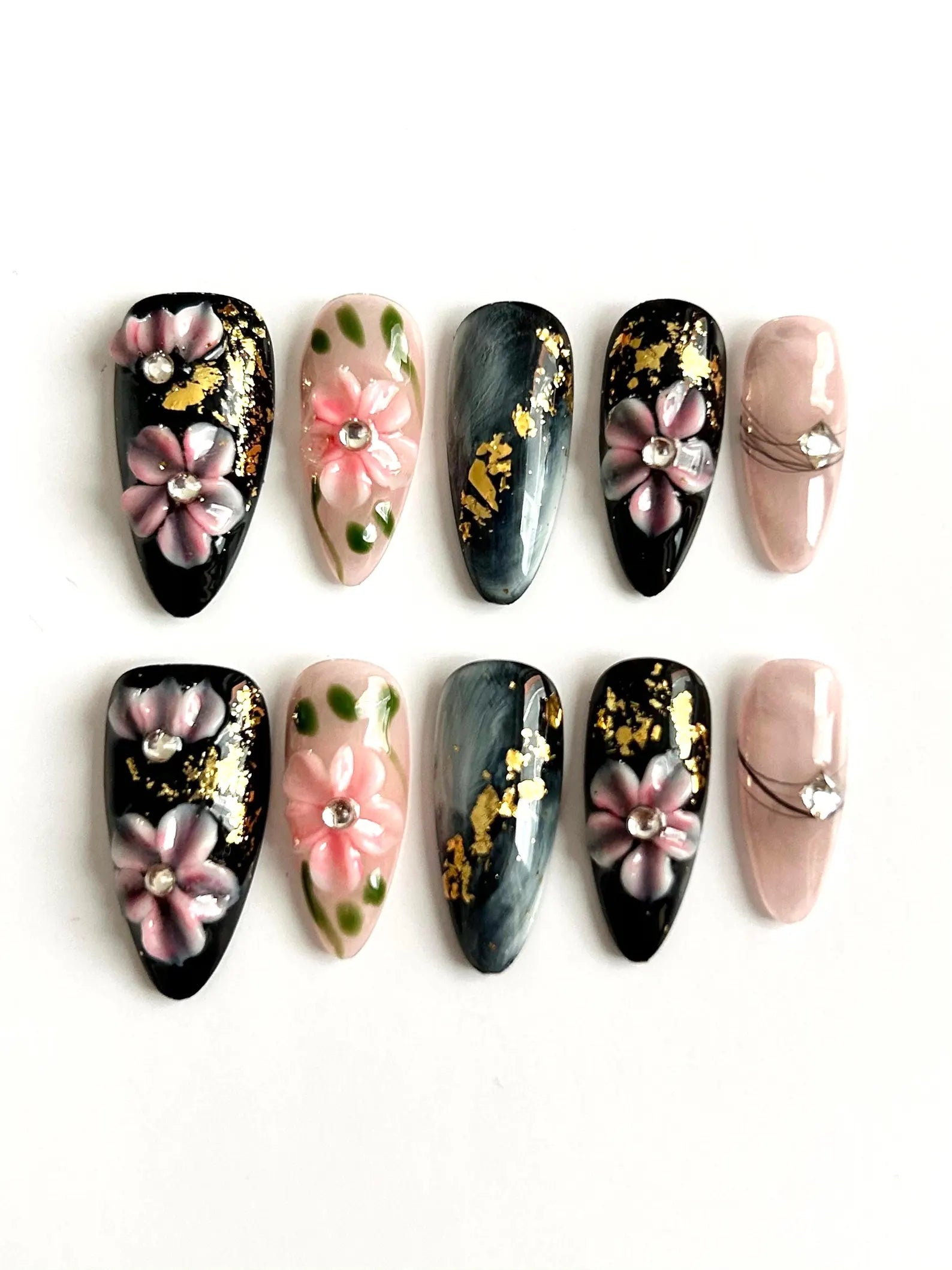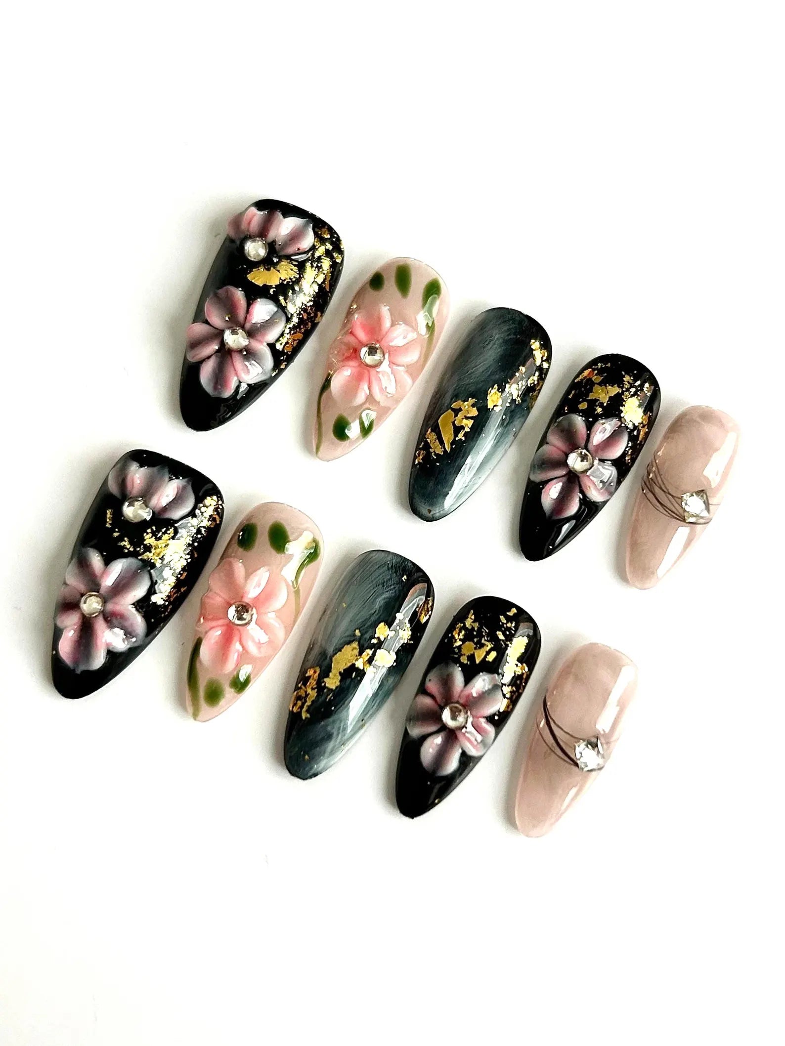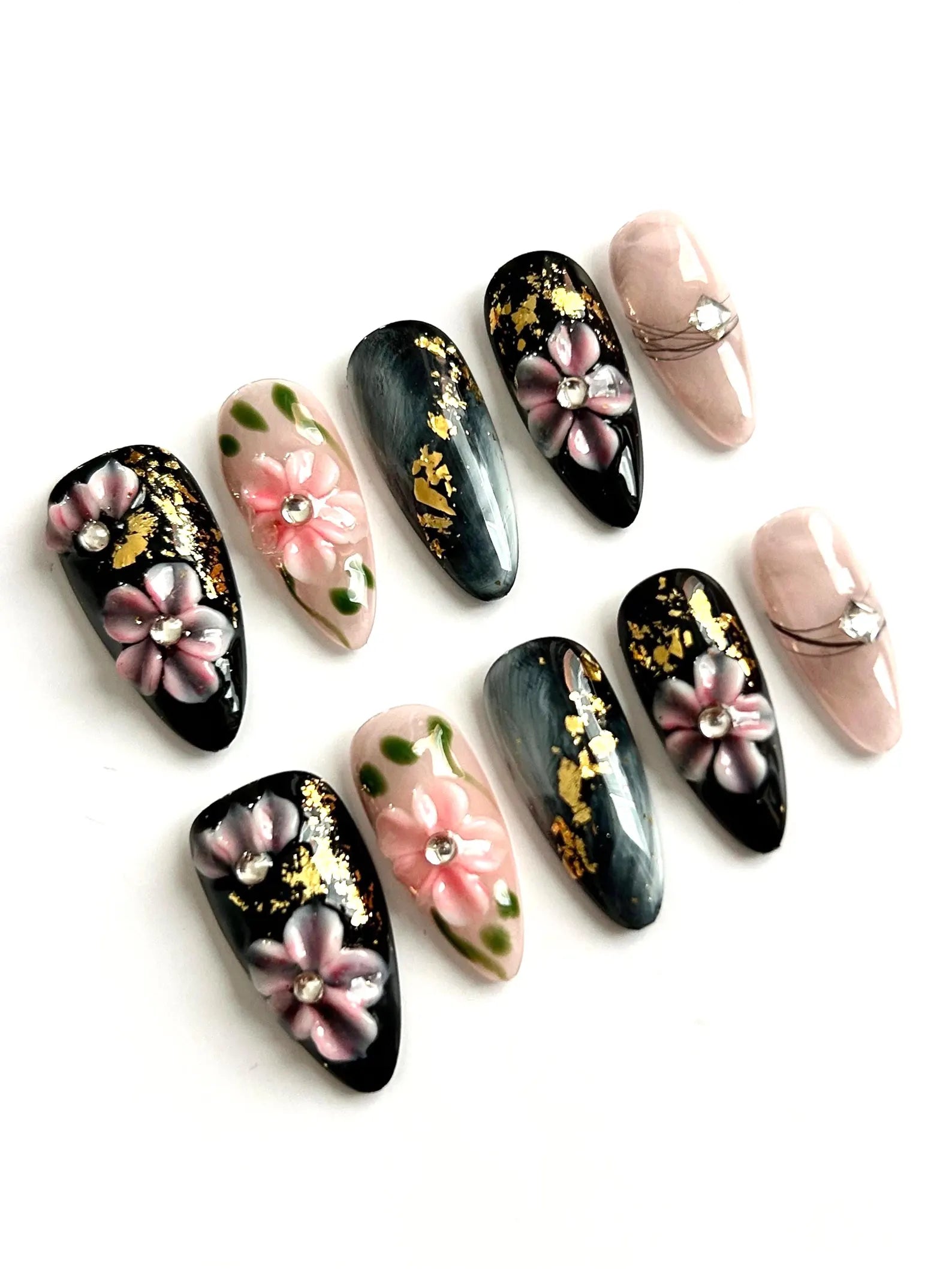Black and smoky grey bases decorated with 3D pink flowers, rhinestones, and gold foil for a luxurious, dramatic set.