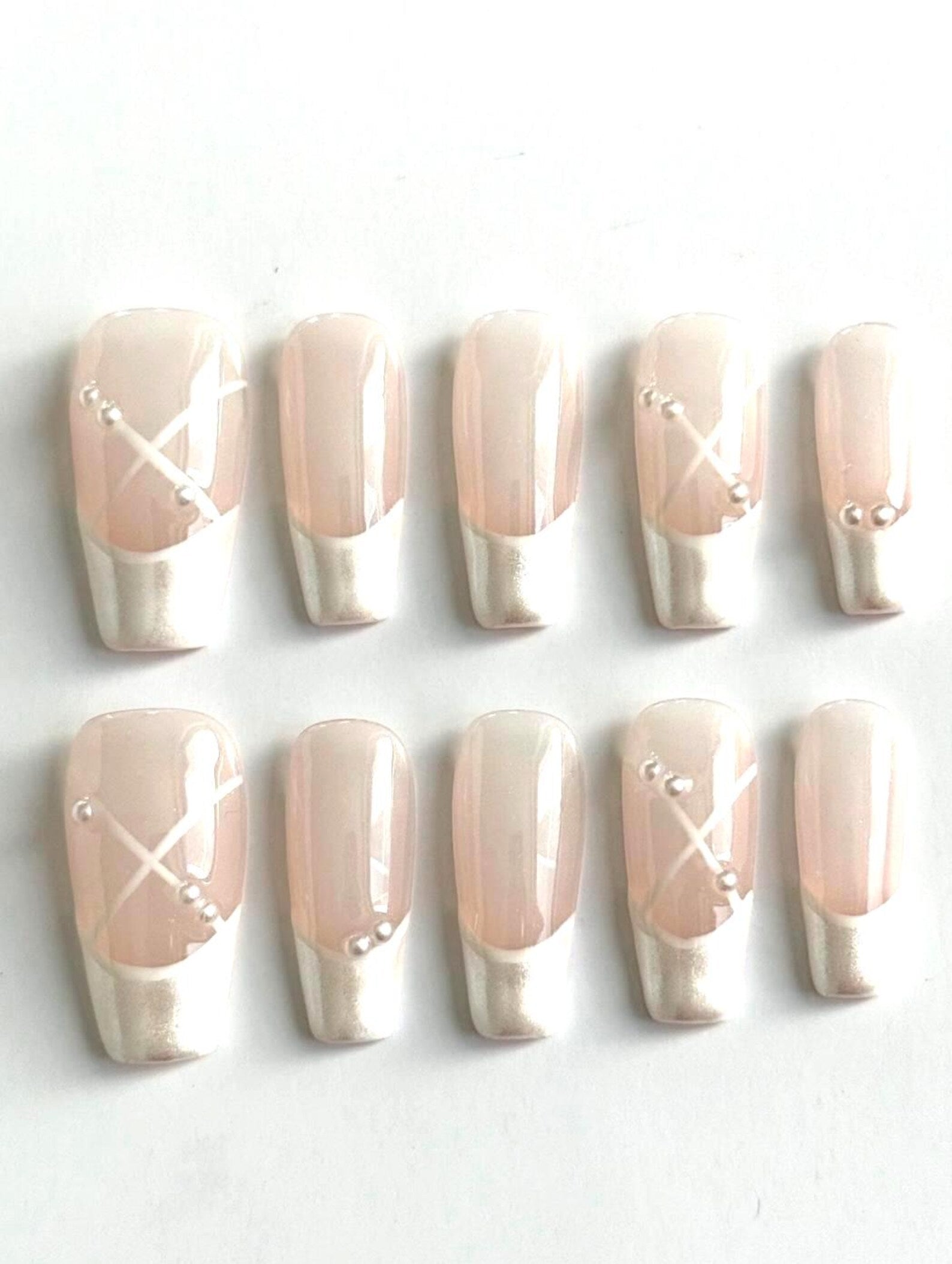 A modern twist on French tips with silver metallic ends, nude glossy bases, and pearl details. Chic and refined.