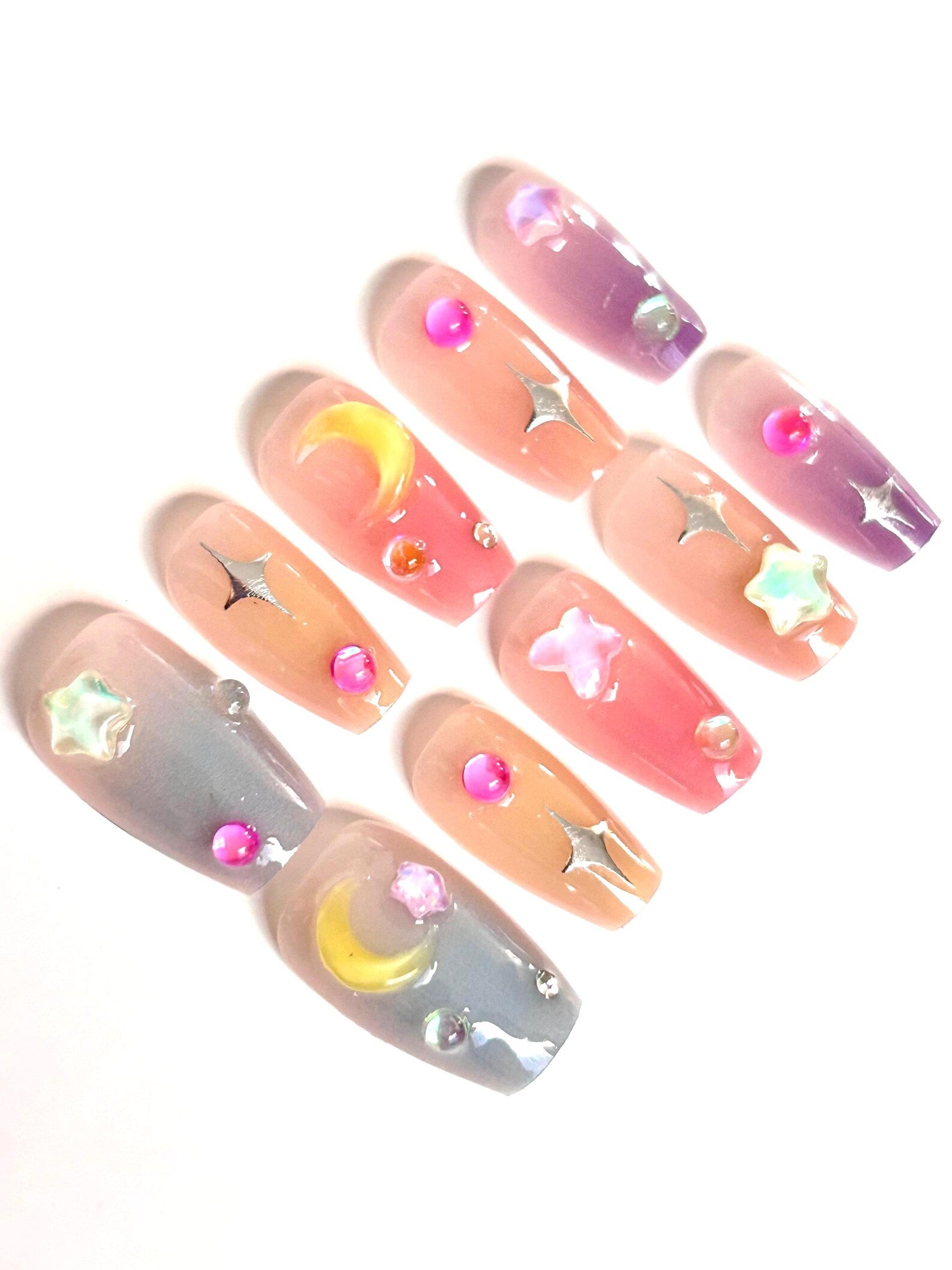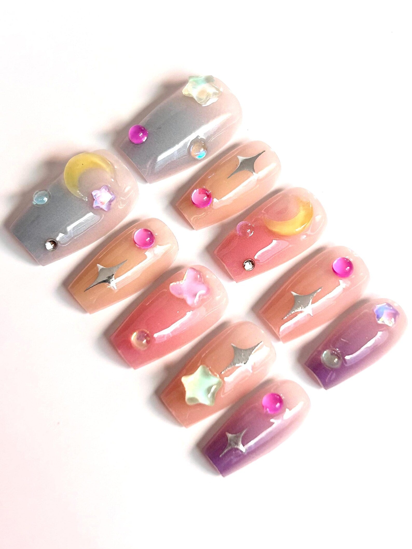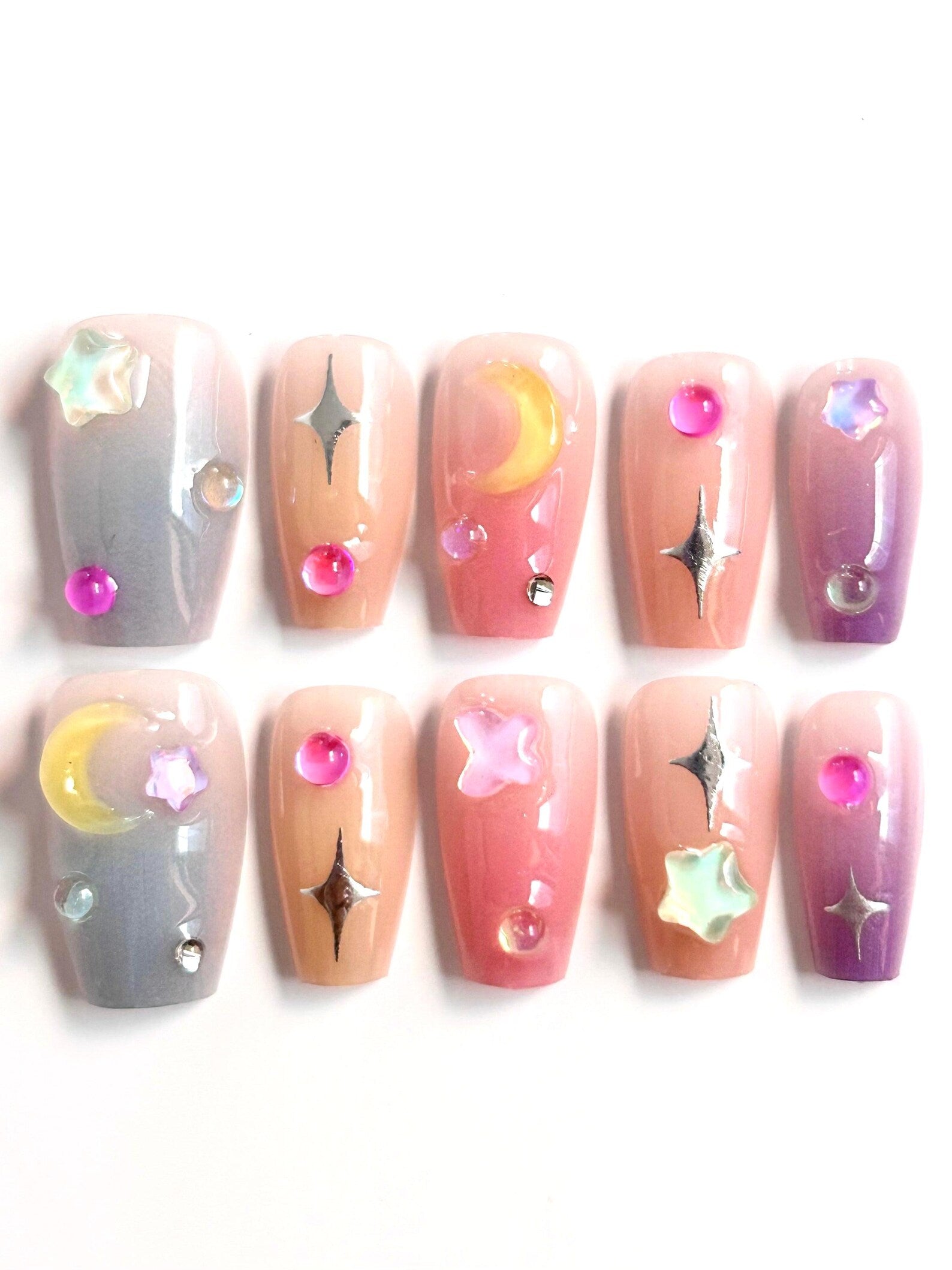 A dreamy pastel set featuring nude-to-pink ombré bases with moons, stars, rhinestones, and sparkly accents for playful Y2K vibes.