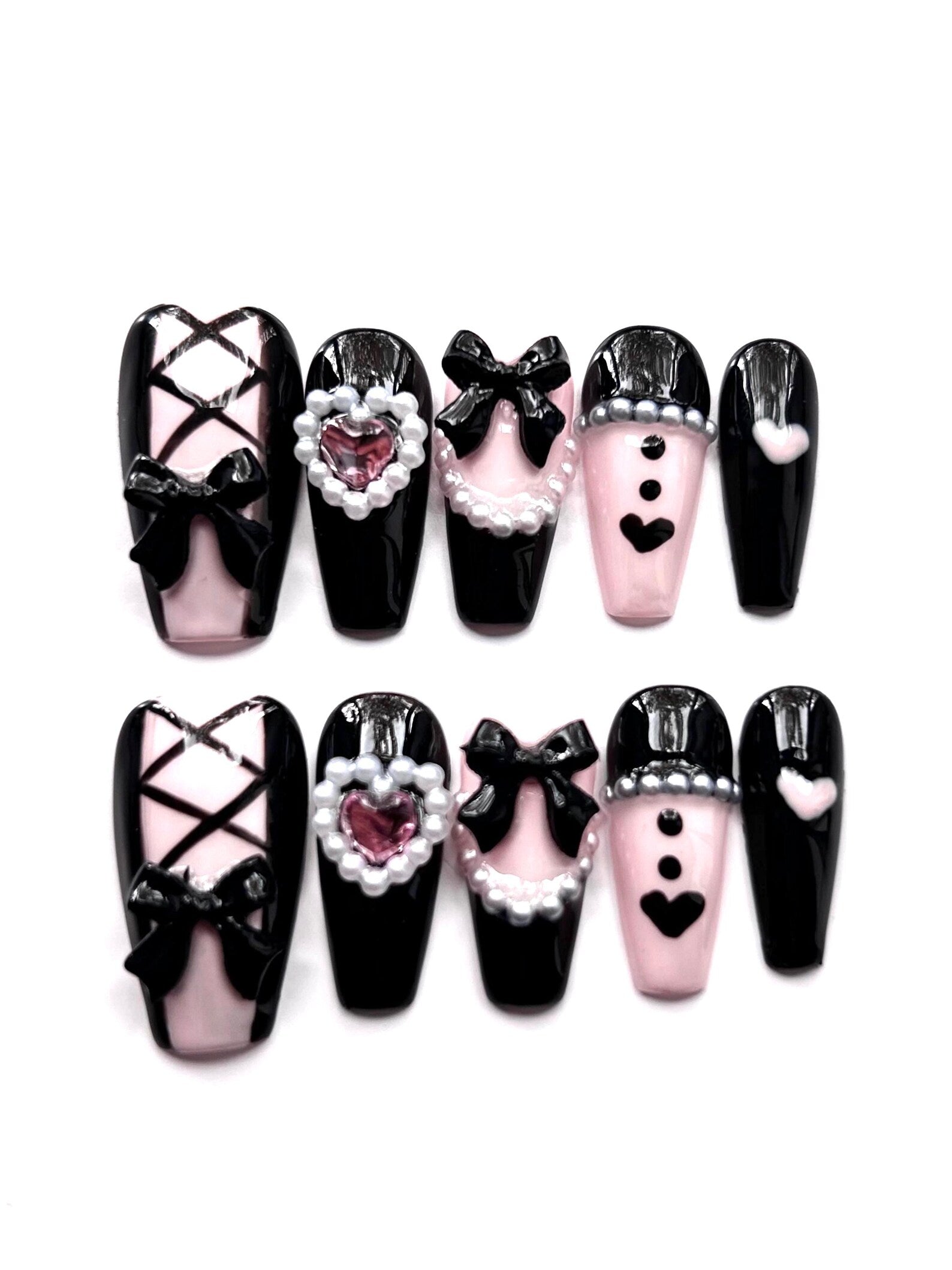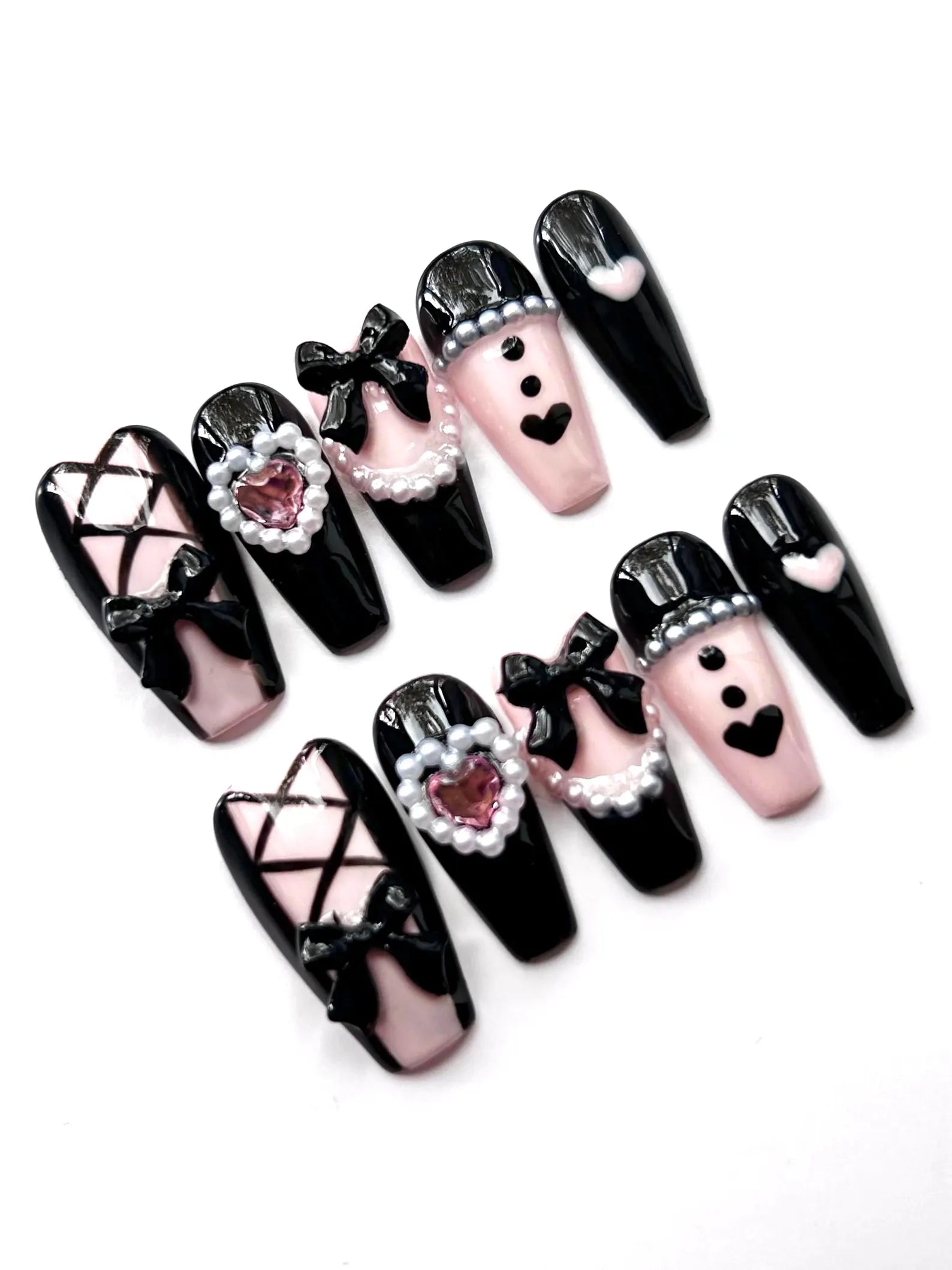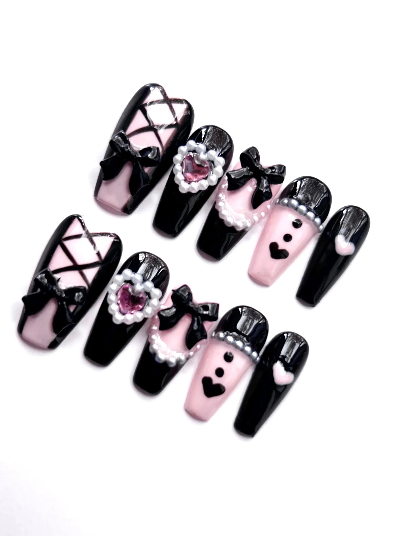 Sweet meets dark in this gothic-inspired set. Featuring a mix of glossy black and blush pink bases, each nail is decorated with bold 3D charms—oversized bows, pearl frames, sculpted hearts, and playful button-like details. The dramatic coffin shape enhances the edgy aesthetic while still embracing a touch of femininity. Perfect for those who love Y2K kawaii vibes with a gothic twist.