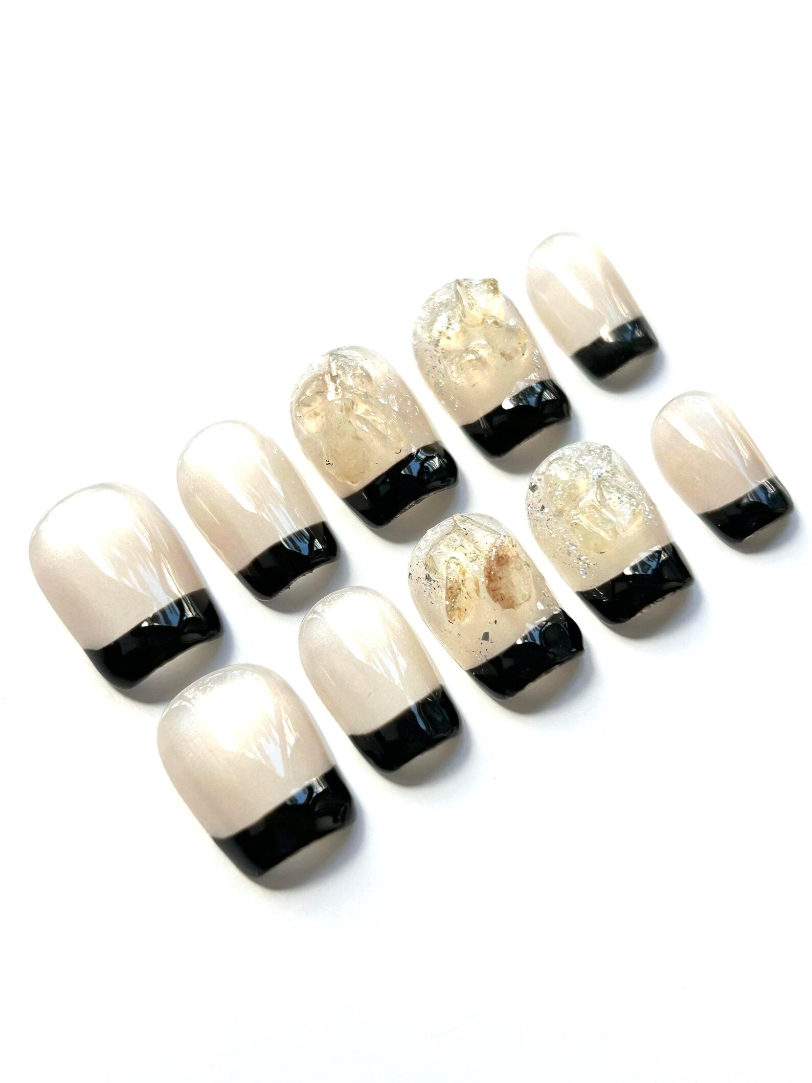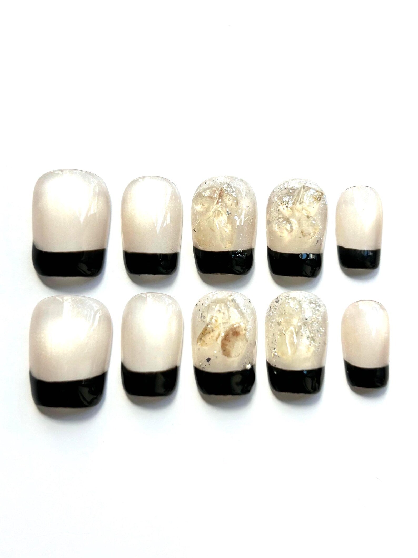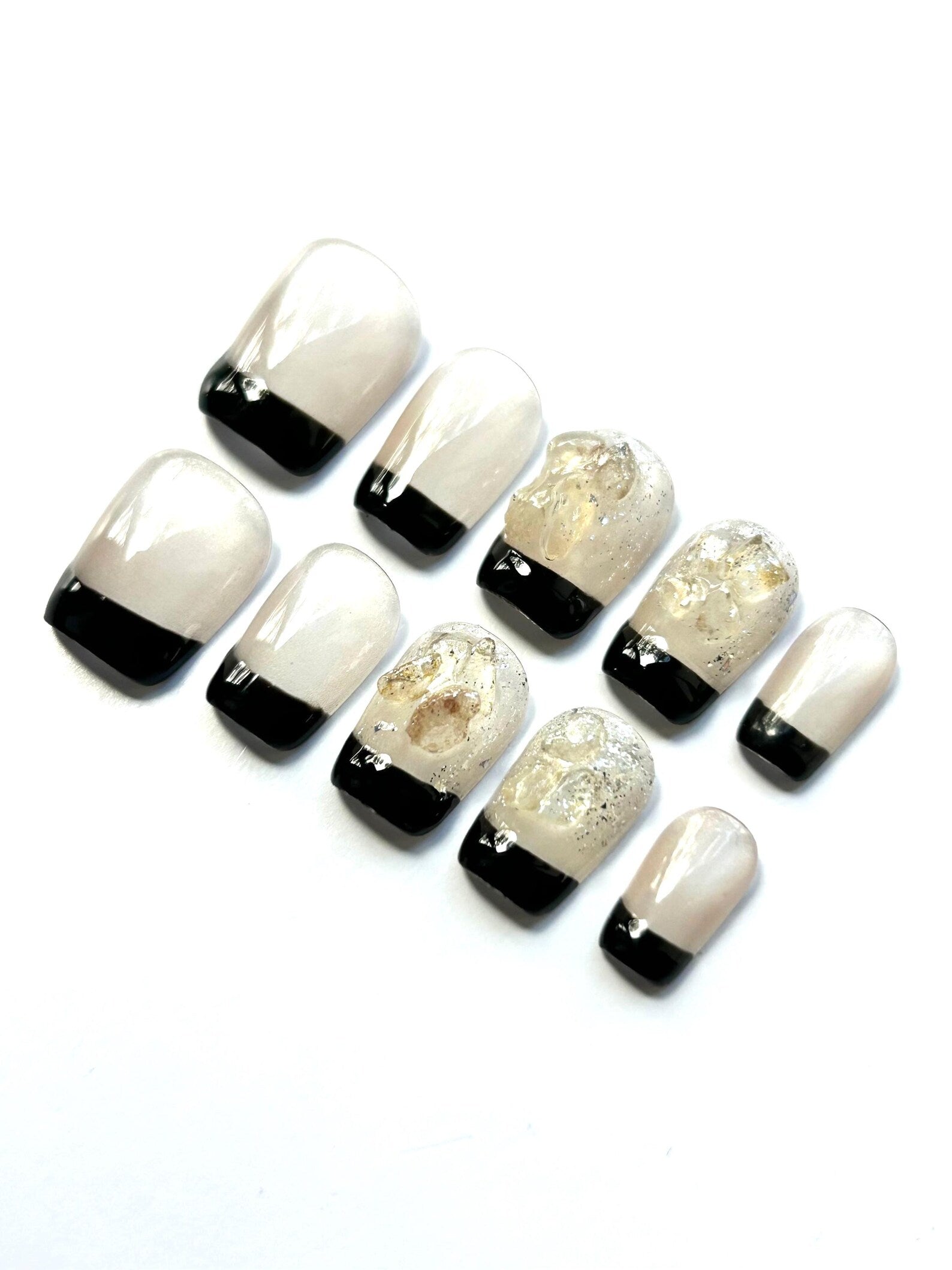 A modern twist on the timeless French manicure. This set pairs a pearly nude base with sleek black French tips for sharp sophistication. Two accent nails are elevated with encapsulated gold foil details beneath a glossy clear overlay, adding a touch of texture and luxe shine. The short square shape makes these nails easy to wear daily while still delivering standout style with an artistic edge.