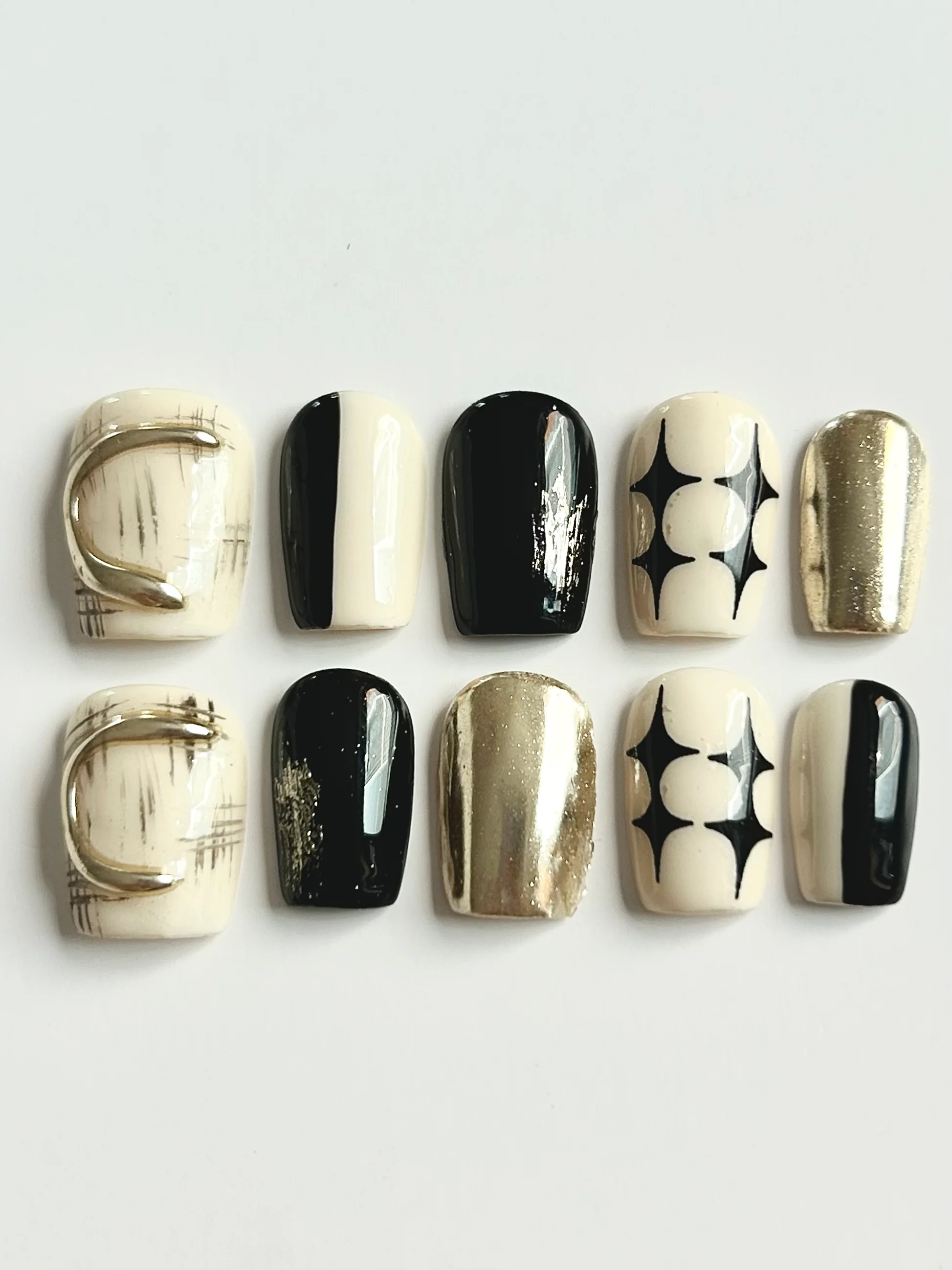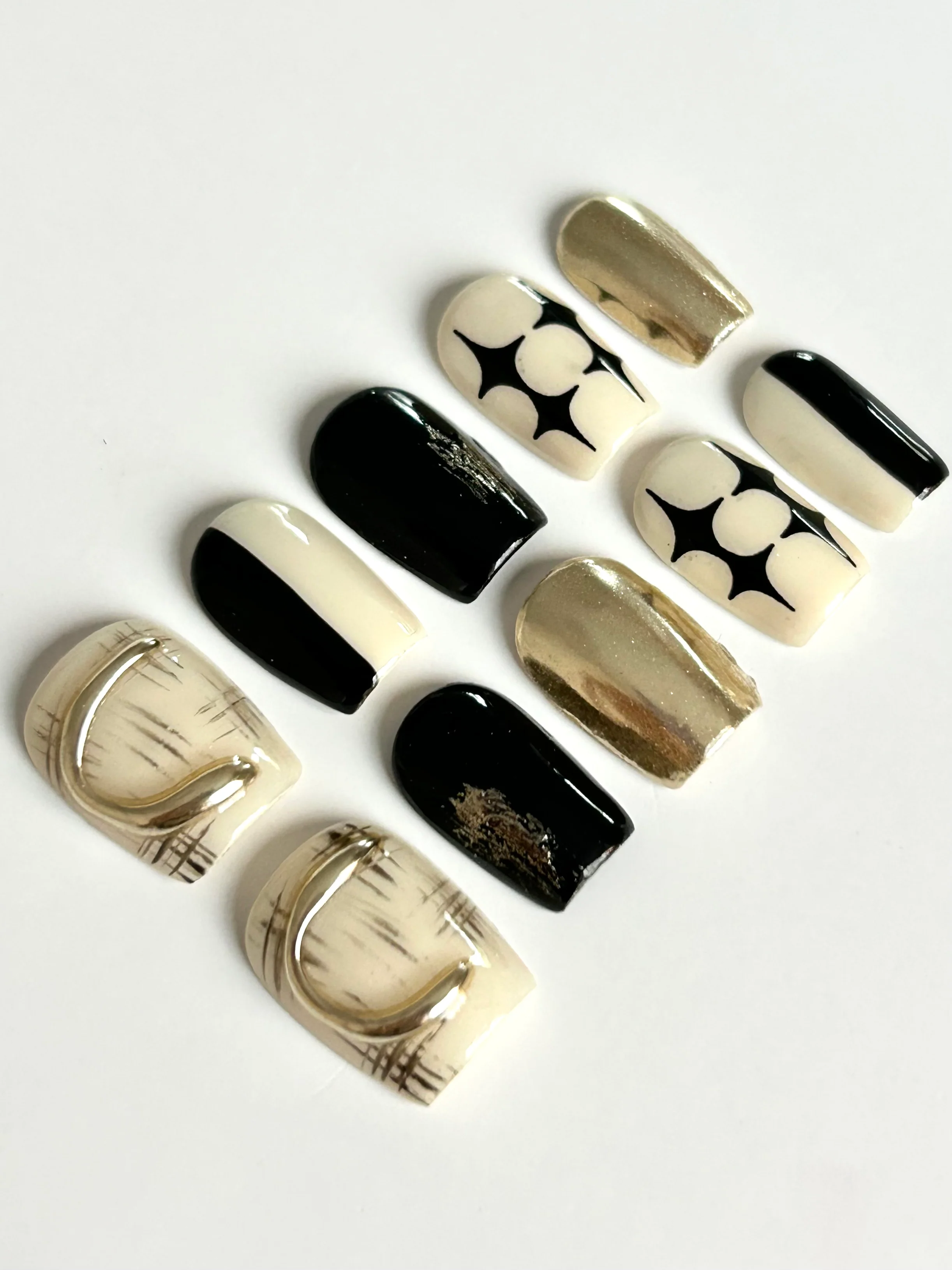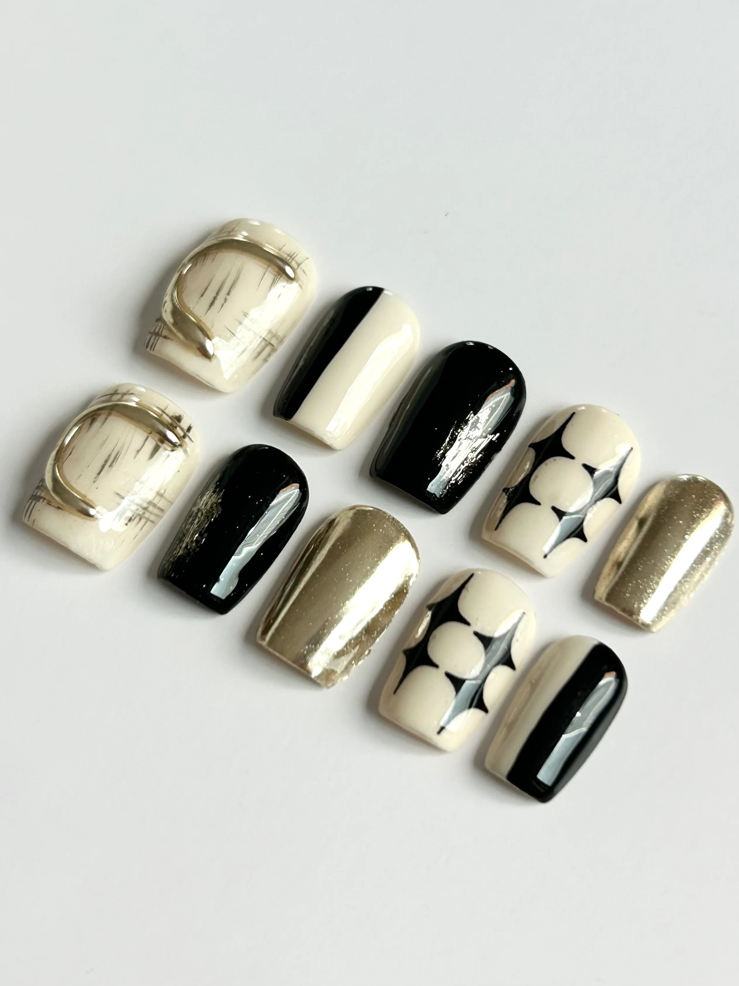 Striking black and gold contrast nails with chrome metallic finishes and graphic designs for a high-fashion edge.
