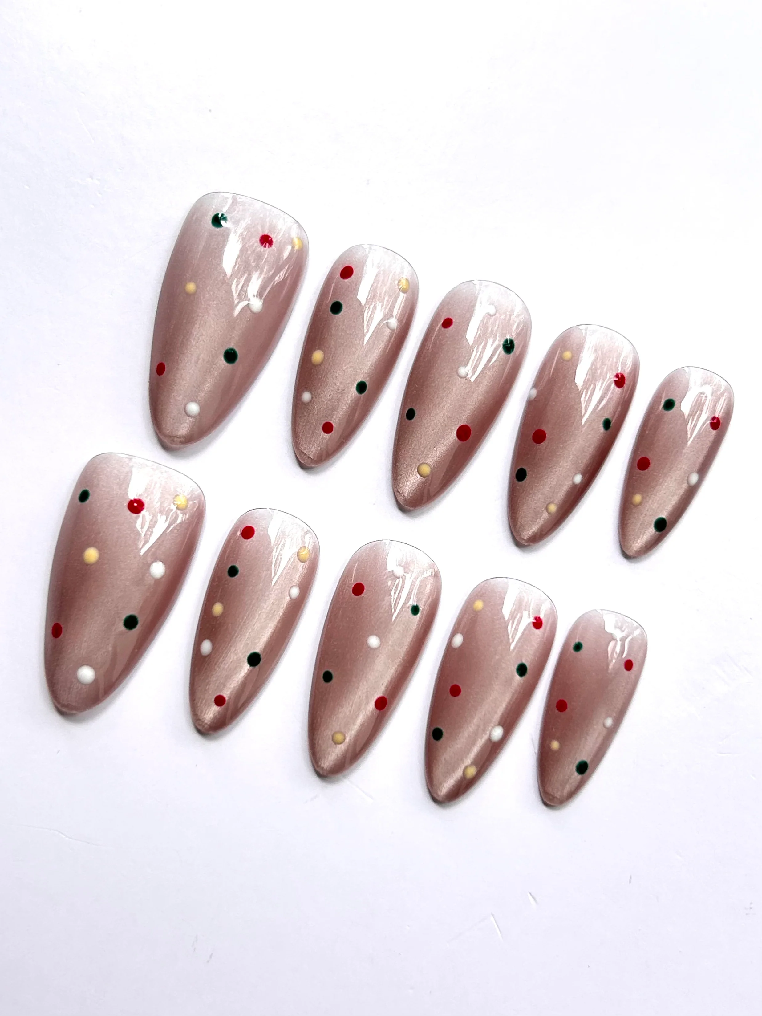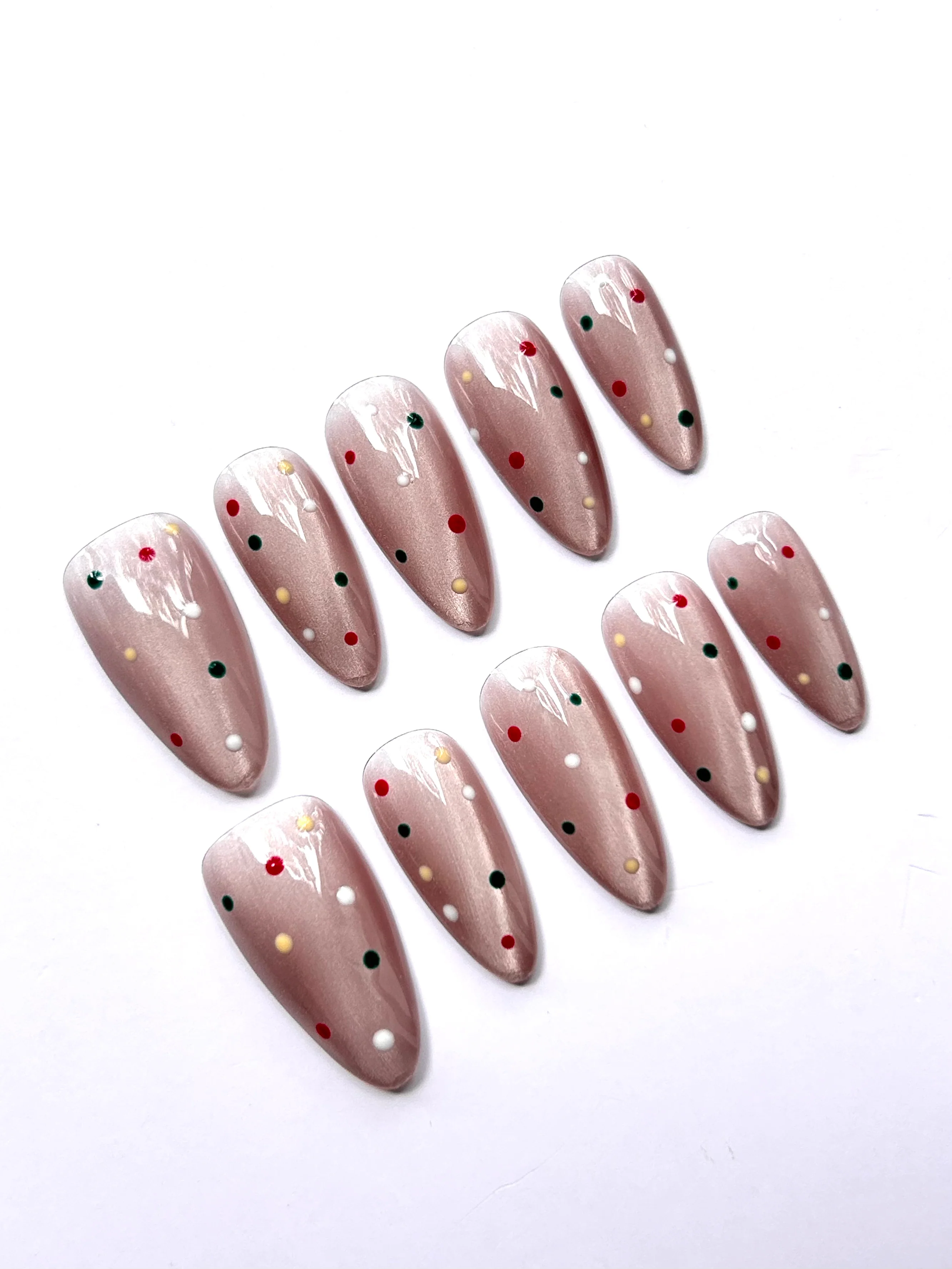 A glossy mauve base with playful polka dots in red, white, yellow, and green for a whimsical, party-ready vibe.