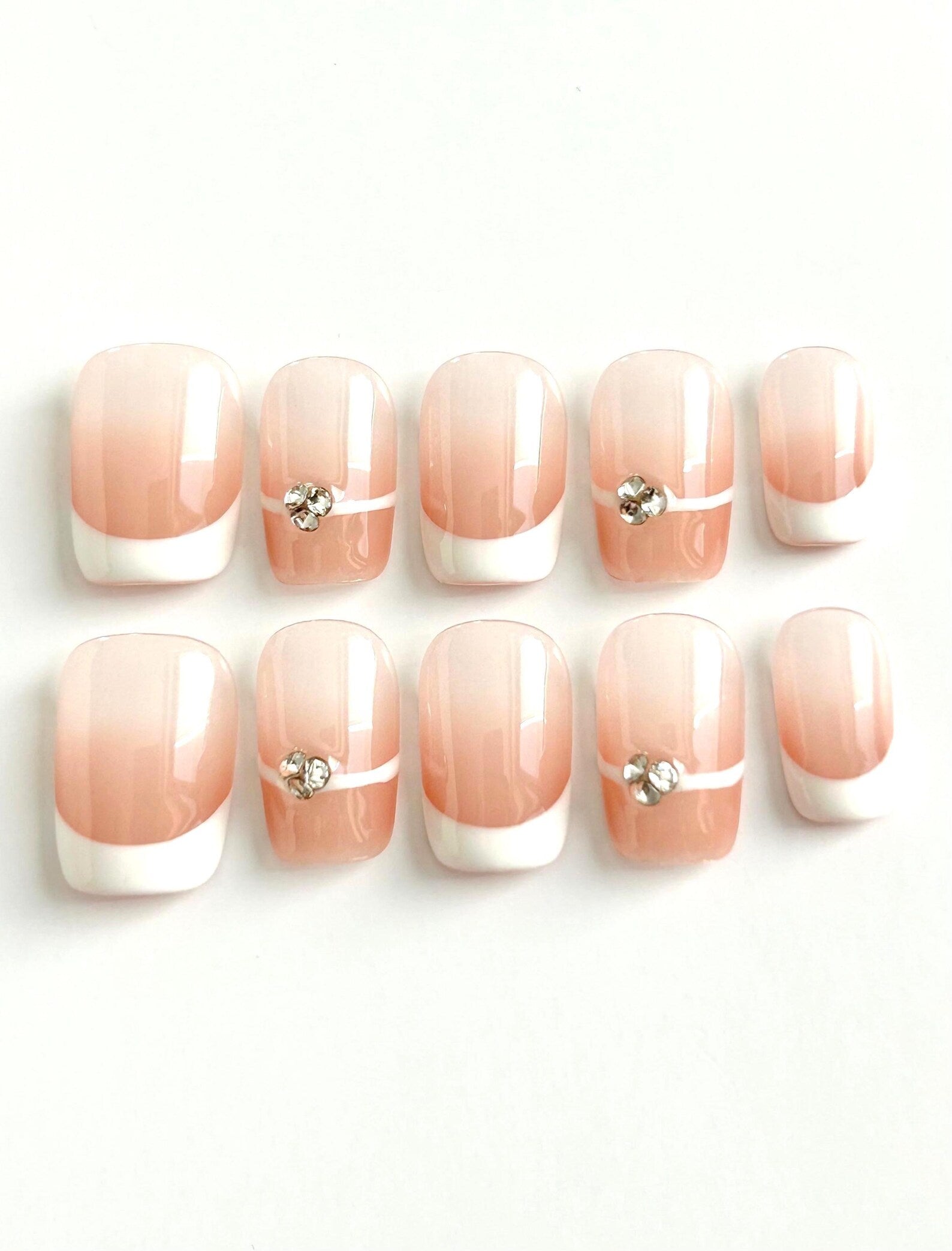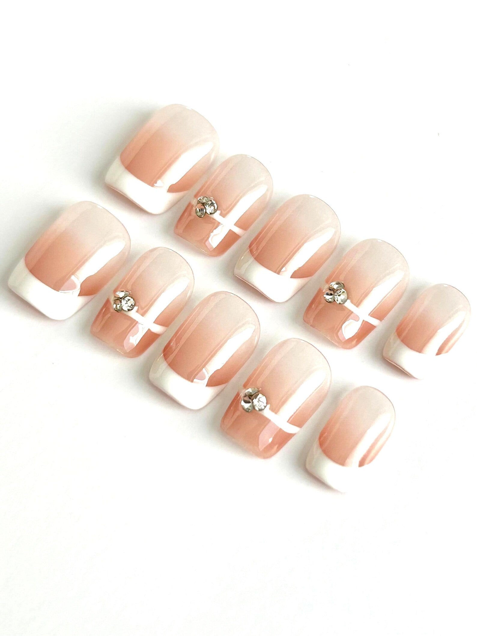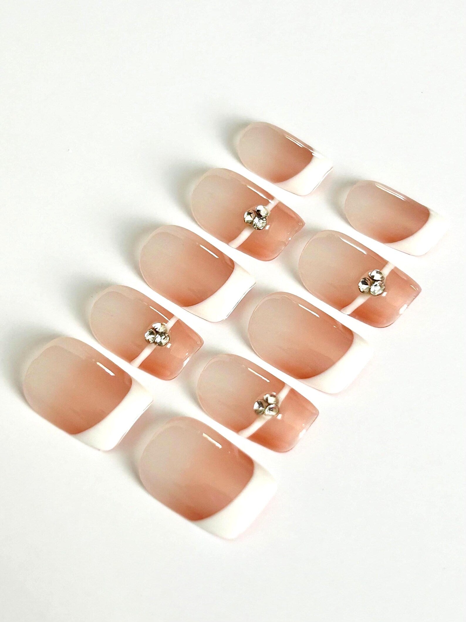 A timeless French tip set with nude-to-white ombré bases finished with subtle rhinestone accents for extra elegance.