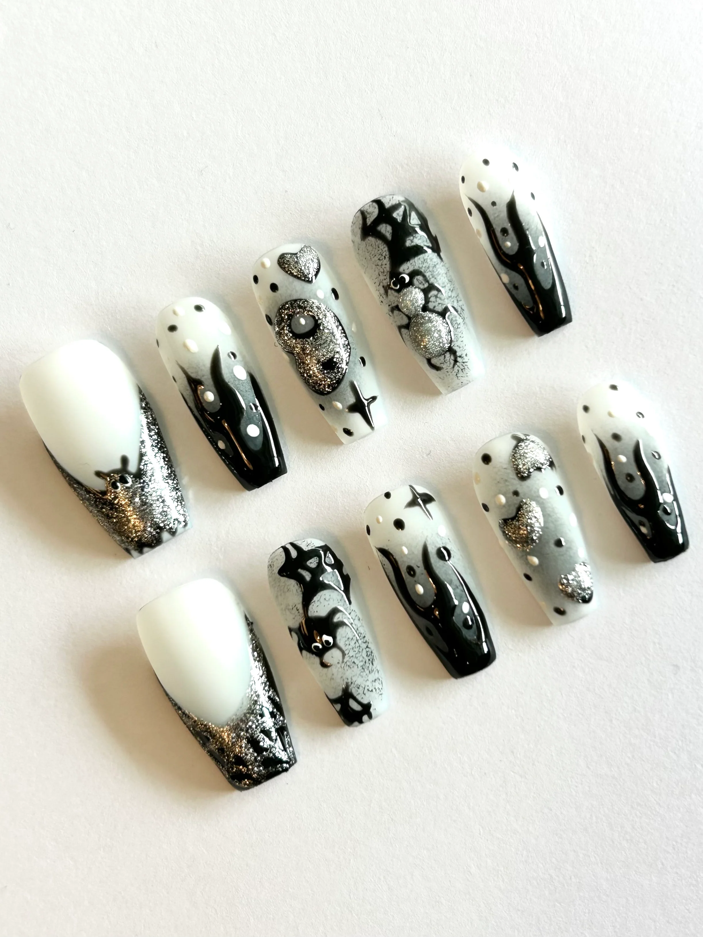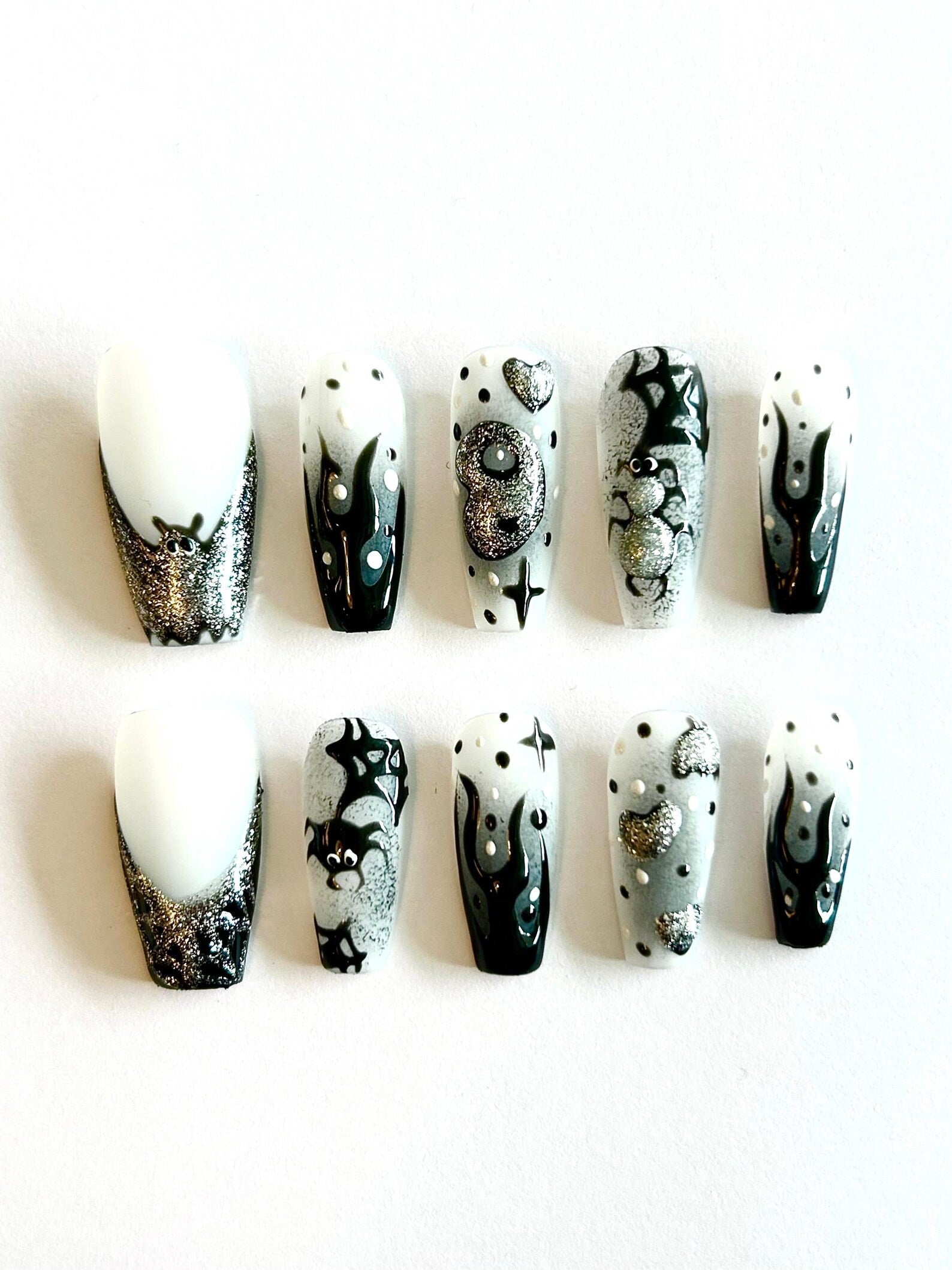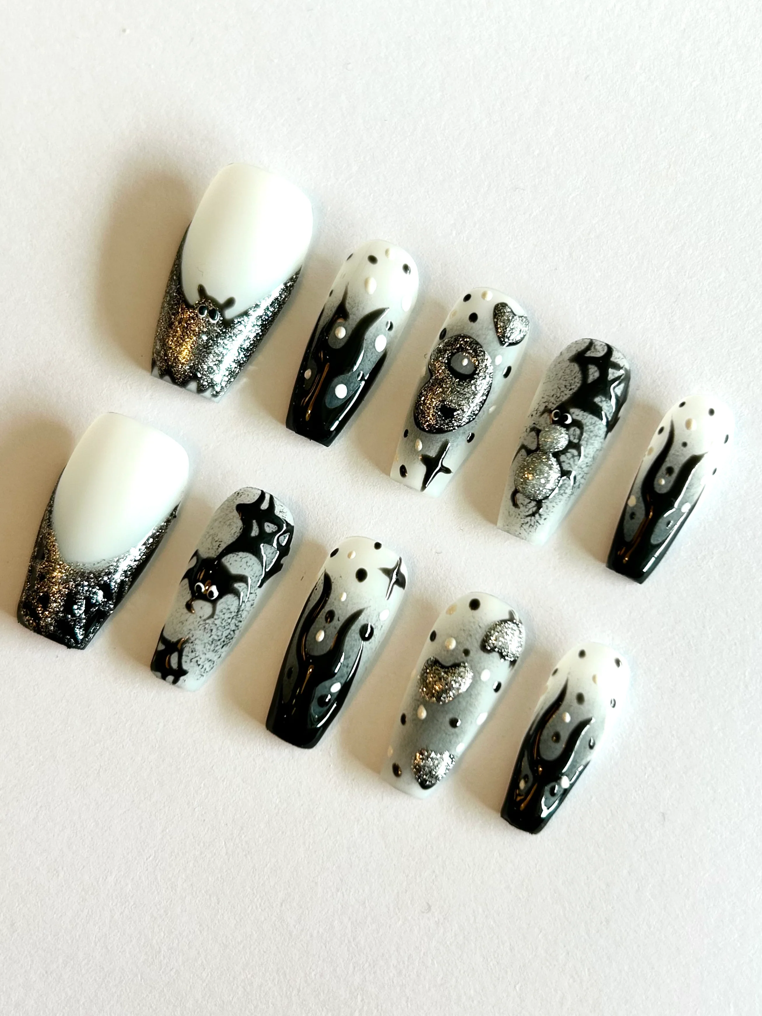 A hauntingly chic black and white Halloween gel nail set featuring spooky bats, ghost faces, glitter hearts, and eerie gradient flames. Finished with sparkling silver accents, this set blends cute and creepy for the ultimate October manicure.