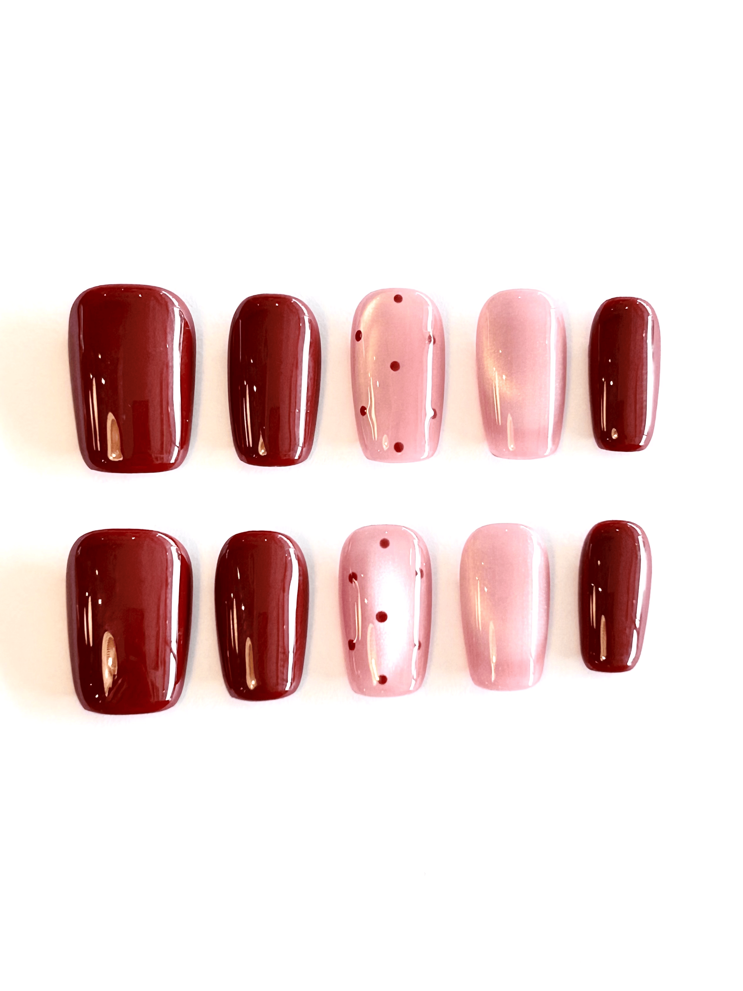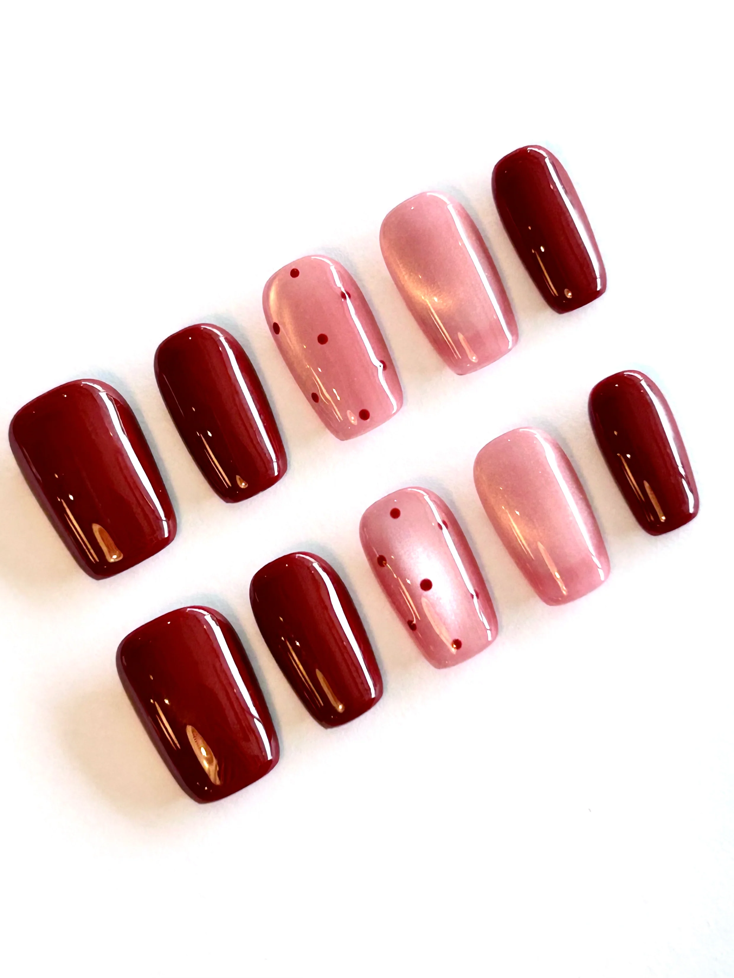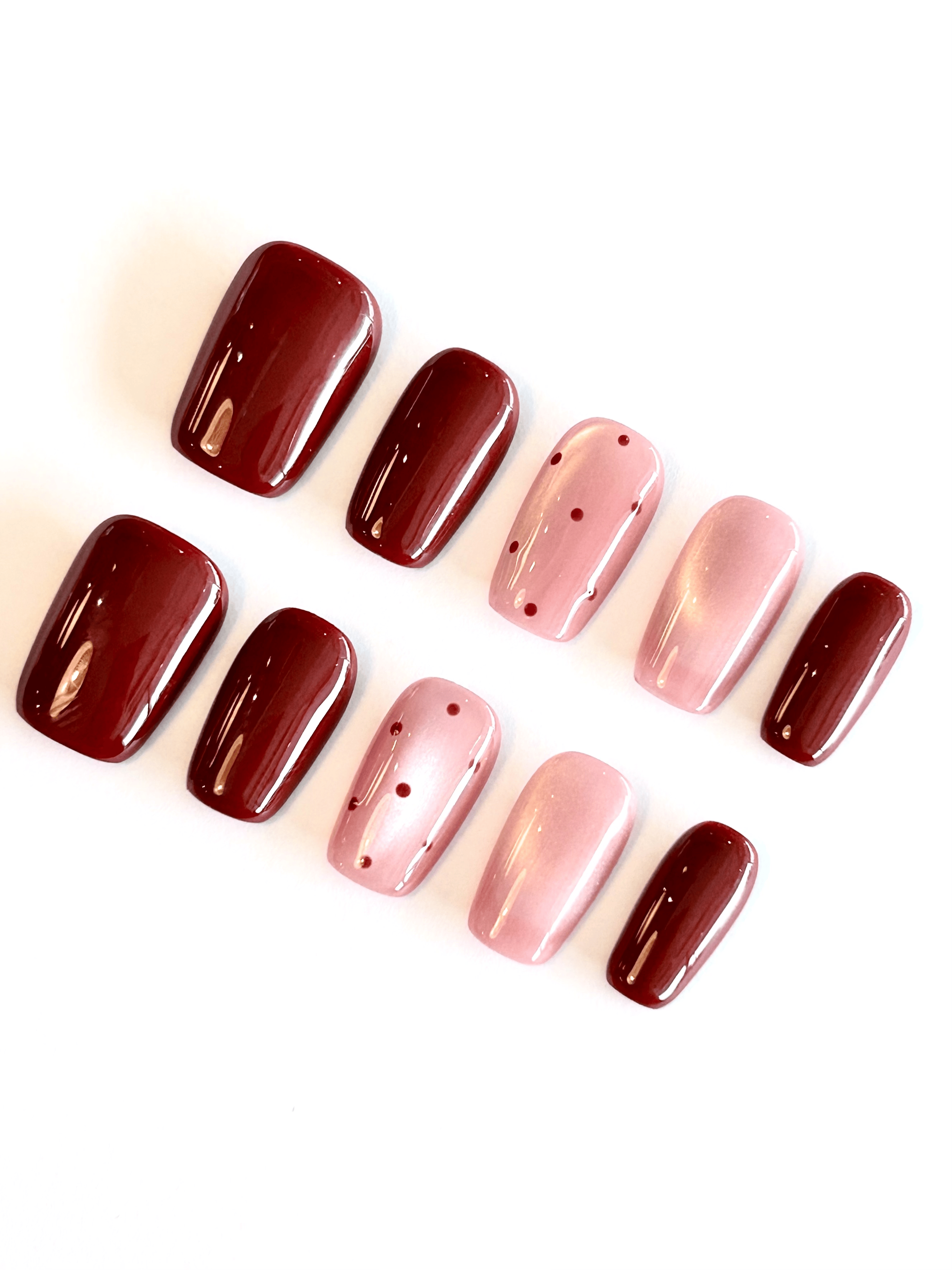 A chic autumn-inspired press on nail set featuring deep maroon and pink cat-eye gel nails with minimalist dot accents. These glossy fall press on nails are perfect for cozy season styling, offering a modern, wearable look that transitions effortlessly from day to night. Ideal for fall nail trends, work-friendly manicures, and reusable gel nails lovers seeking a salon-quality finish at home.