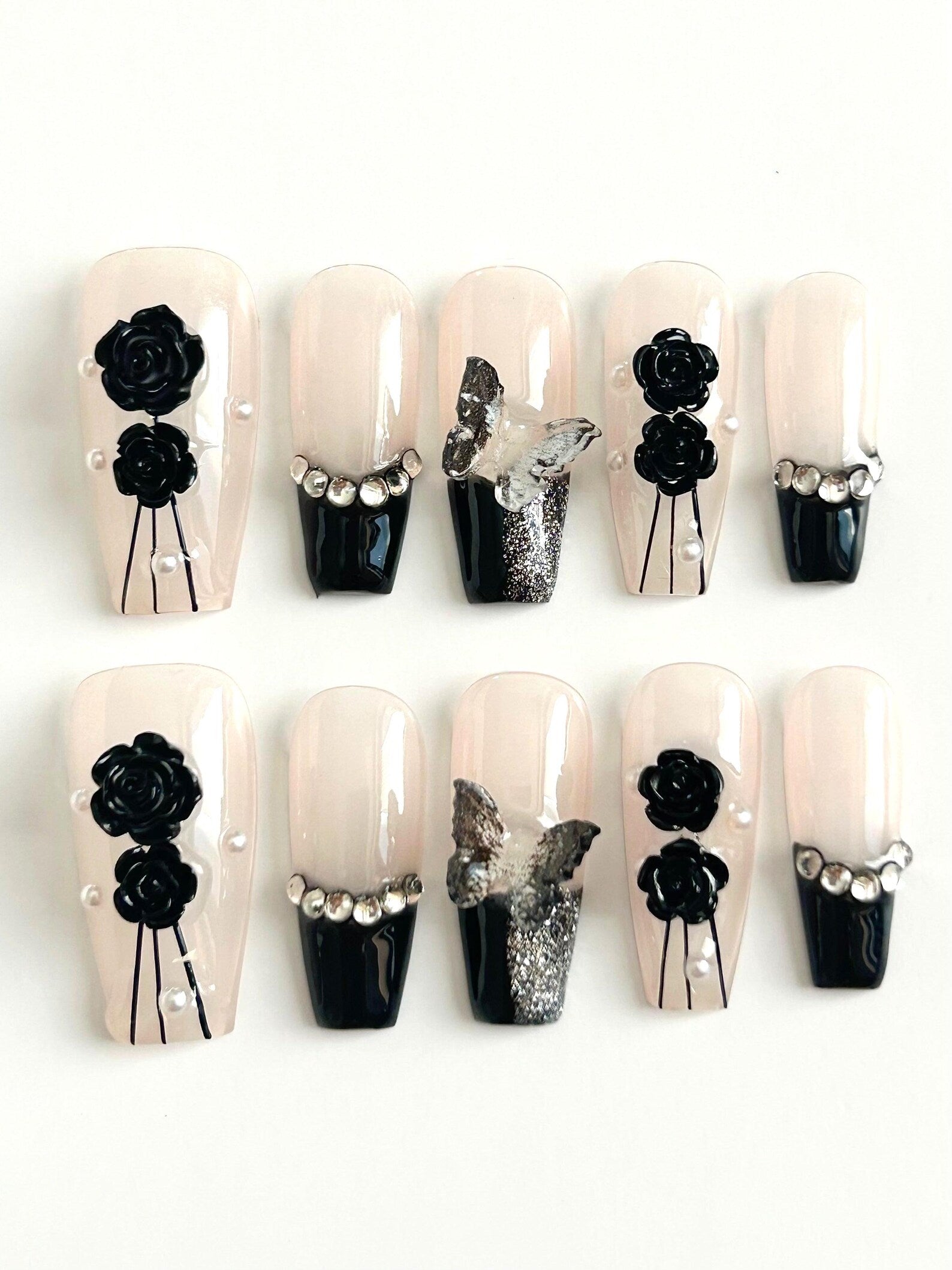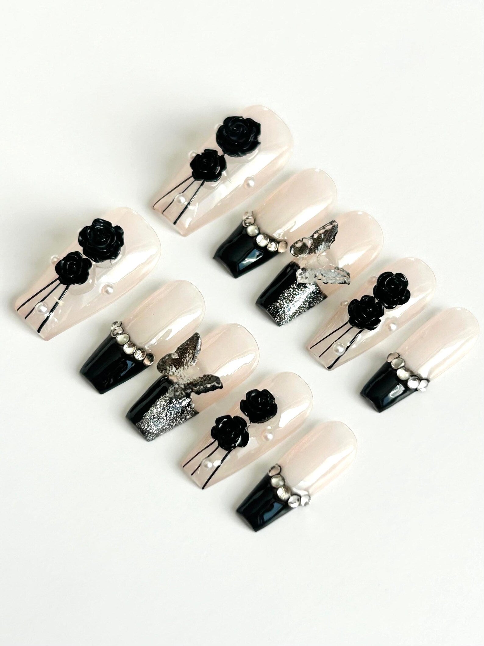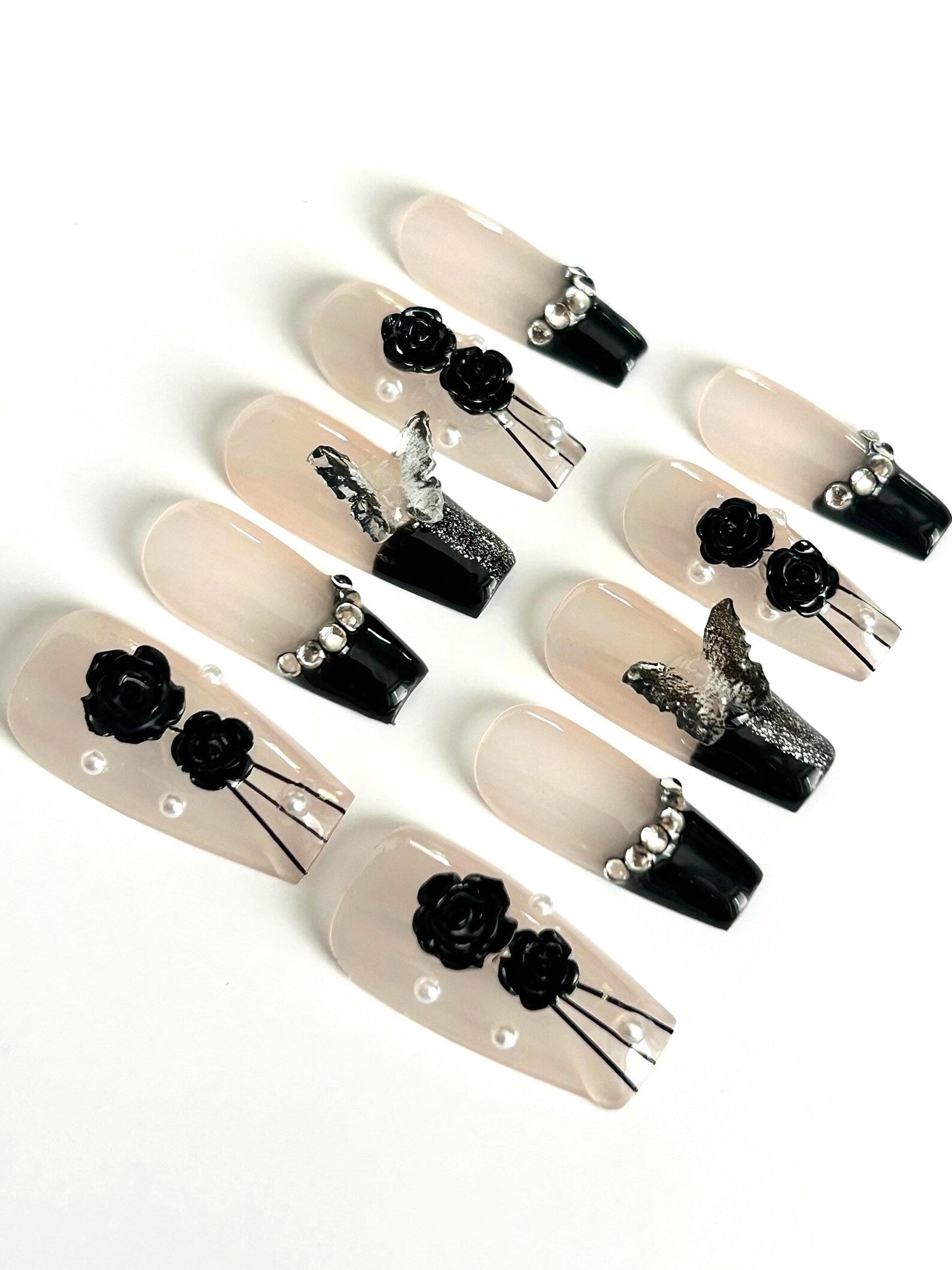 Nude glossy bases paired with black roses, rhinestone chains, and silver butterflies for a dark romantic gothic vibe.