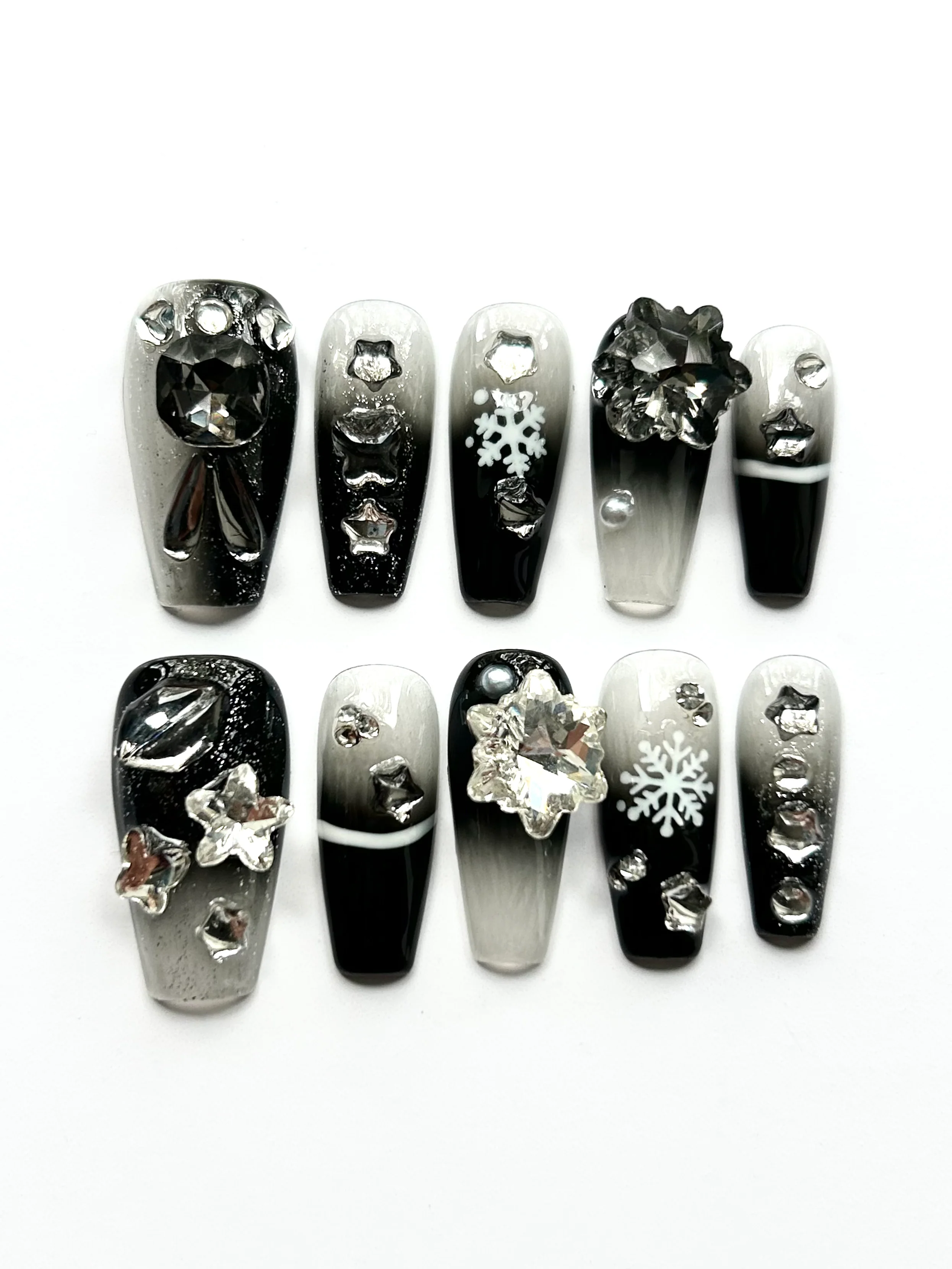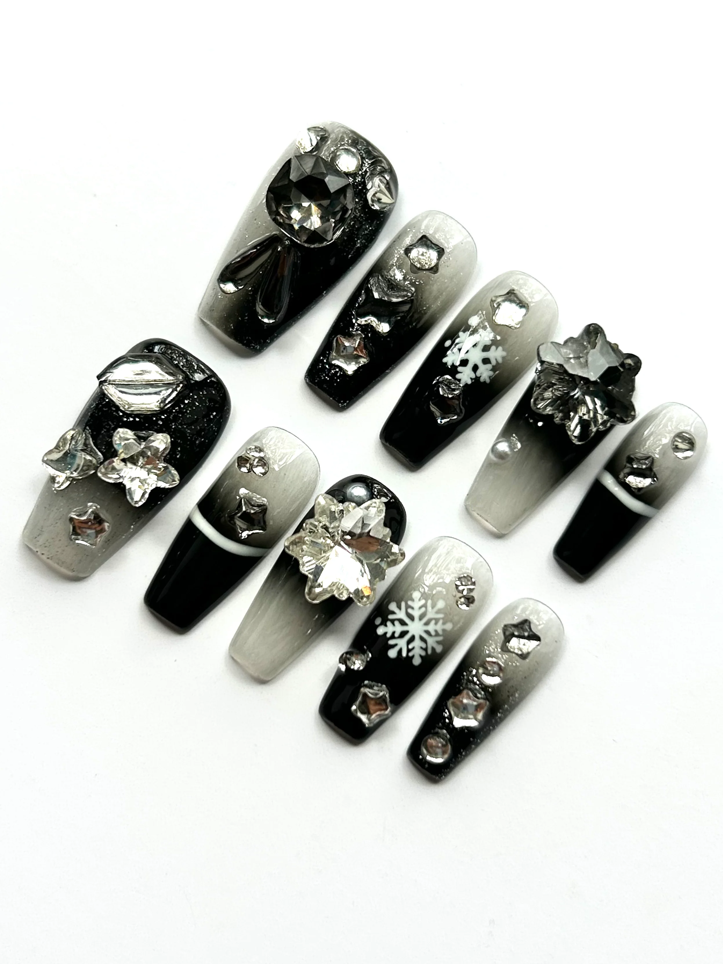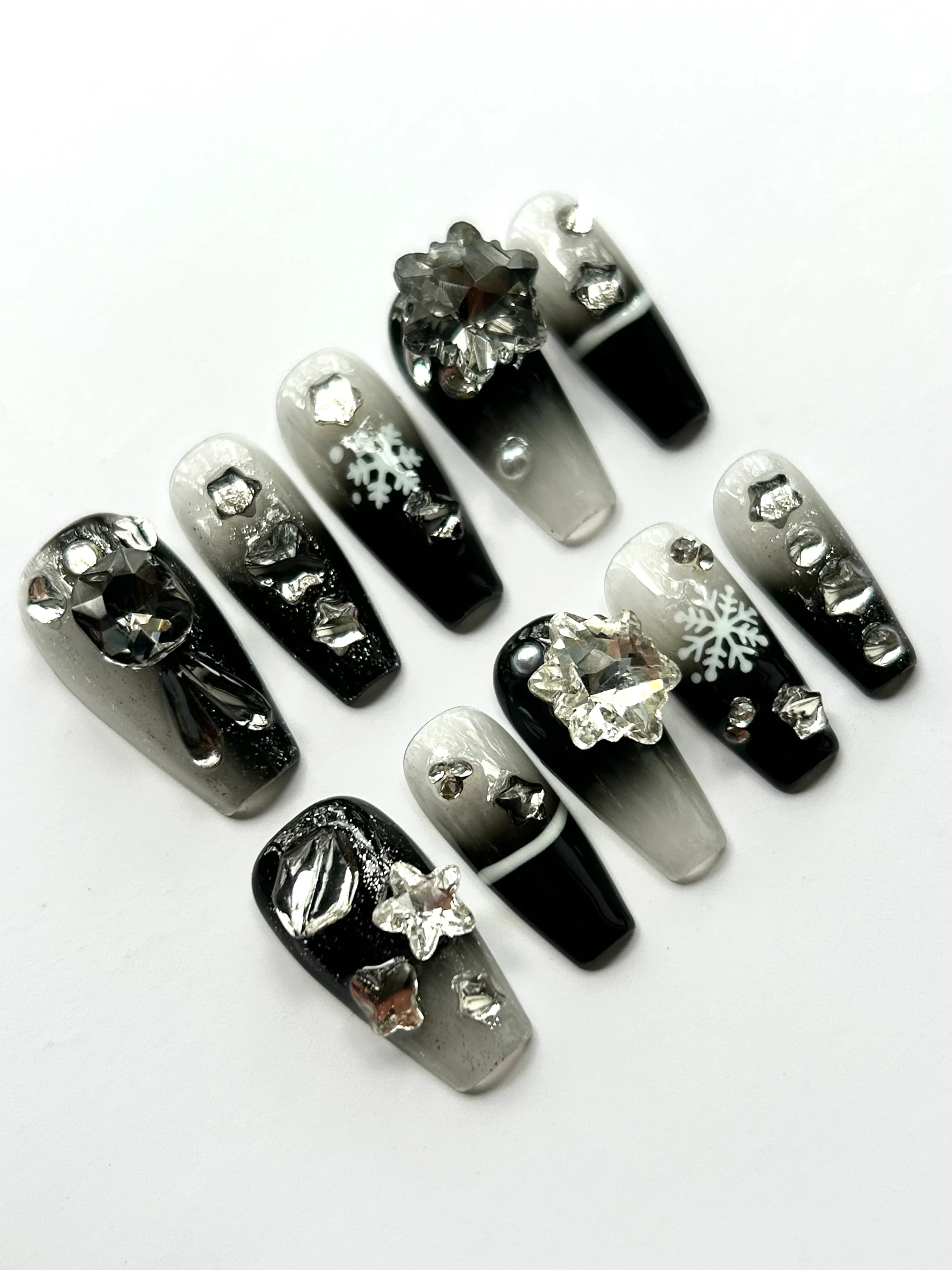 A frosty winter dream. These nails feature smoky black-to-silver cat-eye bases with sparkling rhinestones, snowflake decals, and glitter stars. With 3D crystal embellishments and a glossy finish, they radiate holiday magic, perfect for festive occasions and winter glamour.