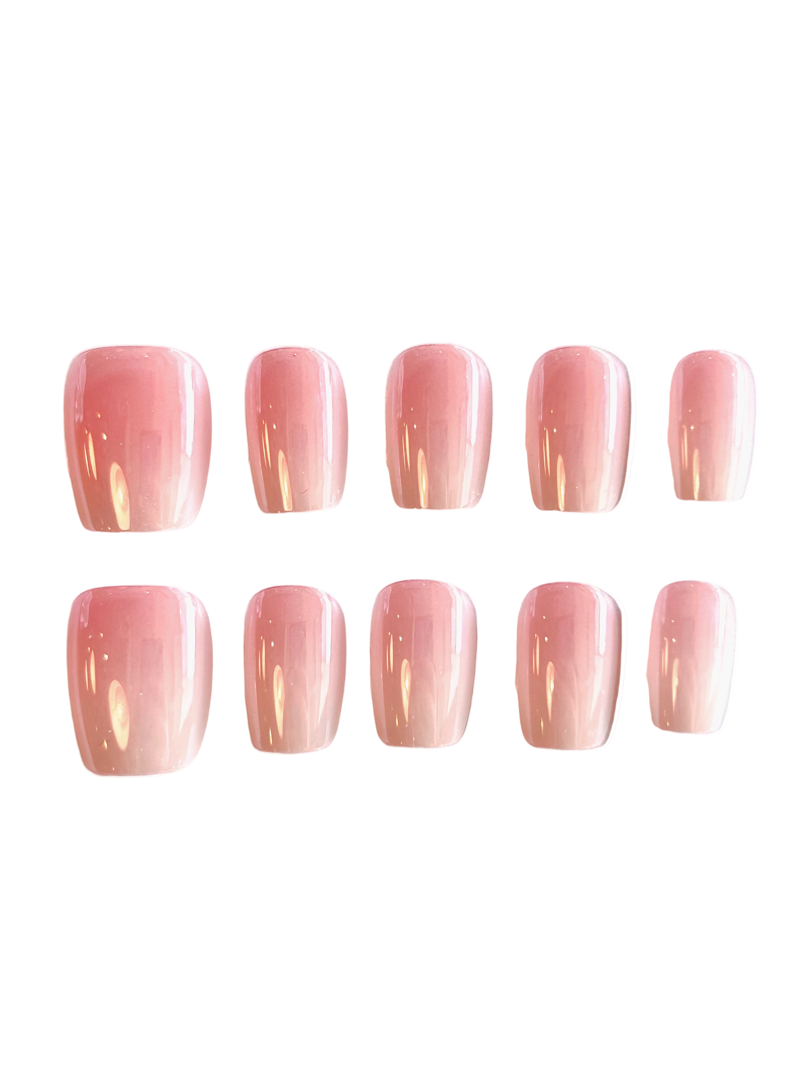 A delicate soft pink ombré cat-eye gel press on nail set with a glossy reflective sheen that gives the illusion of natural, healthy nails with a salon finish. The gradient blush tone is universally flattering—perfect for brides, everyday wear, office chic, and minimal clean girl aesthetic looks.