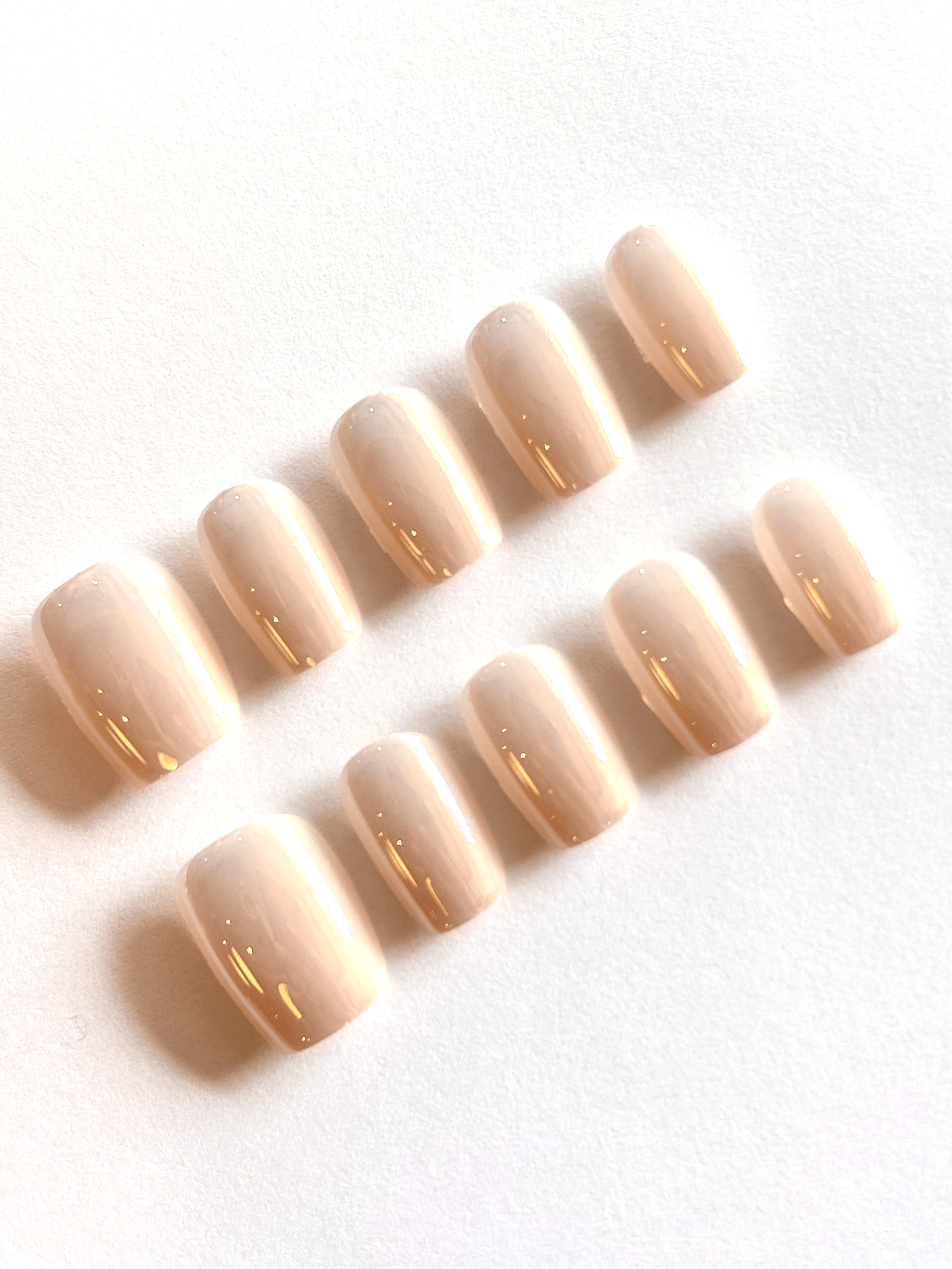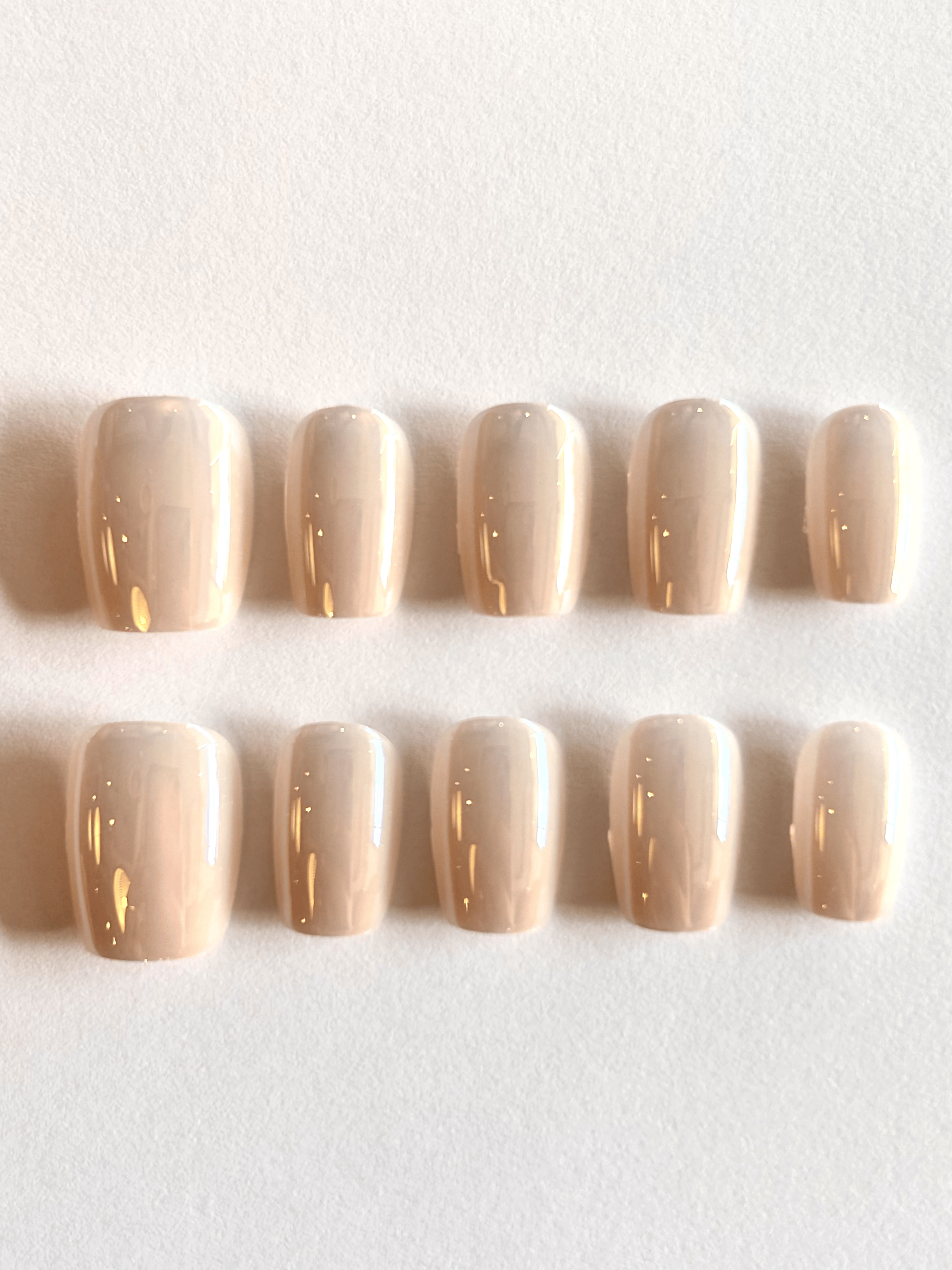 A soft neutral nude cat-eye gel press-on set with a subtle reflective shimmer that shifts beautifully under light. The square shape and glossy cat-eye finish create a clean, modern look—perfect for everyday wear, office chic, or a minimalist manicure that still feels luxurious.