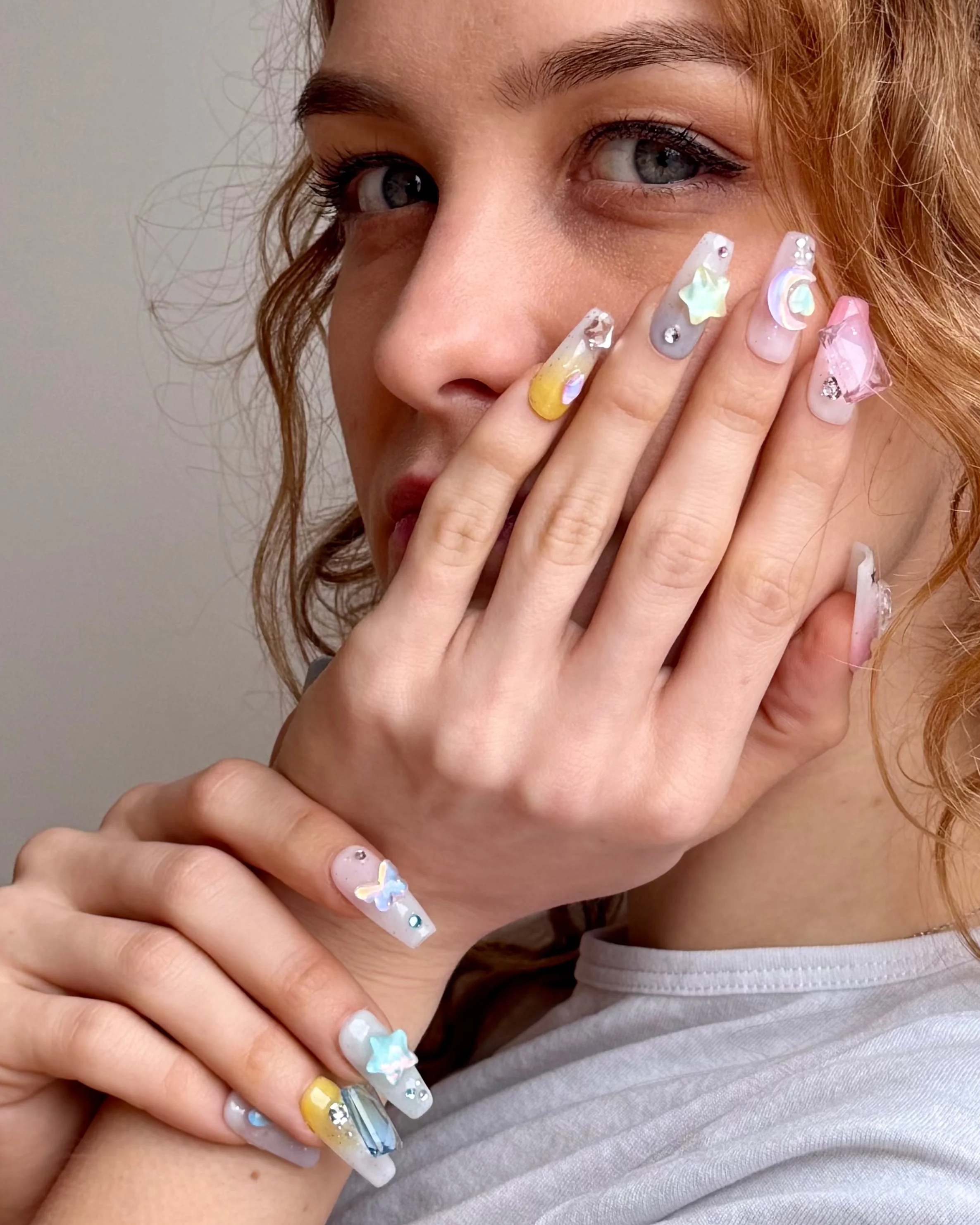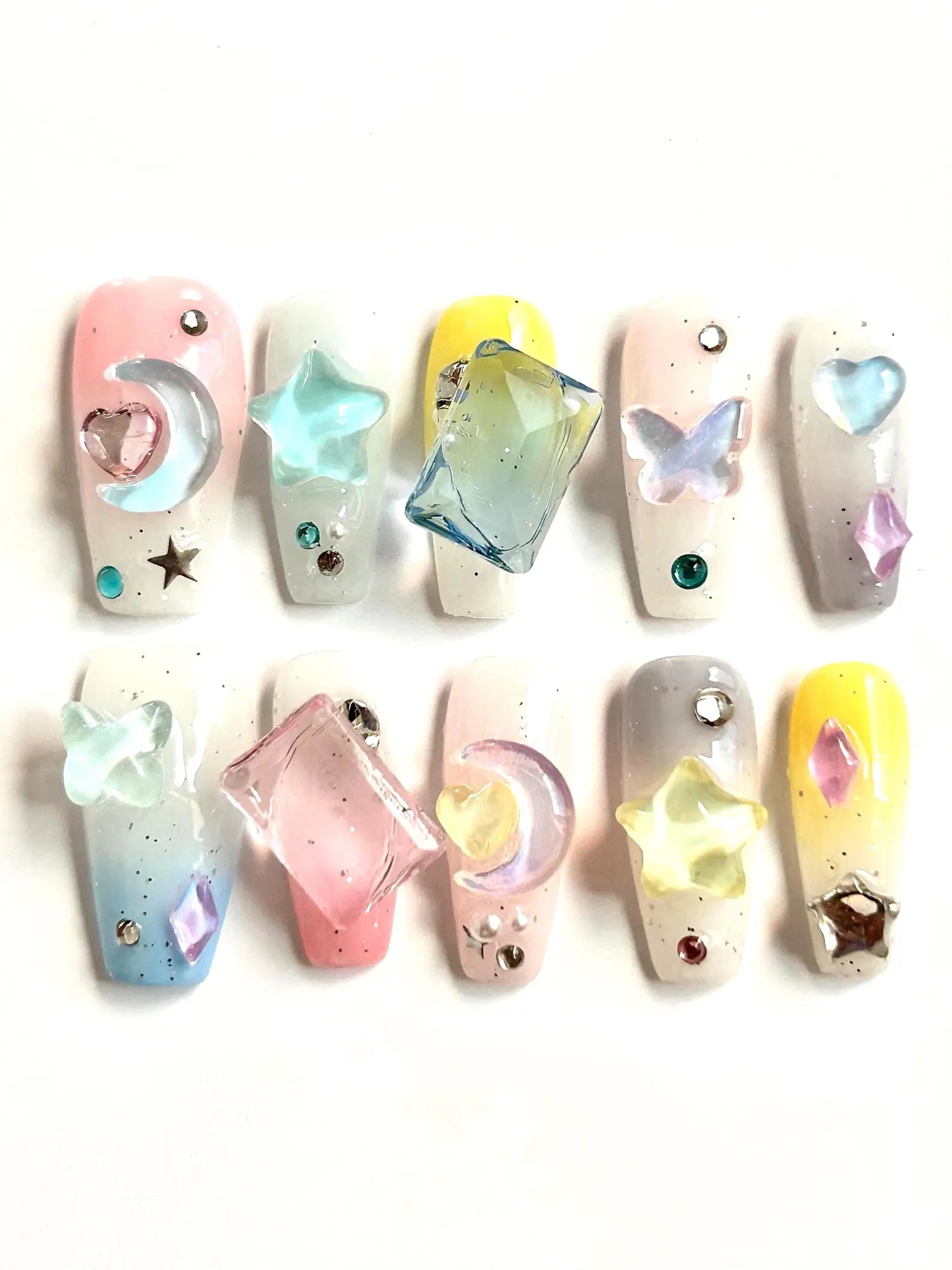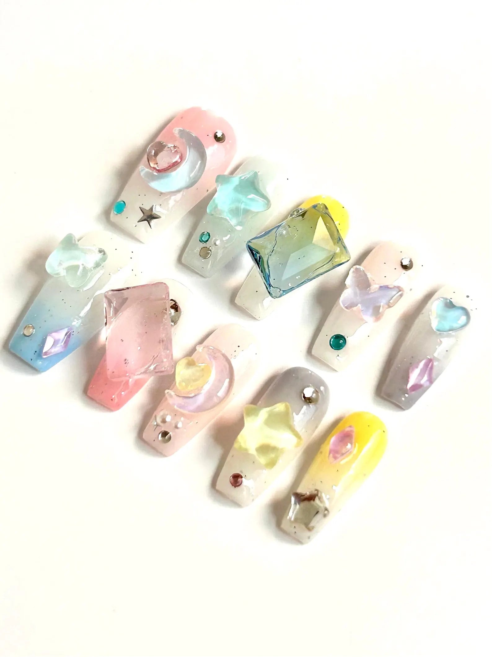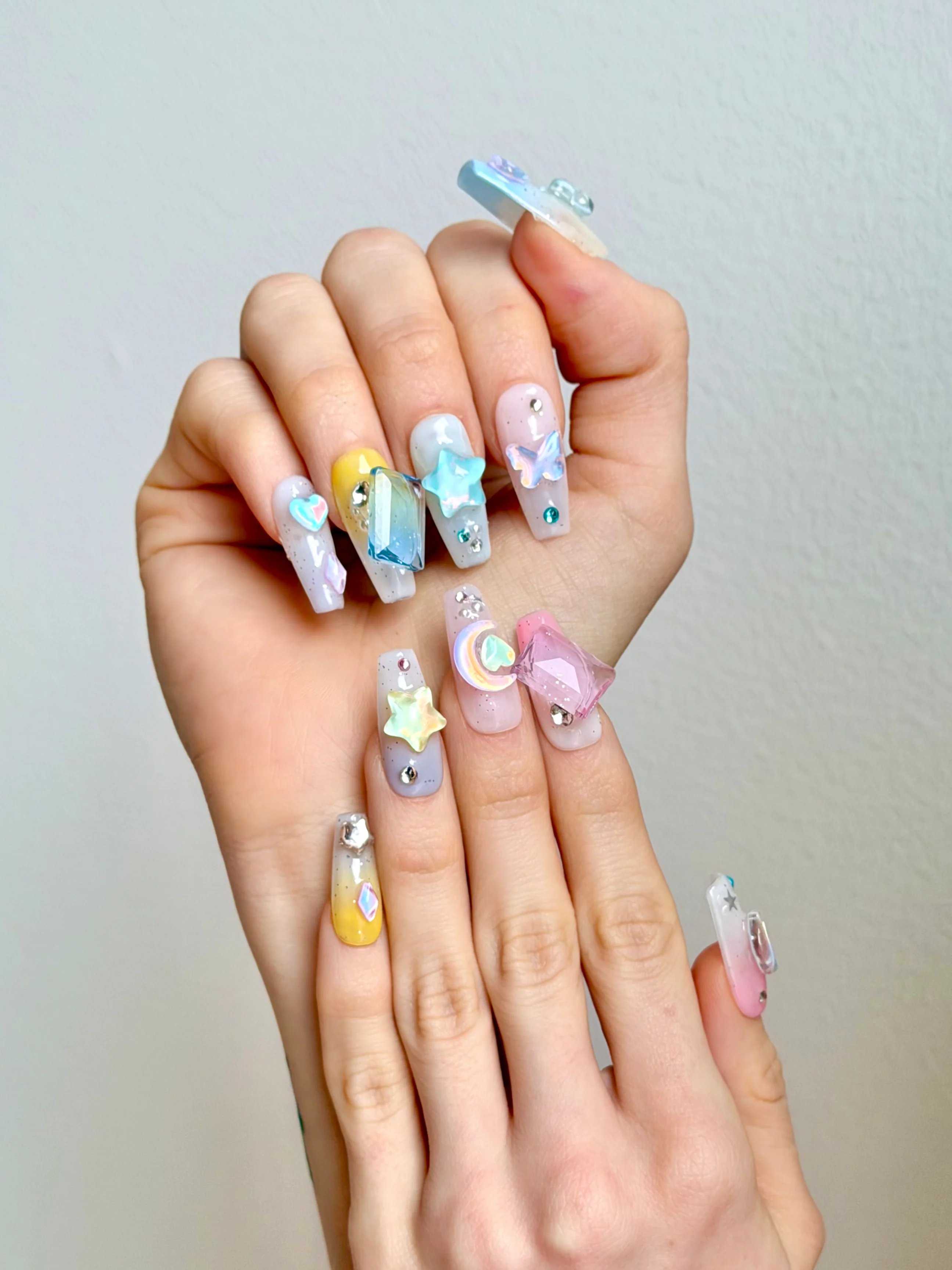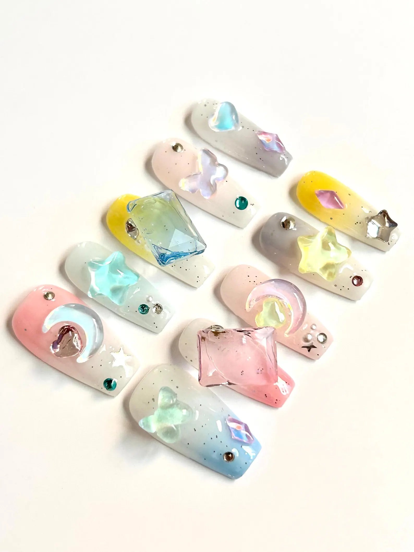 Pastel-toned nails with celestial accents including moons, stars, and oversized crystal embellishments for a cosmic fantasy look.