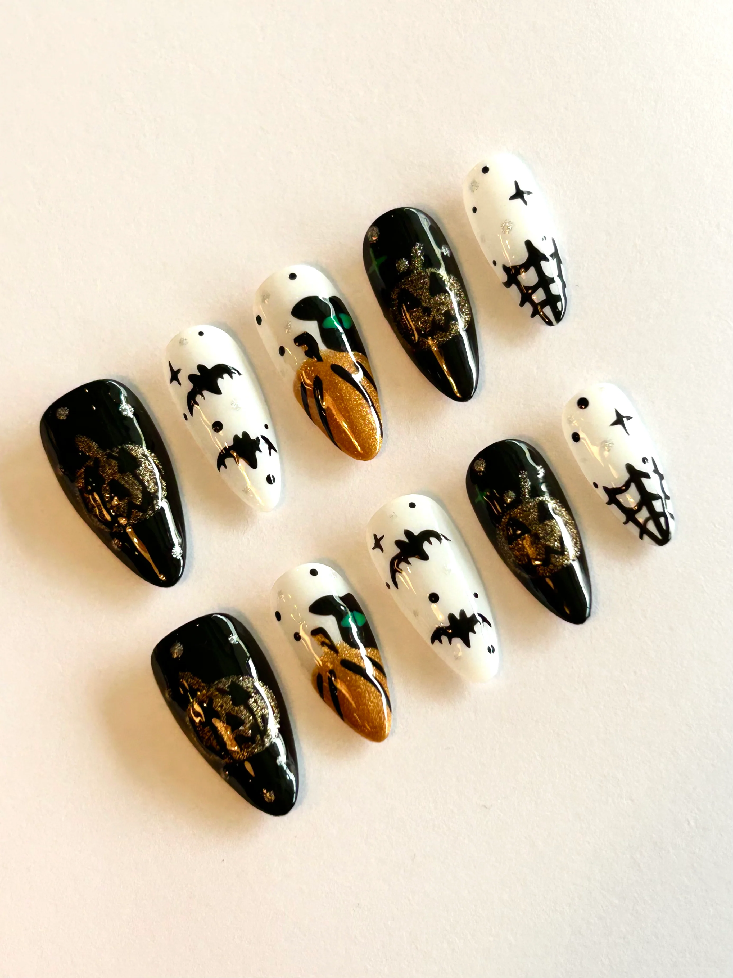 This spooky Halloween press on nail set features glossy black and white gel nails with hand-painted gold pumpkins, flying bats, and spiderweb accents. The shimmering metallic details and high-contrast gothic design make these reusable gel nails the perfect statement manicure for October, Halloween parties, cosplay, and fall nail trends.