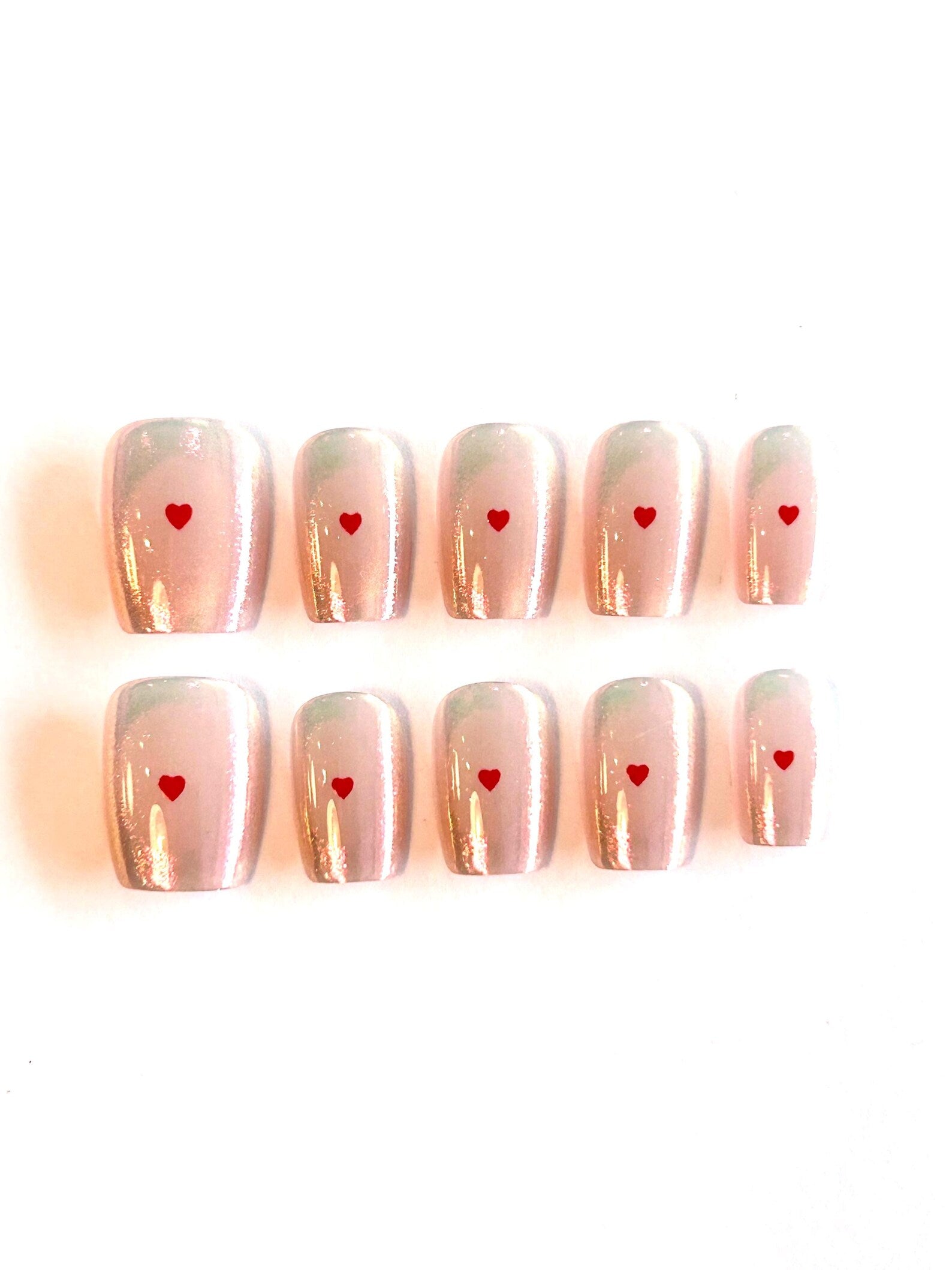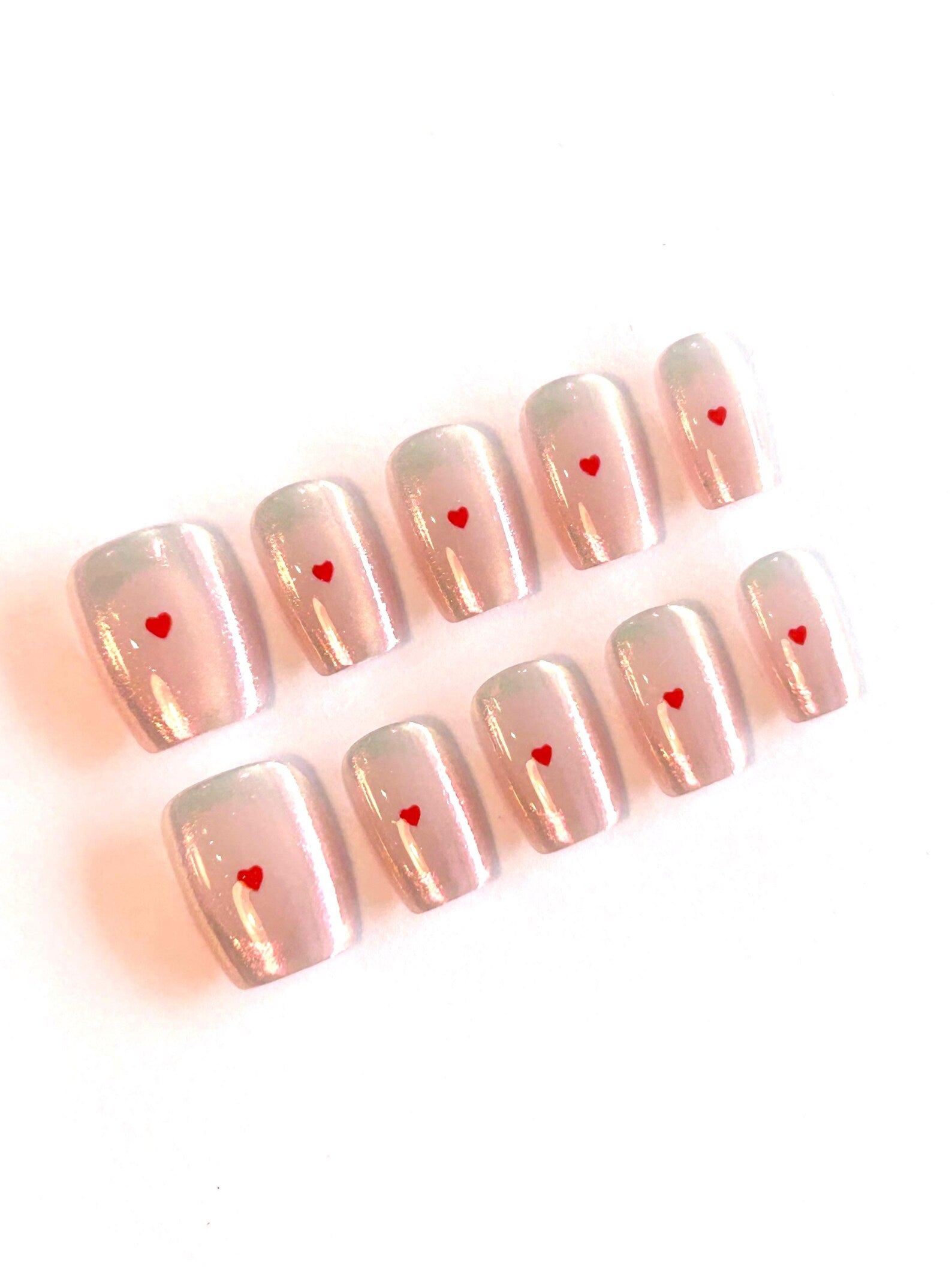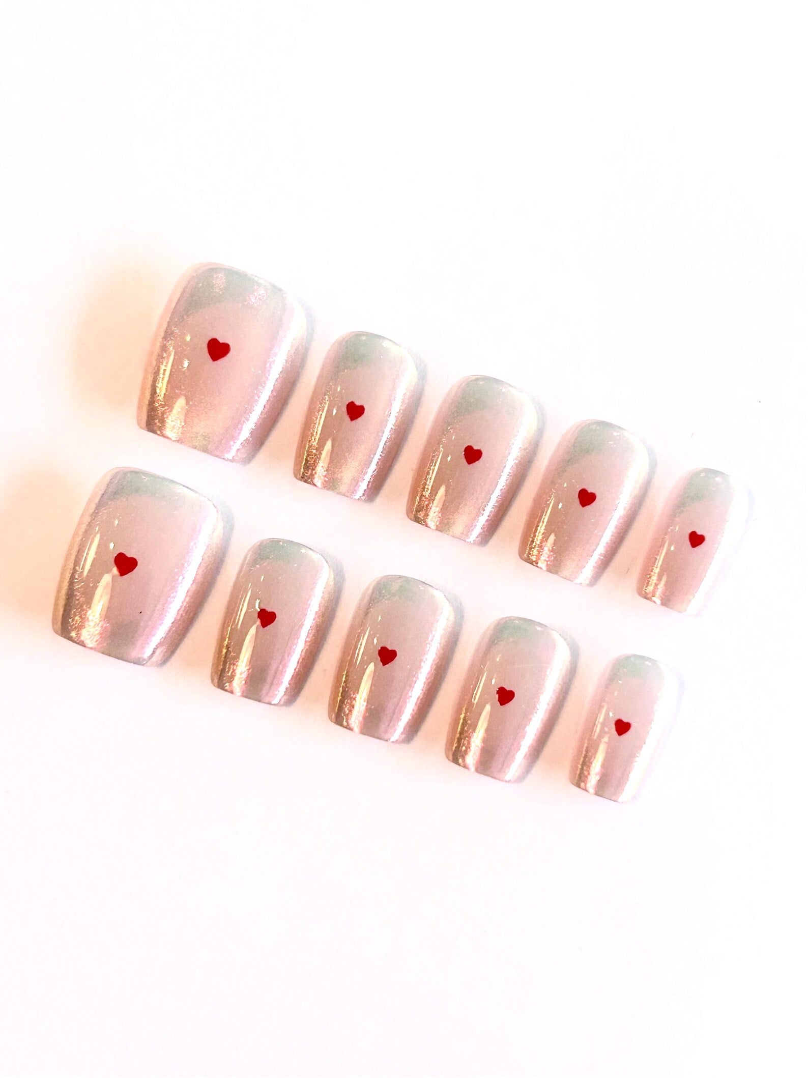 A pearly cat-eye gel press on set with a glazed, chrome-sheen finish and tiny red heart accents. Lightweight, reusable press on nails that deliver salon-quality shine—perfect Valentine’s Day nails or everyday romantic gel nails .